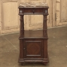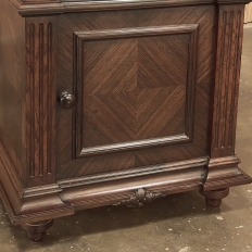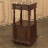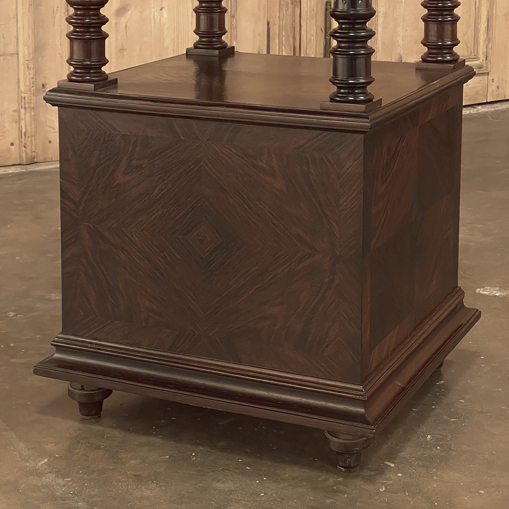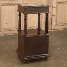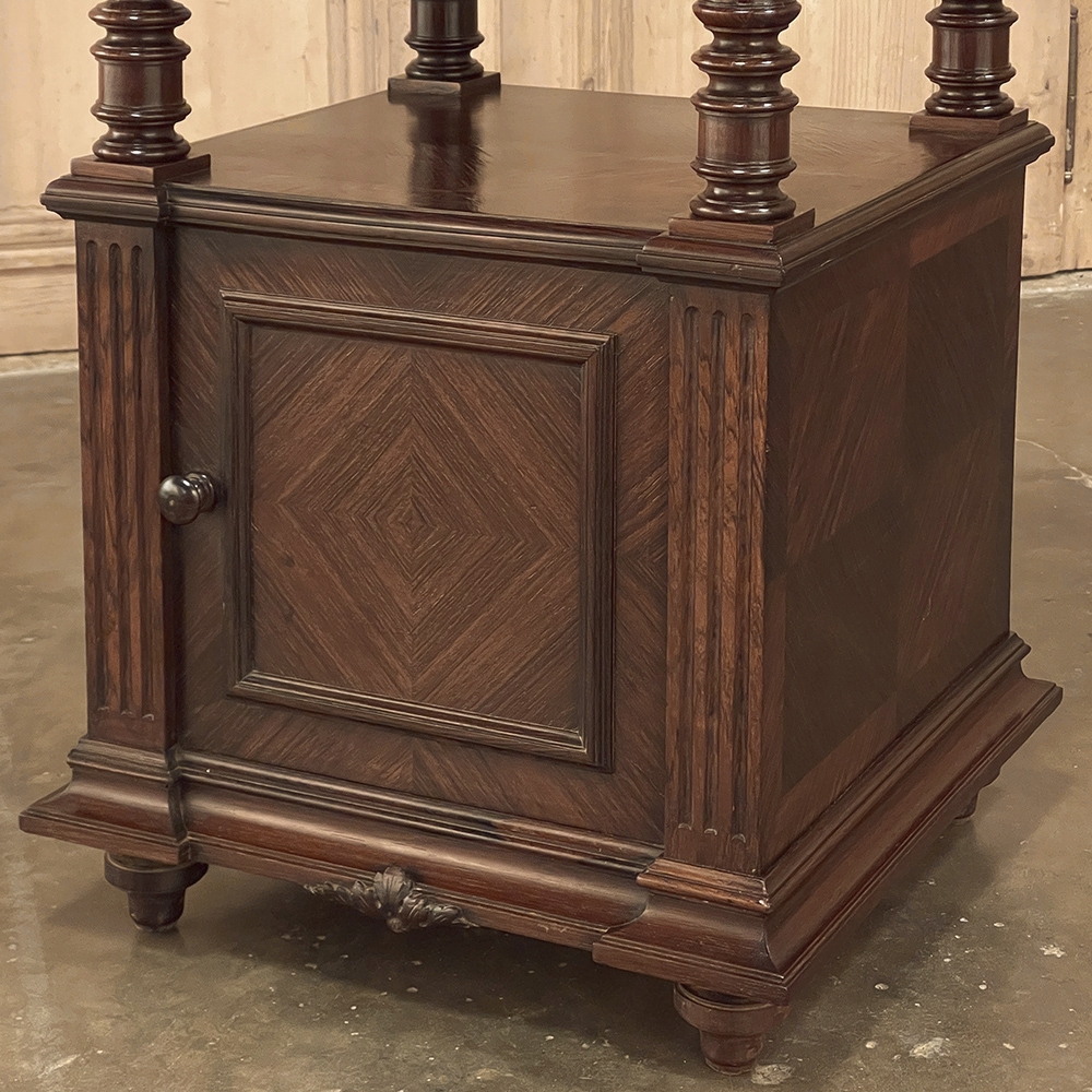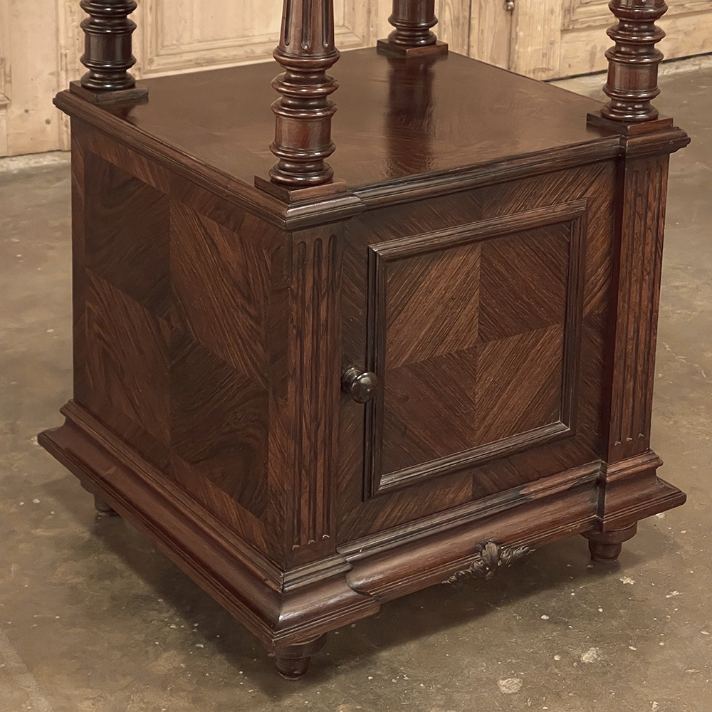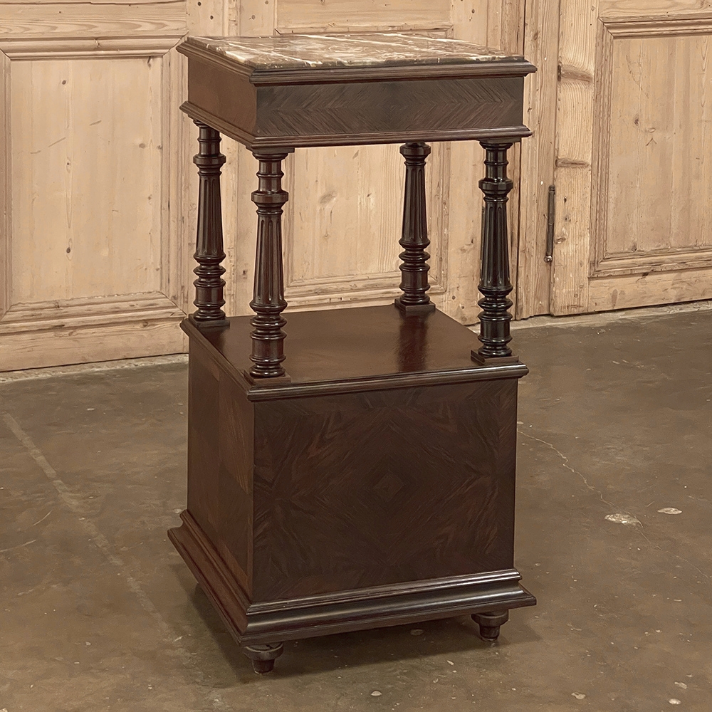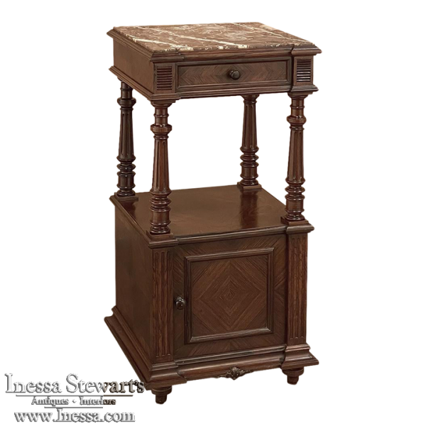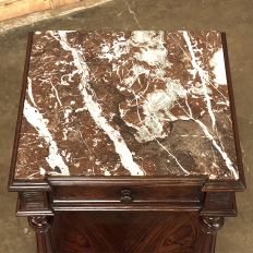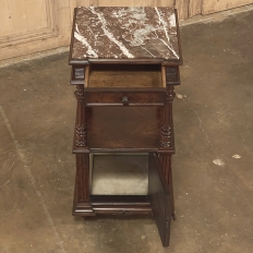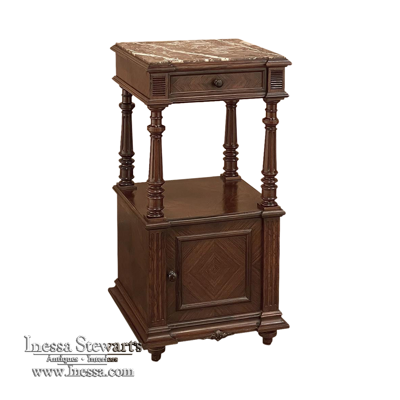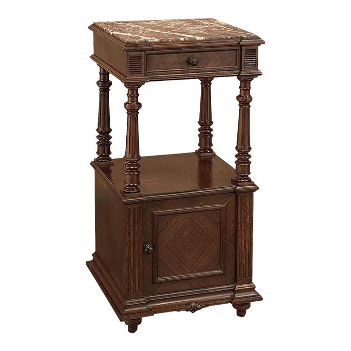 19th Century French Louis XVI Rosewood Marble Top Nightstand were crafted from what is considered the king of woods, obtained in such abundance during the late 18th and entire 19th centuries by European furniture makers that the species is protected today. The rich natural coloration and ability to last for centuries without signs of aging were its strongest points. This nightstand illustrates the point, with classical styling inspired by the ancient Greeks and Romans, including rosettes flanking the drawer, with an open space with shelf defined by four tapered and fluted columns, and lastly a cabinet below framed by fluted pilasters whose door opens to reveal a marble lined interior. Elegantly executed molding detail pervades the design, and wraps around the luxuriously veined marble top to create the perfect finishing touch!