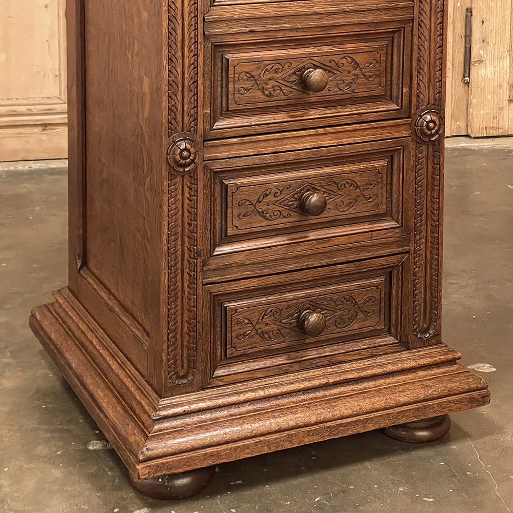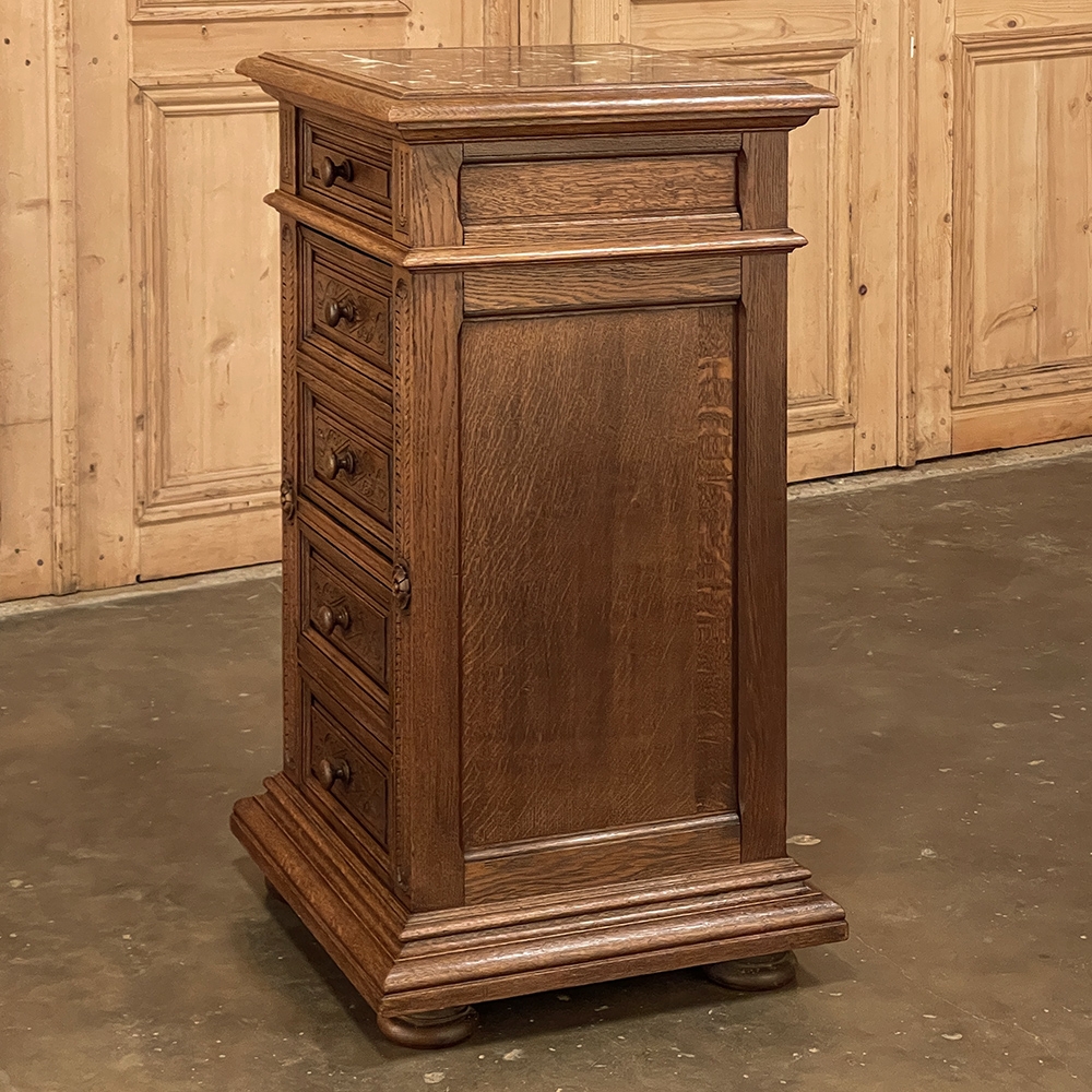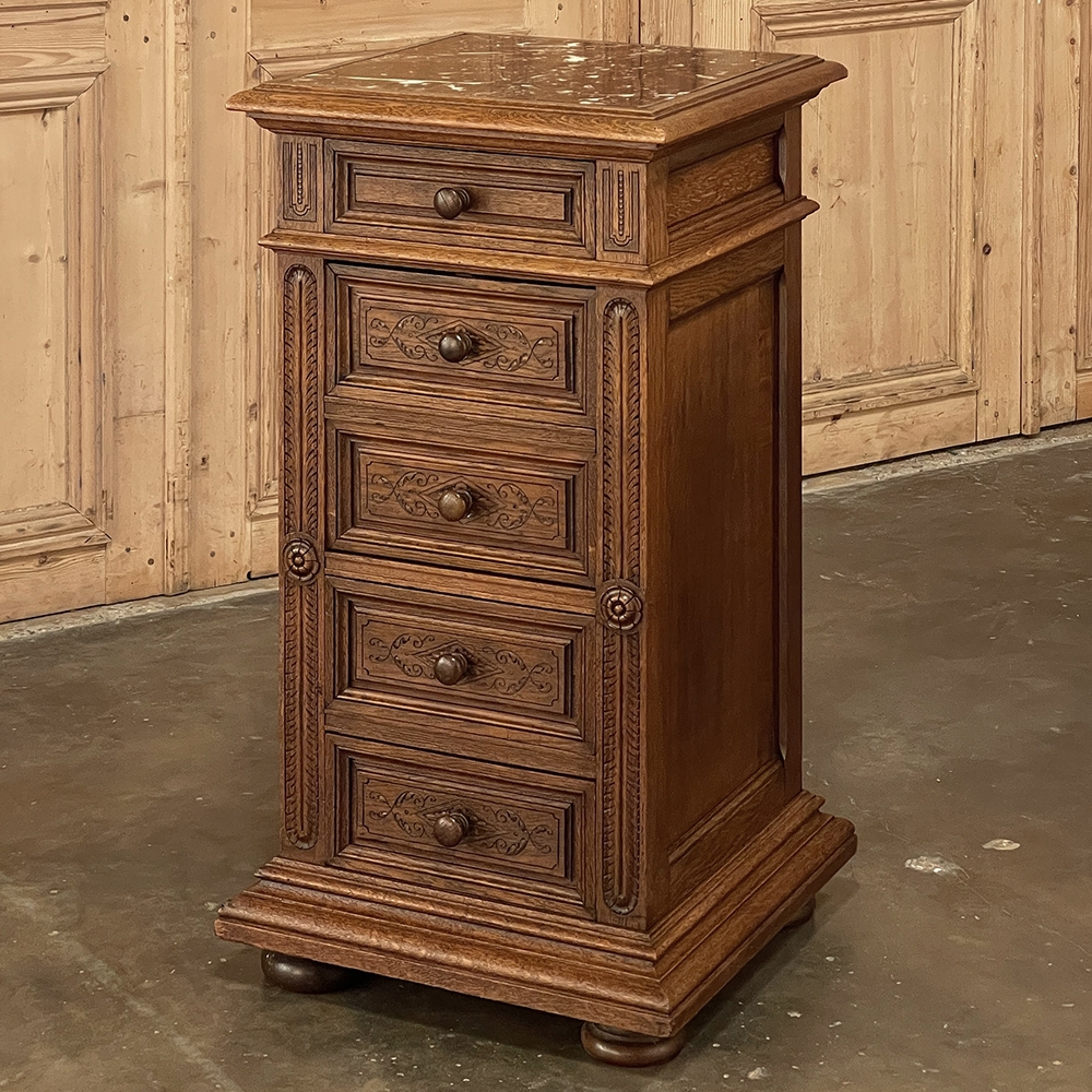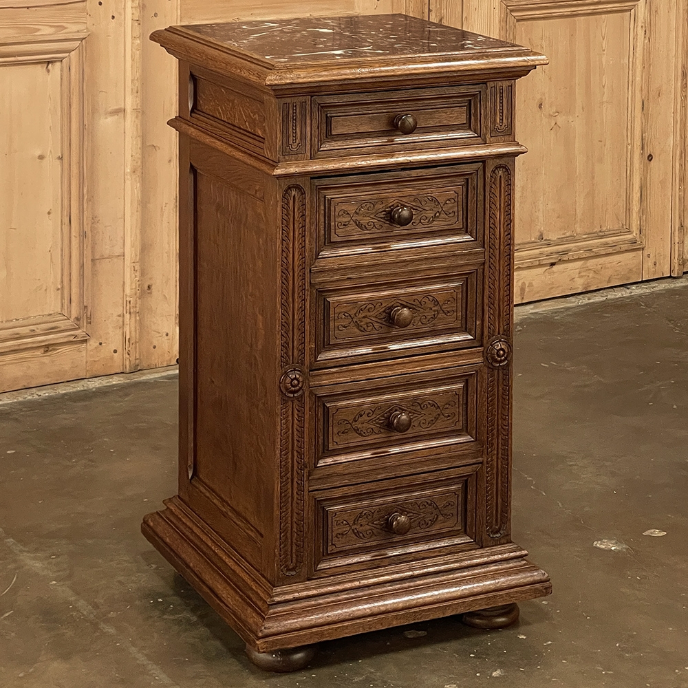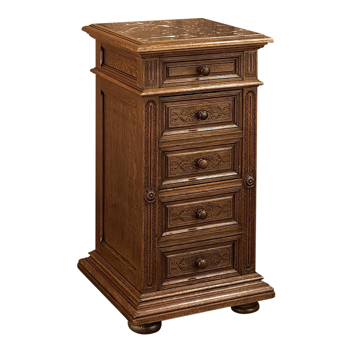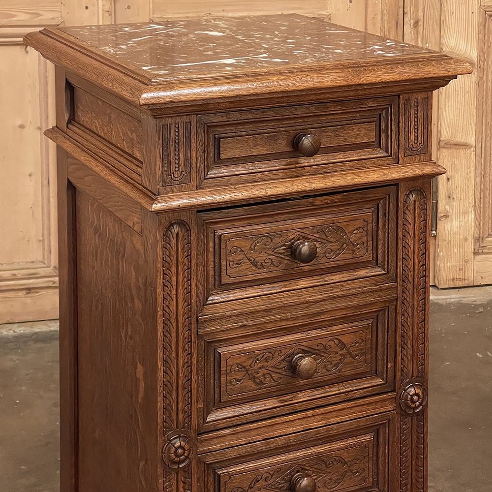 19th Century French Neoclassical Marble Top Nightstand was fashioned from solid oak, and features tailored architecture embellished with fletching and rosettes on the cornerposts, and intaglio scrollwork on all the front facade panels. The top panel and two bottom panels open to reveal drawers, with the other two combining to create a drop-down cabinet door. Bold molding detail provides excellent accent, with a multi-tiered base above bun feet below, and a separator trim below the top drawer, and finally more multi-tiered molding around the luxuriously veined marble top.