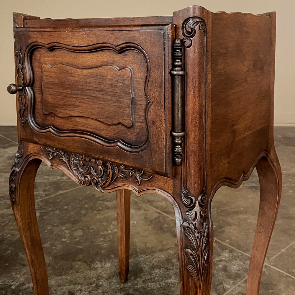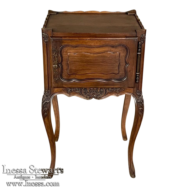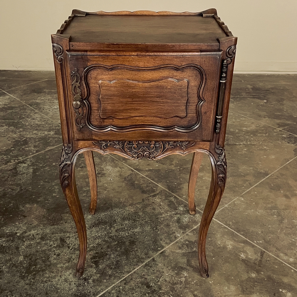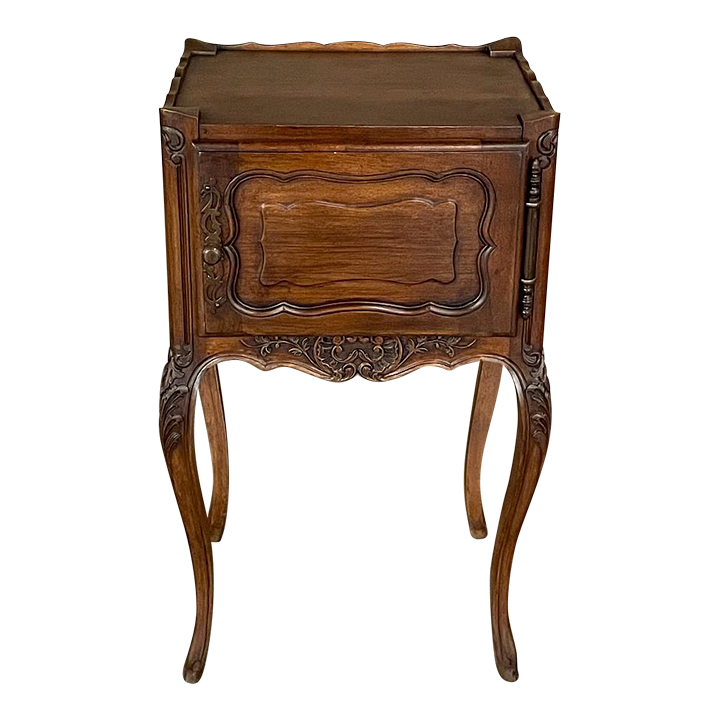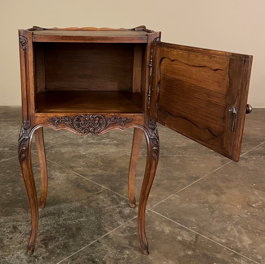 SaleAntique Country French Walnut Nightstand ~ End Table was fashioned from solid sumptuous walnut, and features a classic provincial charm that cannot be denied! A subtle scalloped edge surrounds the top and helps keep things anchored there. The rounded corners feature a modicum of carved detail, and lead the eyes down to the four cabriole legs, the front two also showing carved detail in the form of acanthus plumes. The front legs also provide a framework for the scrolled apron festooned with shell, floral and foliate carvings. The door immediately above is comprised of graceful French scrolls on the frame and raised panel accentuated by a pierced ferrure and pull on the left, with a beefy barrel hinge on the right, all executed in steel for the perfect finishing touch. The cabinet door opens to reveal surprising storage as an added bonus! Ideal as a lamp table in a cozy seating group, or as the perfect bedside companion.
