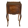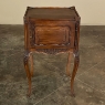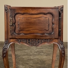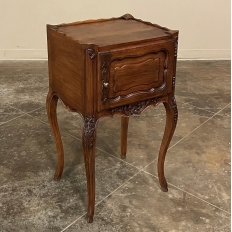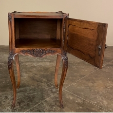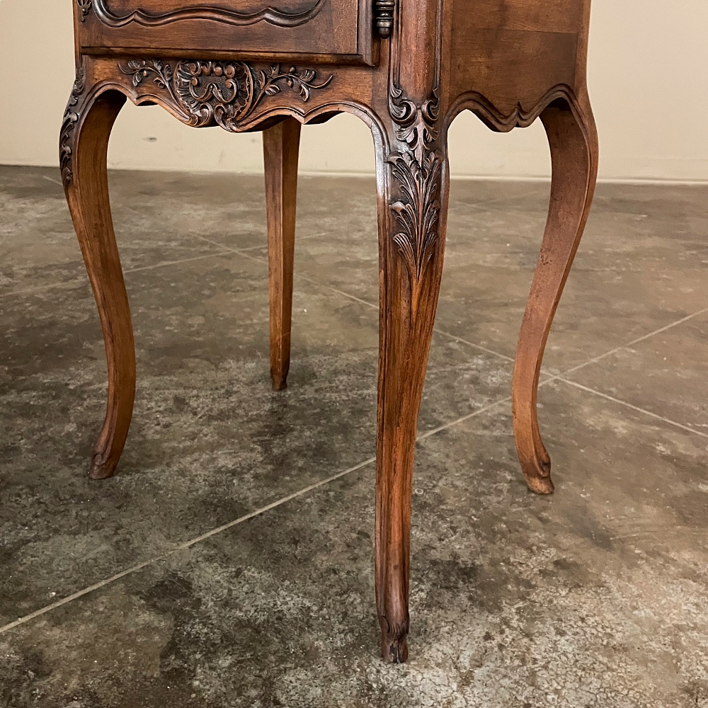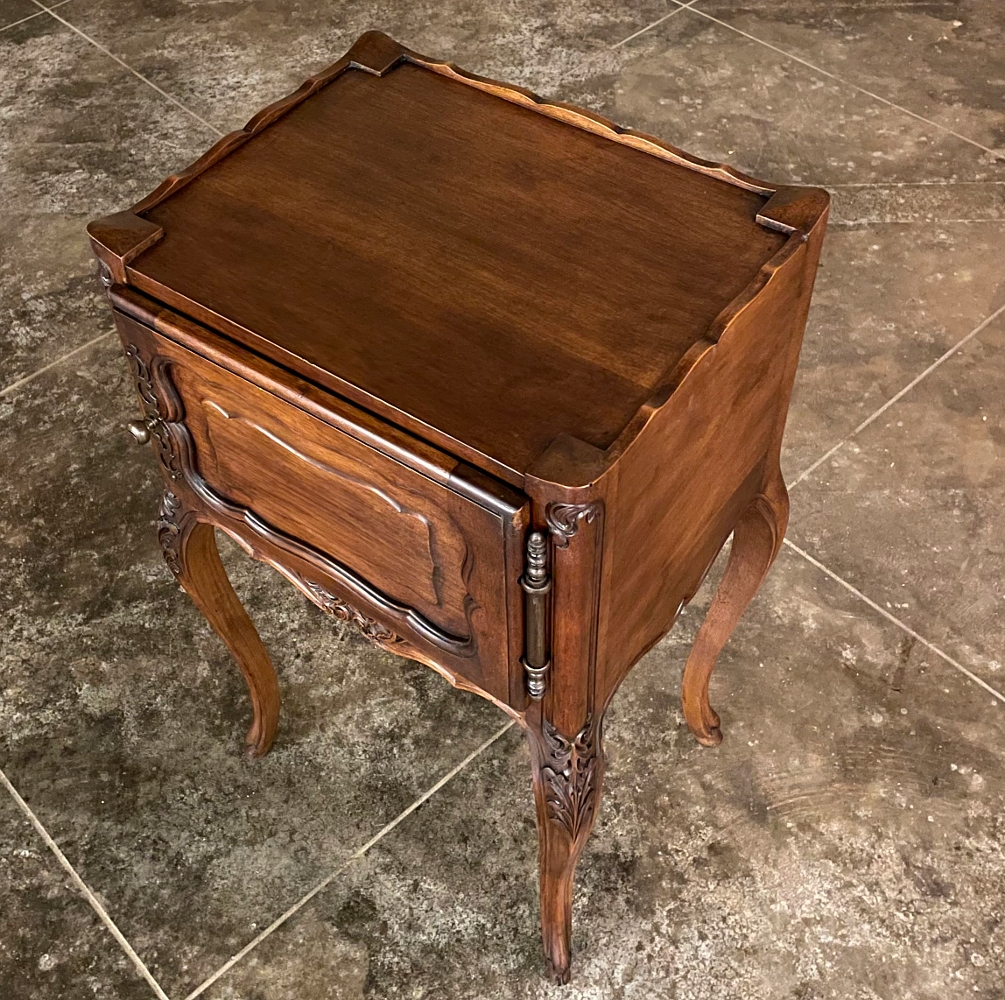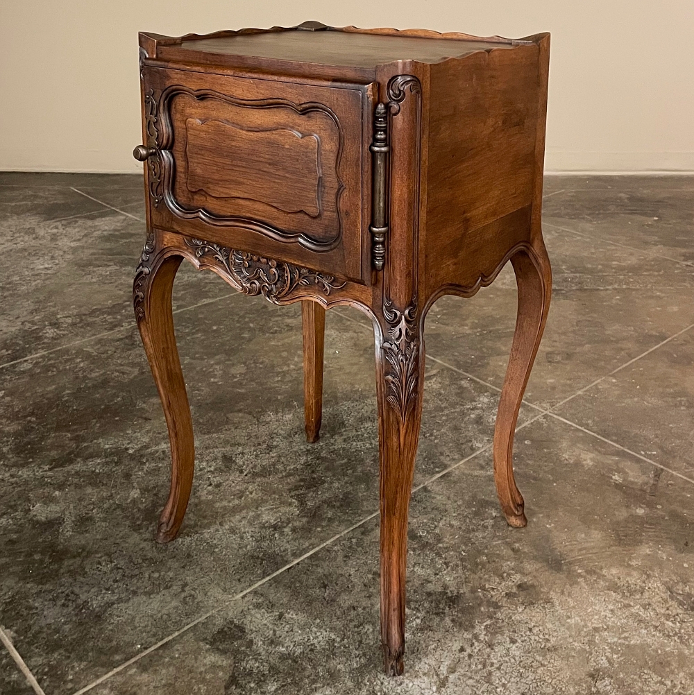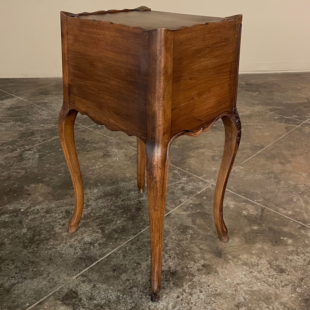 SaleAntique Country French Walnut Nightstand ~ End Table was fashioned from solid sumptuous walnut, and features a classic provincial charm that cannot be denied! A subtle scalloped edge surrounds the top and helps keep things anchored there. The rounded corners feature a modicum of carved detail, and lead the eyes down to the four cabriole legs, the front two also showing carved detail in the form of acanthus plumes. The front legs also provide a framework for the scrolled apron festooned with shell, floral and foliate carvings. The door immediately above is comprised of graceful French scrolls on the frame and raised panel accentuated by a pierced ferrure and pull on the left, with a beefy barrel hinge on the right, all executed in steel for the perfect finishing touch. The cabinet door opens to reveal surprising storage as an added bonus! Ideal as a lamp table in a cozy seating group, or as the perfect bedside companion.
