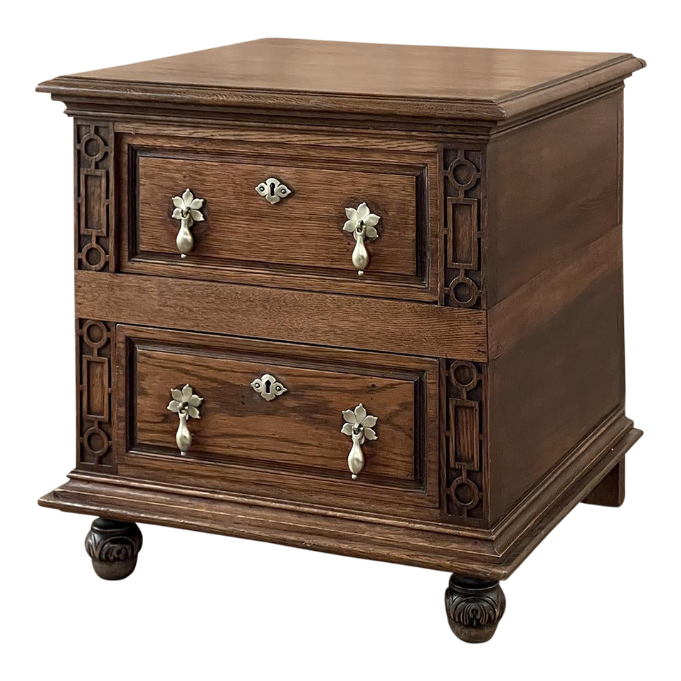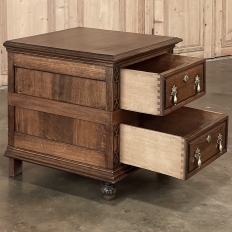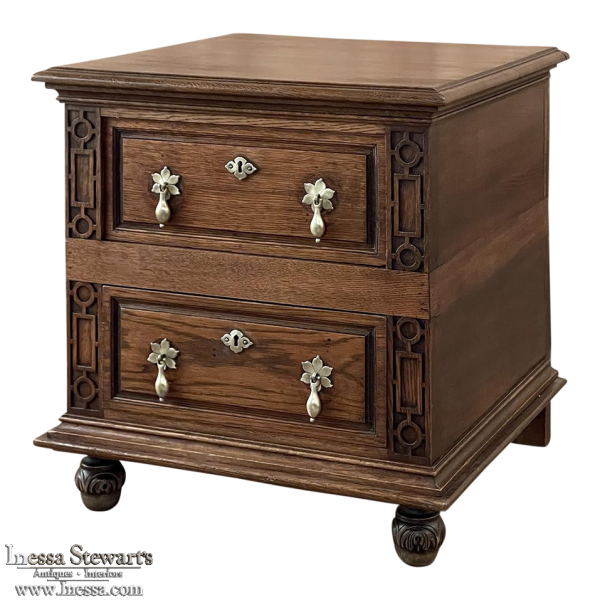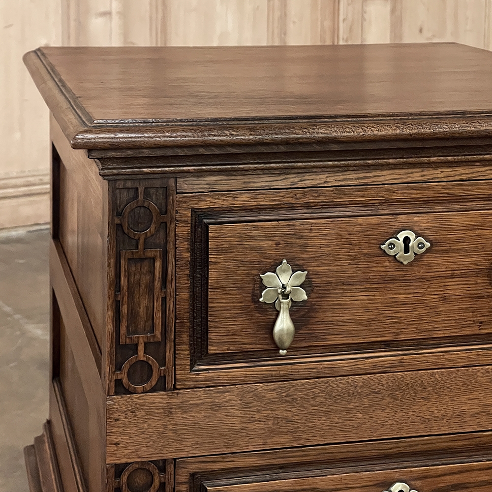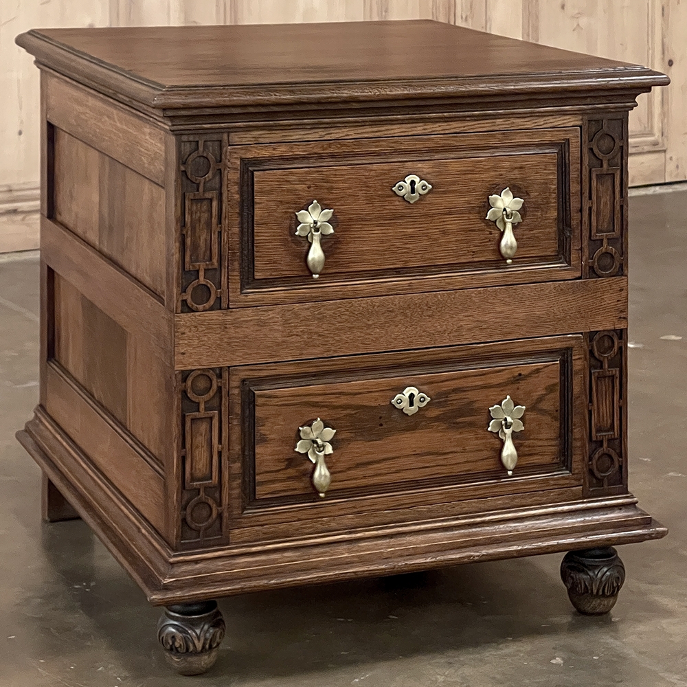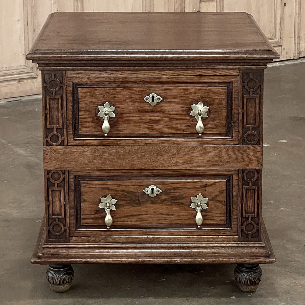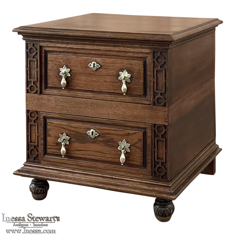 Antique Dutch Nightstand ~ Chest of Drawers is the perfect size for the 21st century bedroom! Almost two feet deep and just as wide, it will hold a lot more inside the two spacious drawers as well as provide a larger surface than most for your lamp, docking station alarm clock, paraphernalia and more. Hand-crafted from solid oak using dovetail joints and fine craftsmanship techniques, it boasts a tailored architecture with geometric molding designs on the cornerposts flanking the drawers, which have been fitted with brass pendant pulls and key guards. Turned urn-shaped feet provide support. The stacked appearance of the design encircles all four sides creating an interesting look. A great choice as a side table for your most comfortable chair, as well!