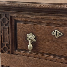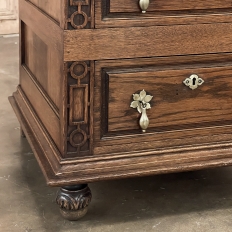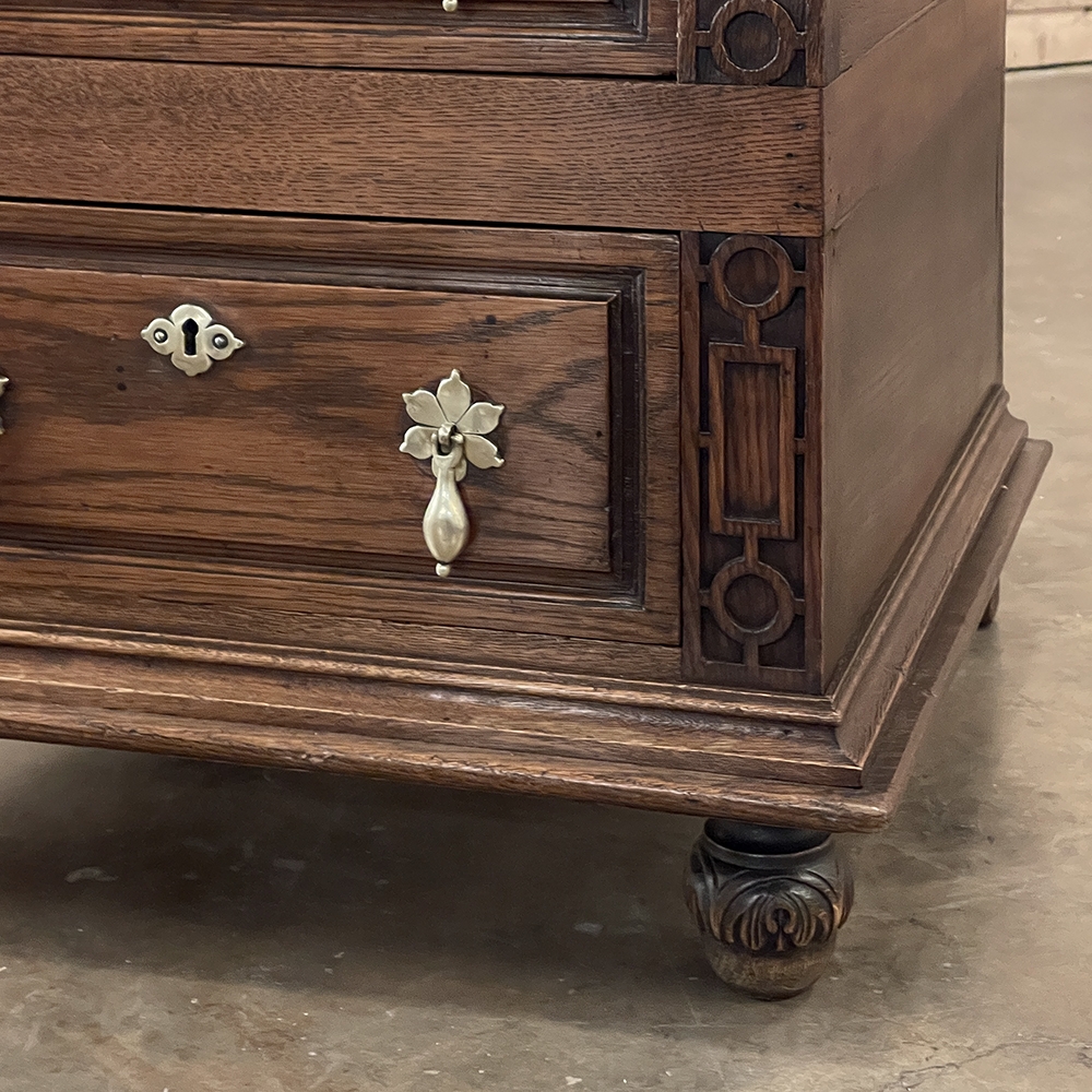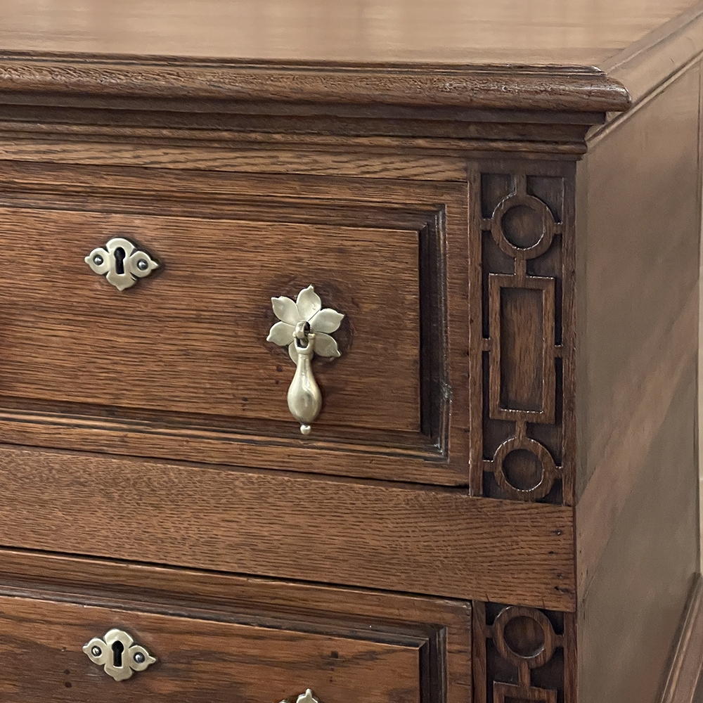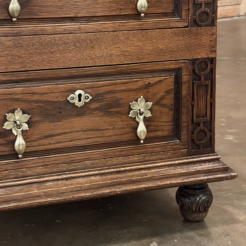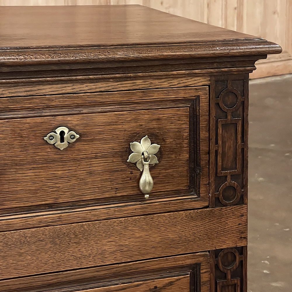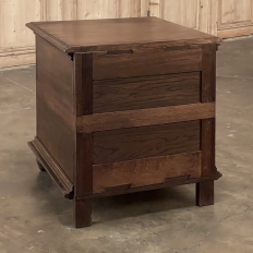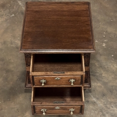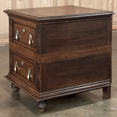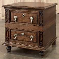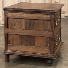 Antique Dutch Nightstand ~ Chest of Drawers is the perfect size for the 21st century bedroom! Almost two feet deep and just as wide, it will hold a lot more inside the two spacious drawers as well as provide a larger surface than most for your lamp, docking station alarm clock, paraphernalia and more. Hand-crafted from solid oak using dovetail joints and fine craftsmanship techniques, it boasts a tailored architecture with geometric molding designs on the cornerposts flanking the drawers, which have been fitted with brass pendant pulls and key guards. Turned urn-shaped feet provide support. The stacked appearance of the design encircles all four sides creating an interesting look. A great choice as a side table for your most comfortable chair, as well!