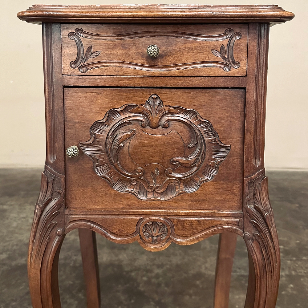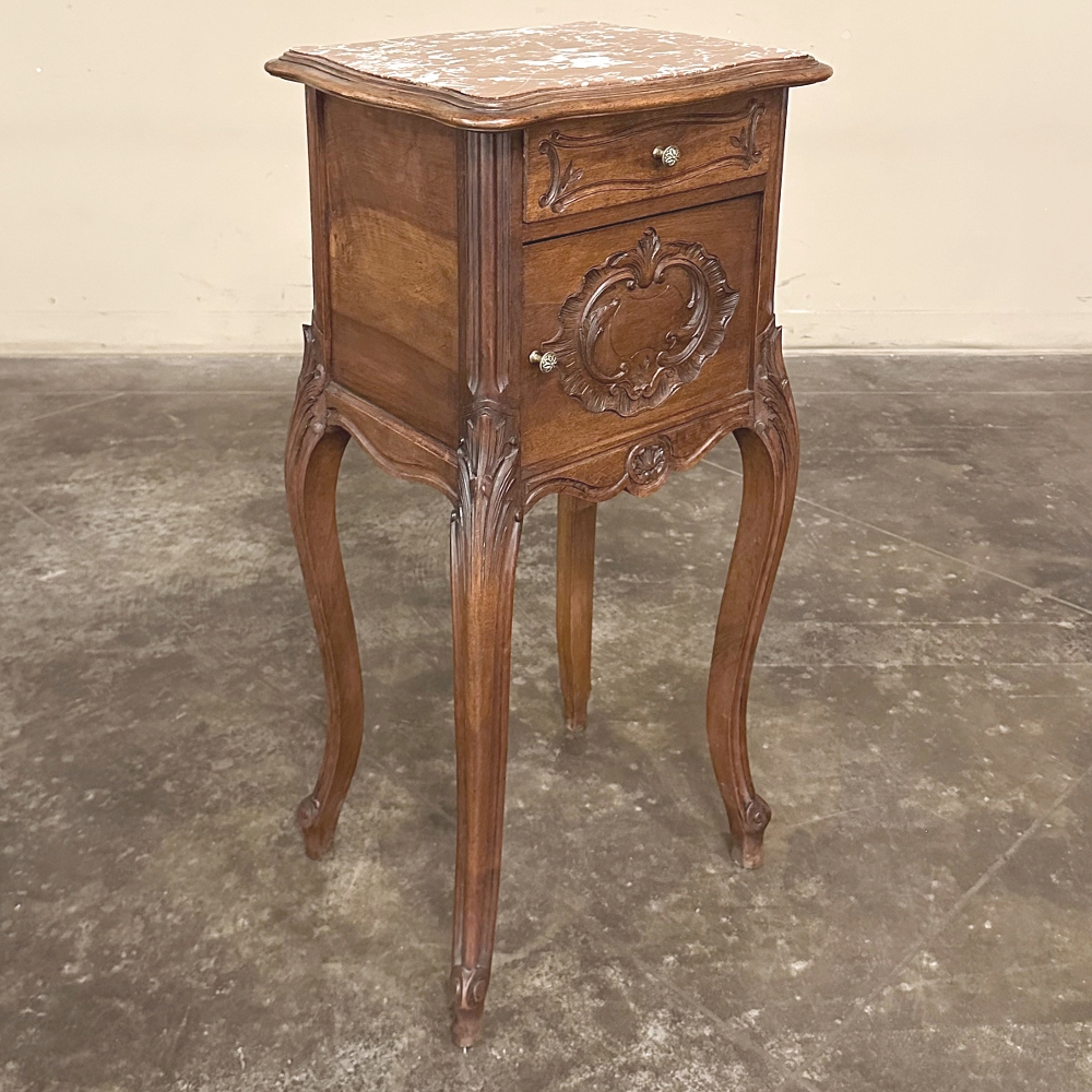 SaleAntique French Louis XV Walnut Marble Top Nightstand ~ End Table will make the perfect companion piece. Topped with luxuriously veined marble for a carefree yet elegant surface, it was constructed of solid walnut, with cast brass knobs opening the single drawer and single cabinet door, the latter of which opens to reveal a porcelain-lined interior. Four graceful cabriole legs provide support, and accents of stylized shell and foliate motifs are carved right into the walnut for a lasting and beautiful expression of the cabinetmaker's art.