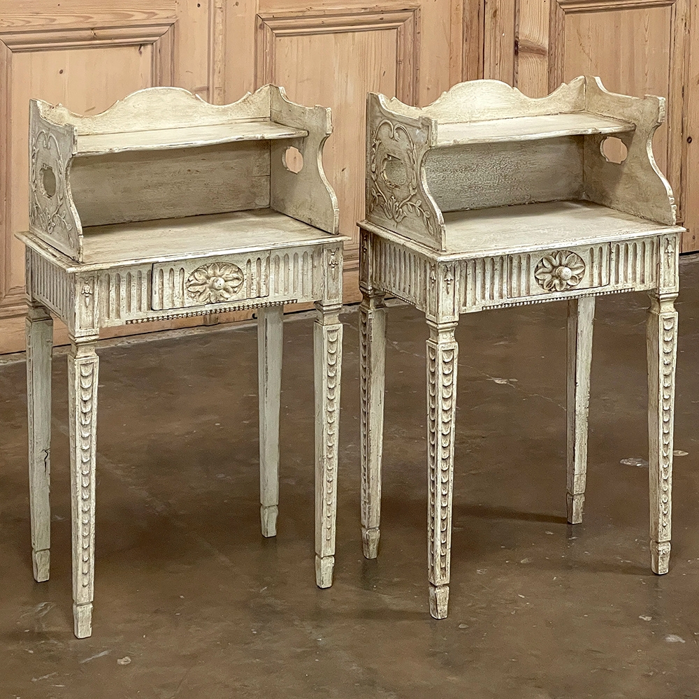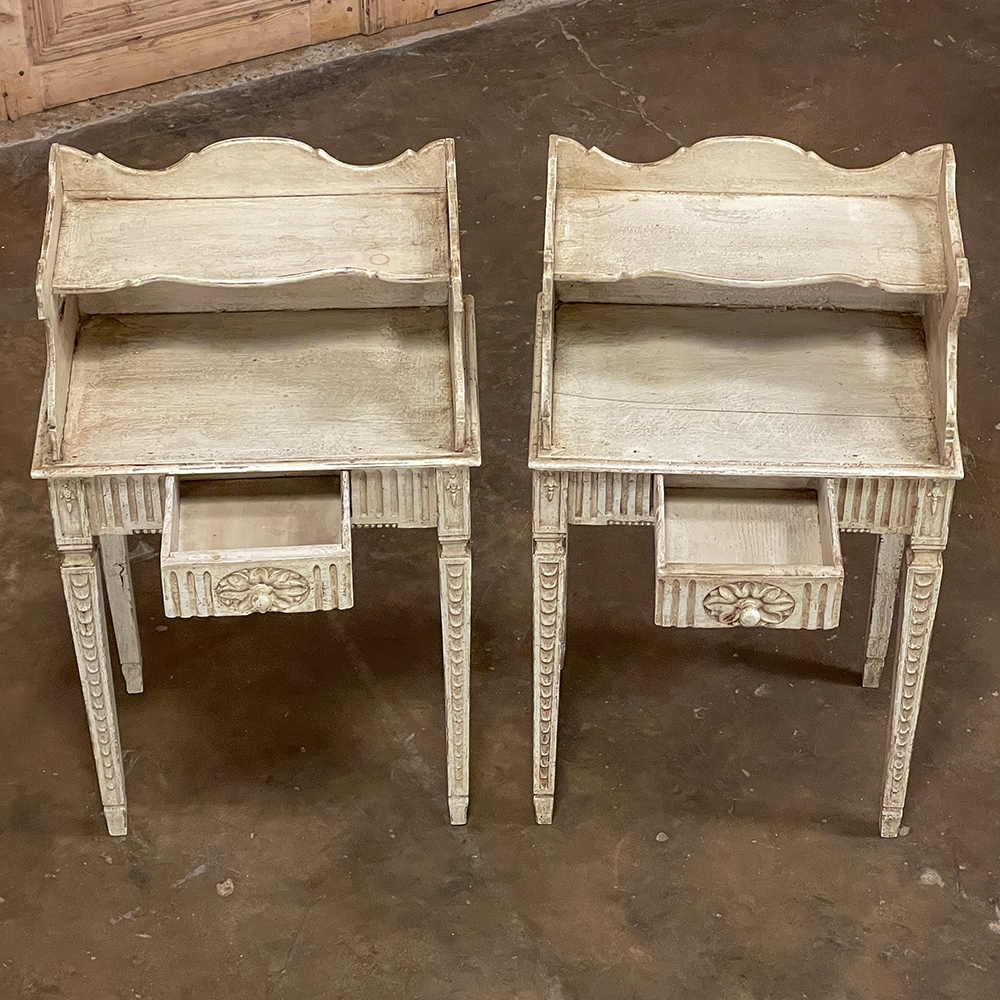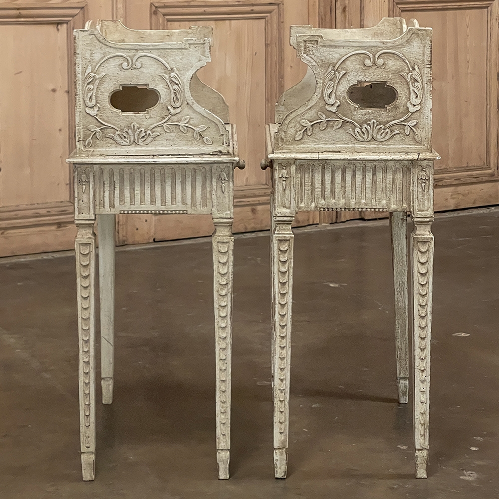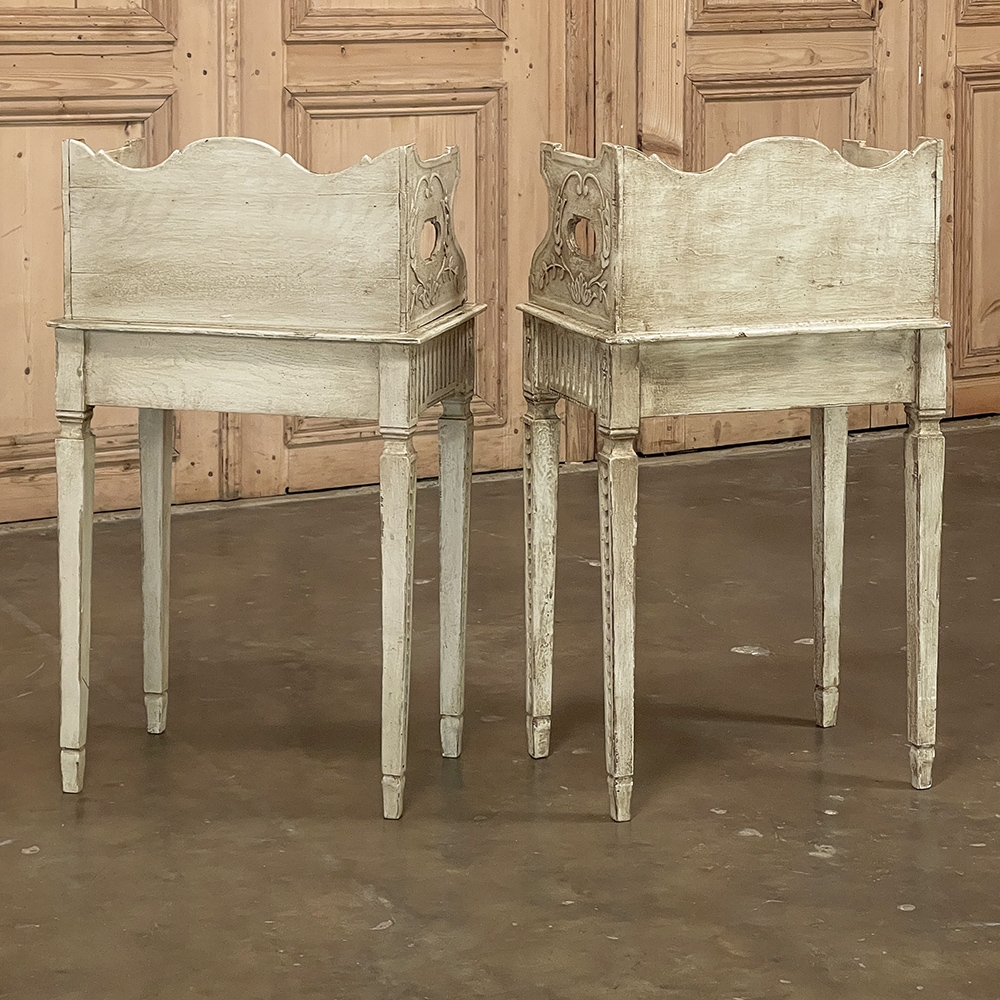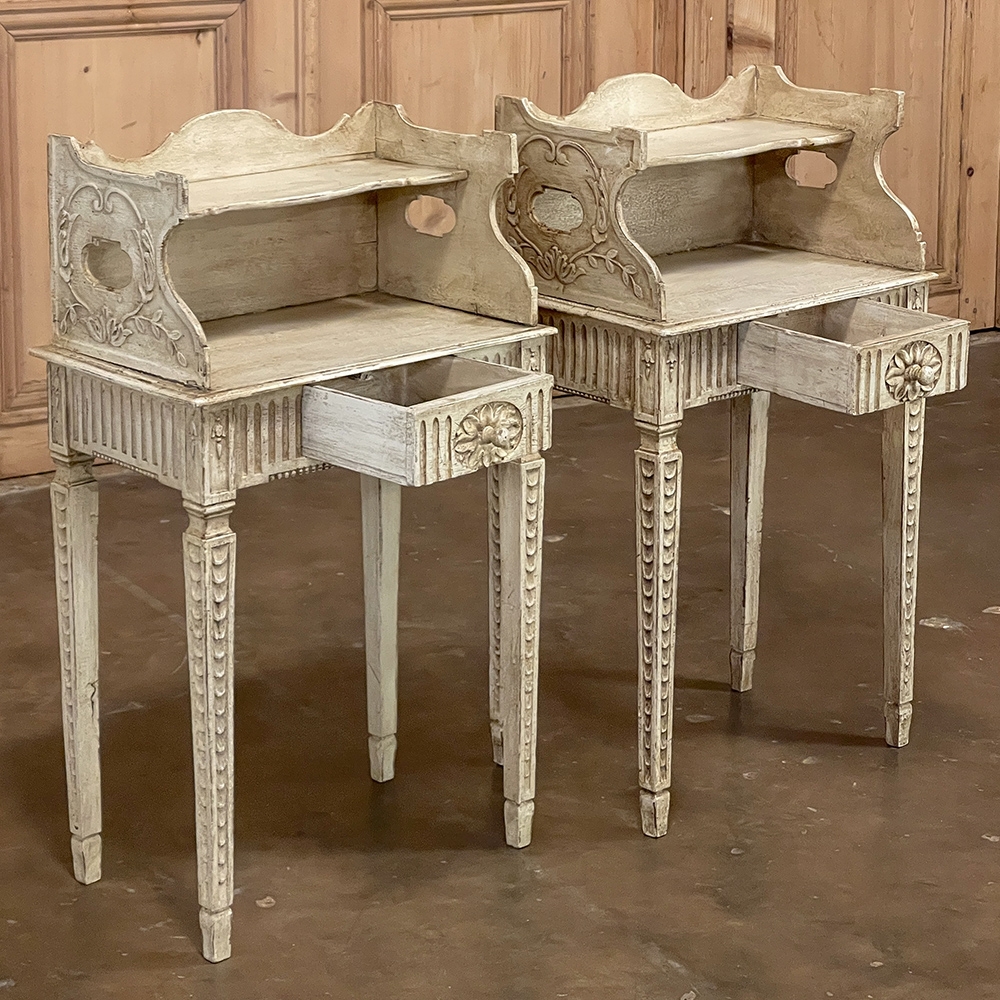 Pair 19th Century Country French Louis XVI Painted Nightstands is a charming example of the combination of classical architecture and rustic French charm! A wraparound backsplash encompasses a candle shelf above, and encloses the main surface to keep things in place. The sides are beautifully carved and pierced with an oval which creates a handle effect, with an undulating rail created in the design that also protects the candle shelf. The casework below consists of fluting on all three sides, with a drawer in the middle, centered with a flower motif and a pull knob. Four tapered legs provide support, each carved with Greek coin overlay. The painted finish has achieved a lovely patina over the decades, and enhances the fine carved detail to magnify the visual allure.