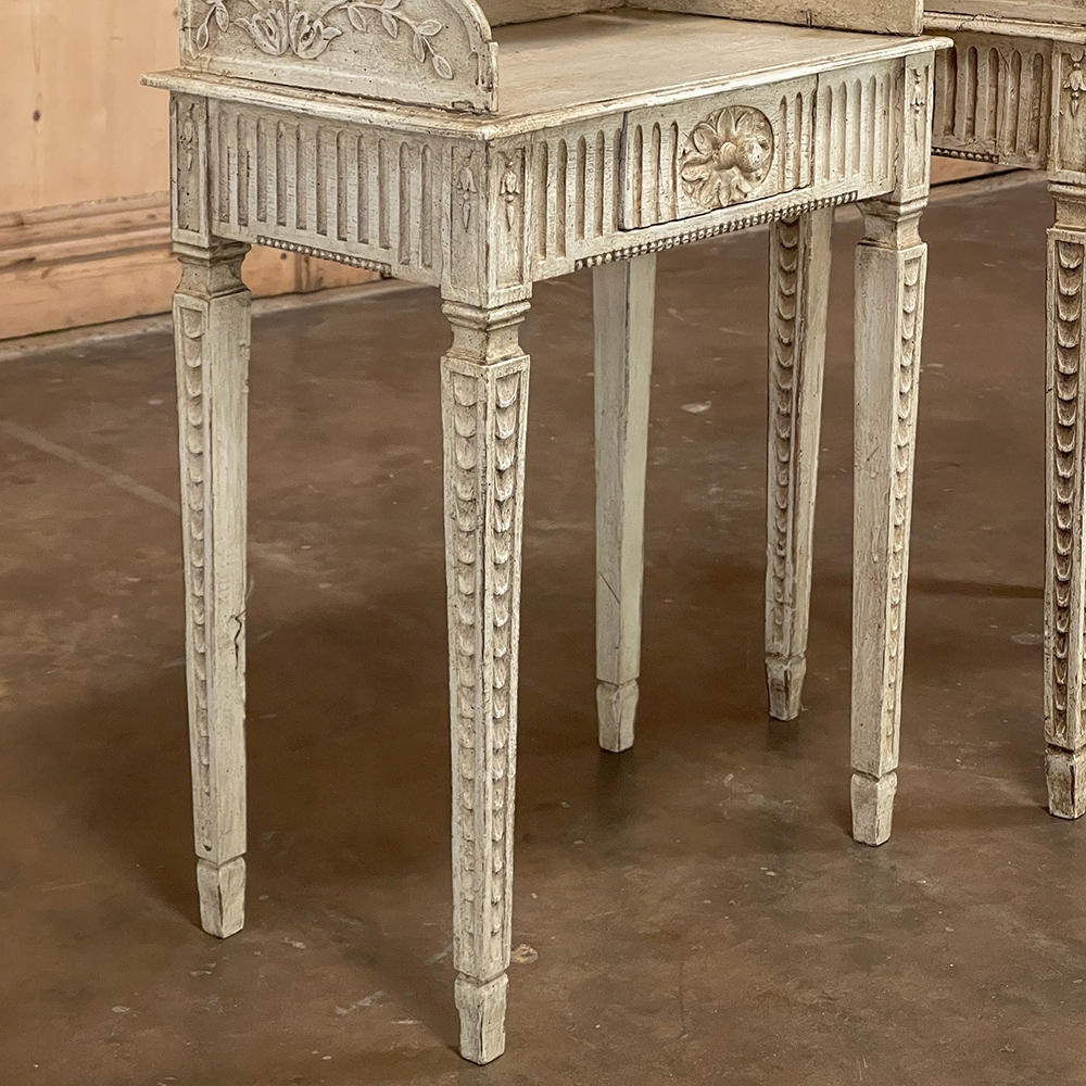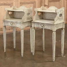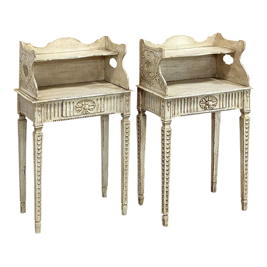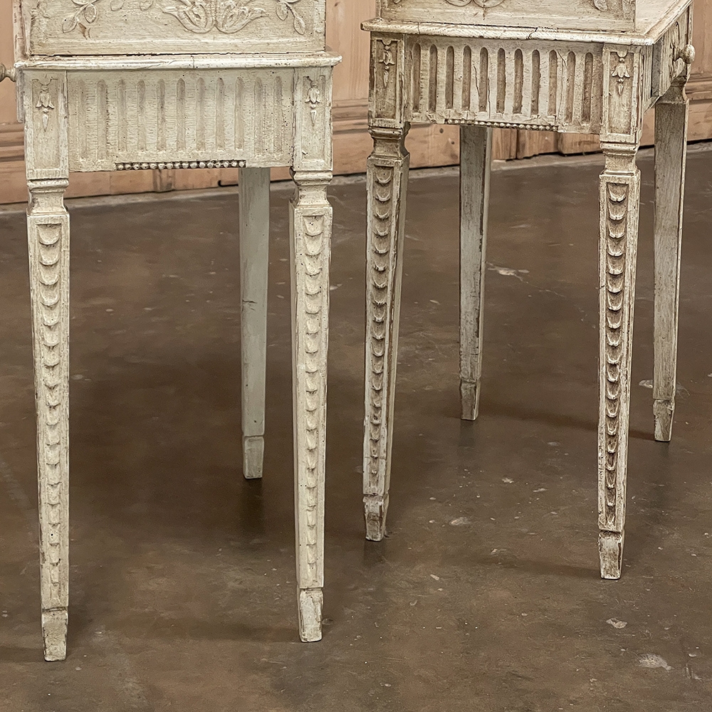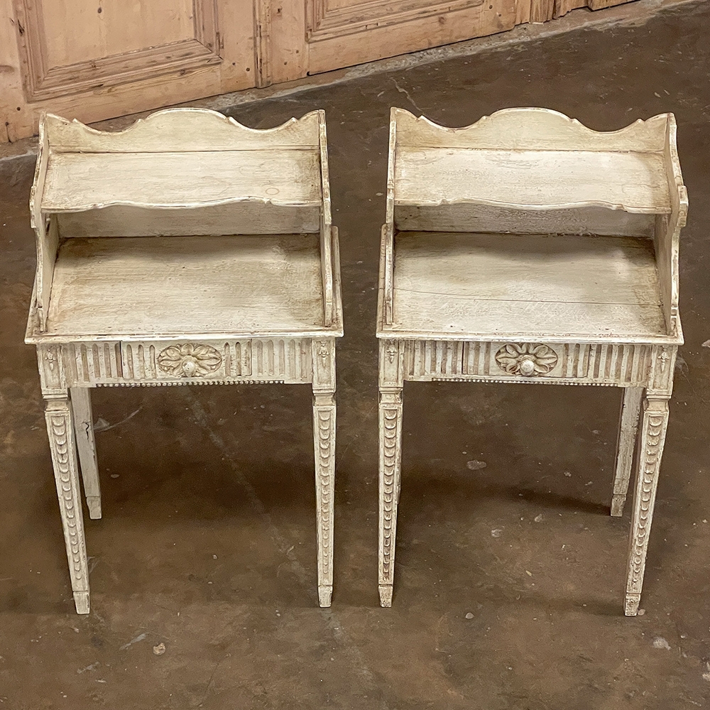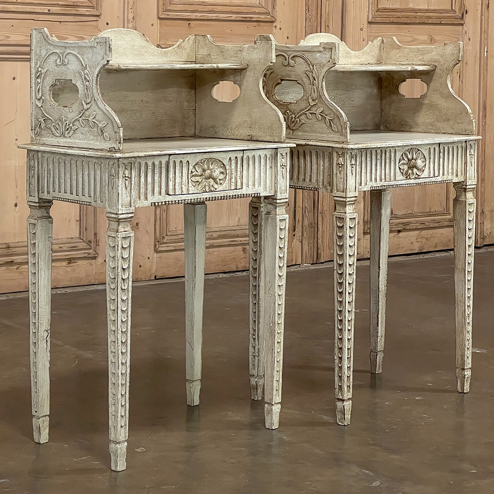 Pair 19th Century Country French Louis XVI Painted Nightstands is a charming example of the combination of classical architecture and rustic French charm! A wraparound backsplash encompasses a candle shelf above, and encloses the main surface to keep things in place. The sides are beautifully carved and pierced with an oval which creates a handle effect, with an undulating rail created in the design that also protects the candle shelf. The casework below consists of fluting on all three sides, with a drawer in the middle, centered with a flower motif and a pull knob. Four tapered legs provide support, each carved with Greek coin overlay. The painted finish has achieved a lovely patina over the decades, and enhances the fine carved detail to magnify the visual allure.