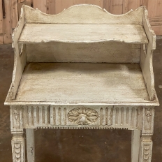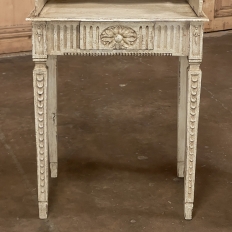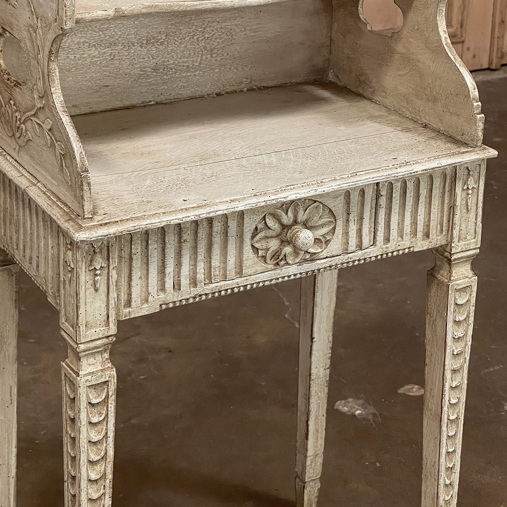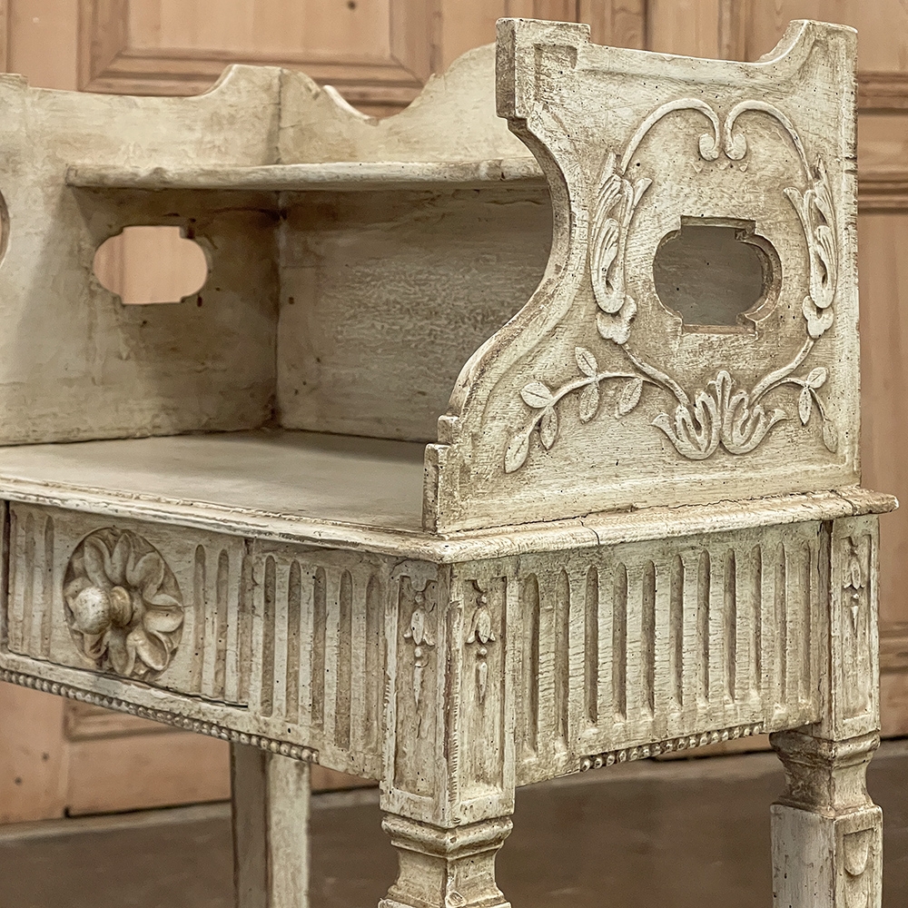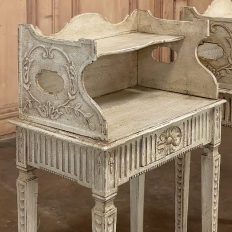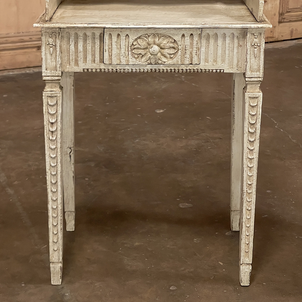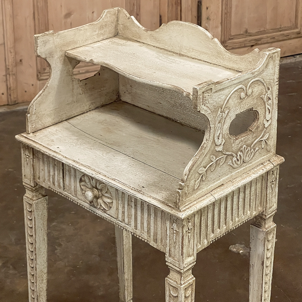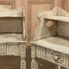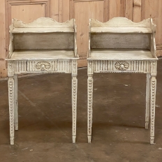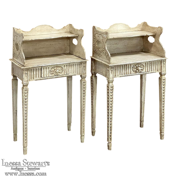 Pair 19th Century Country French Louis XVI Painted Nightstands is a charming example of the combination of classical architecture and rustic French charm! A wraparound backsplash encompasses a candle shelf above, and encloses the main surface to keep things in place. The sides are beautifully carved and pierced with an oval which creates a handle effect, with an undulating rail created in the design that also protects the candle shelf. The casework below consists of fluting on all three sides, with a drawer in the middle, centered with a flower motif and a pull knob. Four tapered legs provide support, each carved with Greek coin overlay. The painted finish has achieved a lovely patina over the decades, and enhances the fine carved detail to magnify the visual allure.