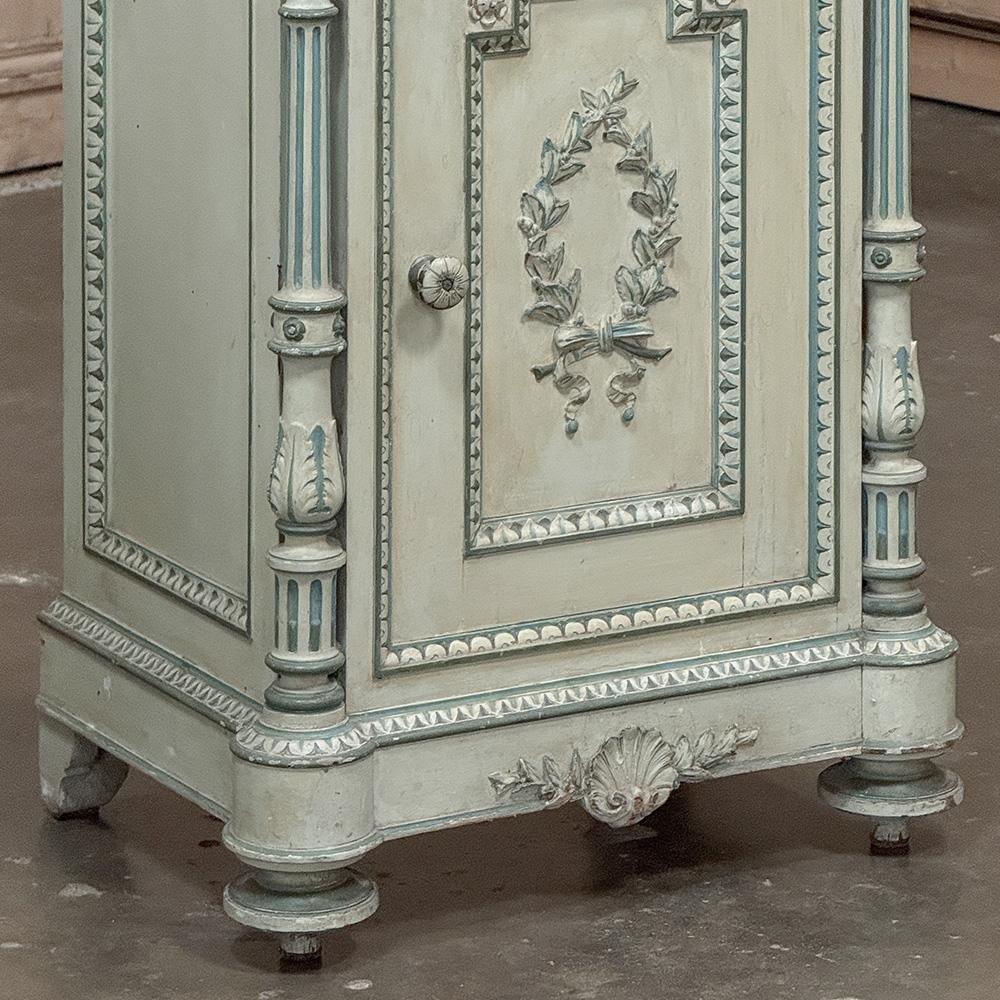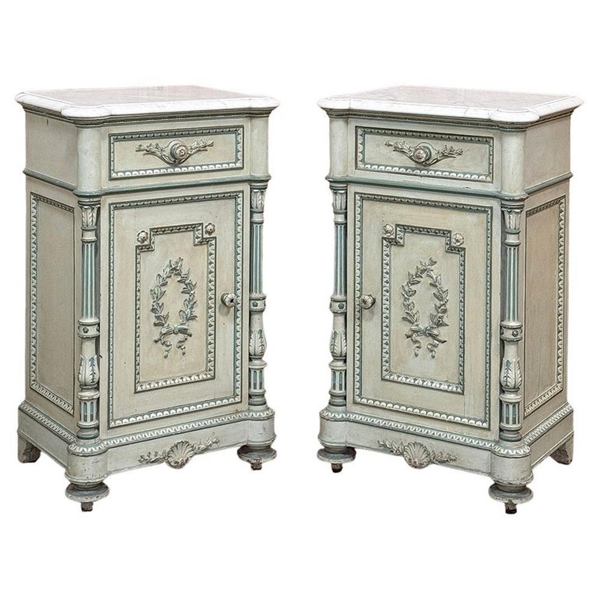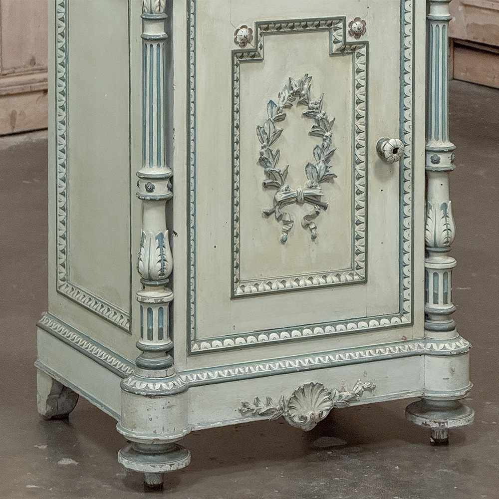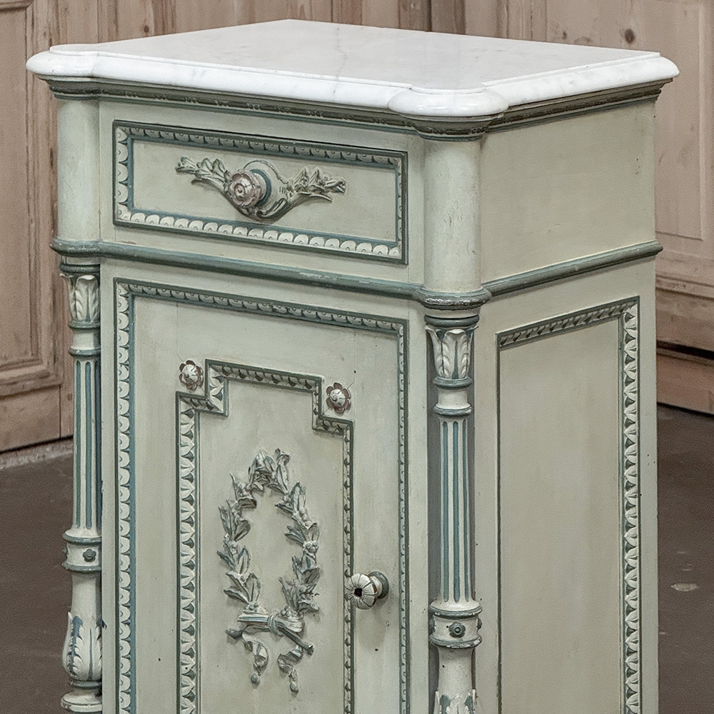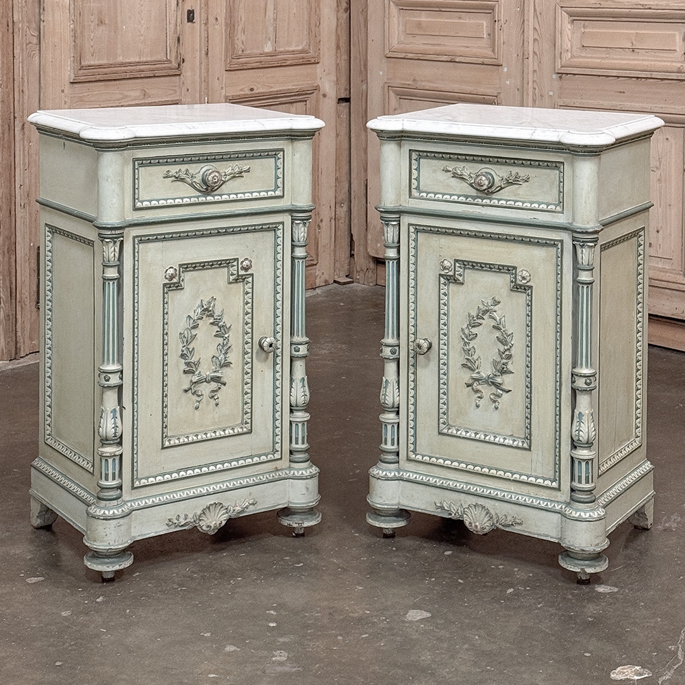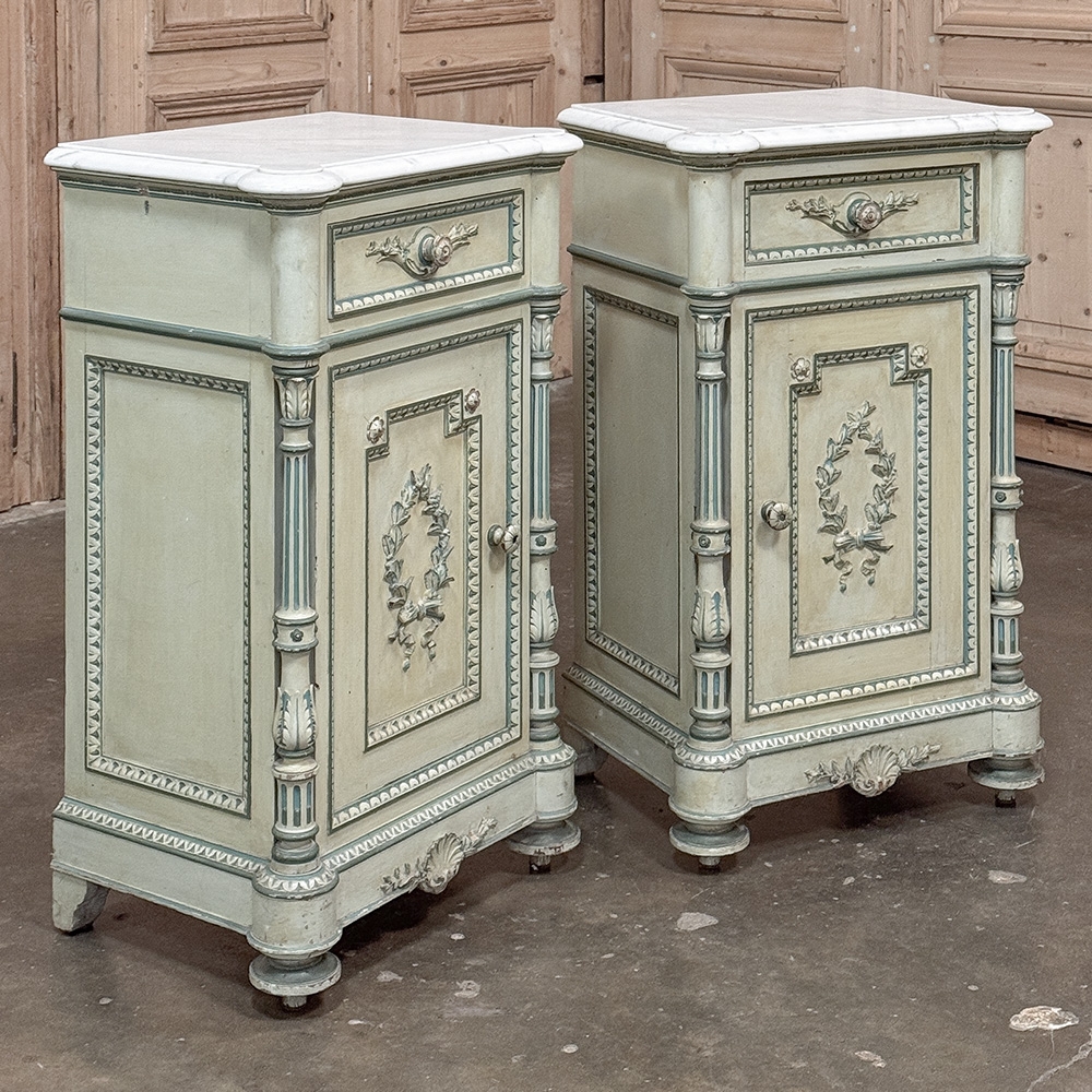 Pair 19th Century French Louis XVI Painted Nightstands with Carrara Marble is a true marvel of the cabinetmaker's art! Hand-crafted from solid French walnut which was still in abundance during the Napoleon III period, each was designed in the neoclassical revival form with stately, tailored architecture enhanced by embellishments and corner columns reminiscent of the glory of ancient Greece and Rome. The top consists of elegant Carrara marble contoured and beveled to follow the casework below. Each corner transitions to intricately turned, fluted and carved columns, together flanking the cabinet and drawer below. The drawer features a carved knob with foliate sprays, while a relief carving of a shell with sprays graces the apron below. Fine molding detail creates a framework for the drawer facades and sides, and each door opens to reveal surprising storage, making this piece as functional as it is beautiful to behold!