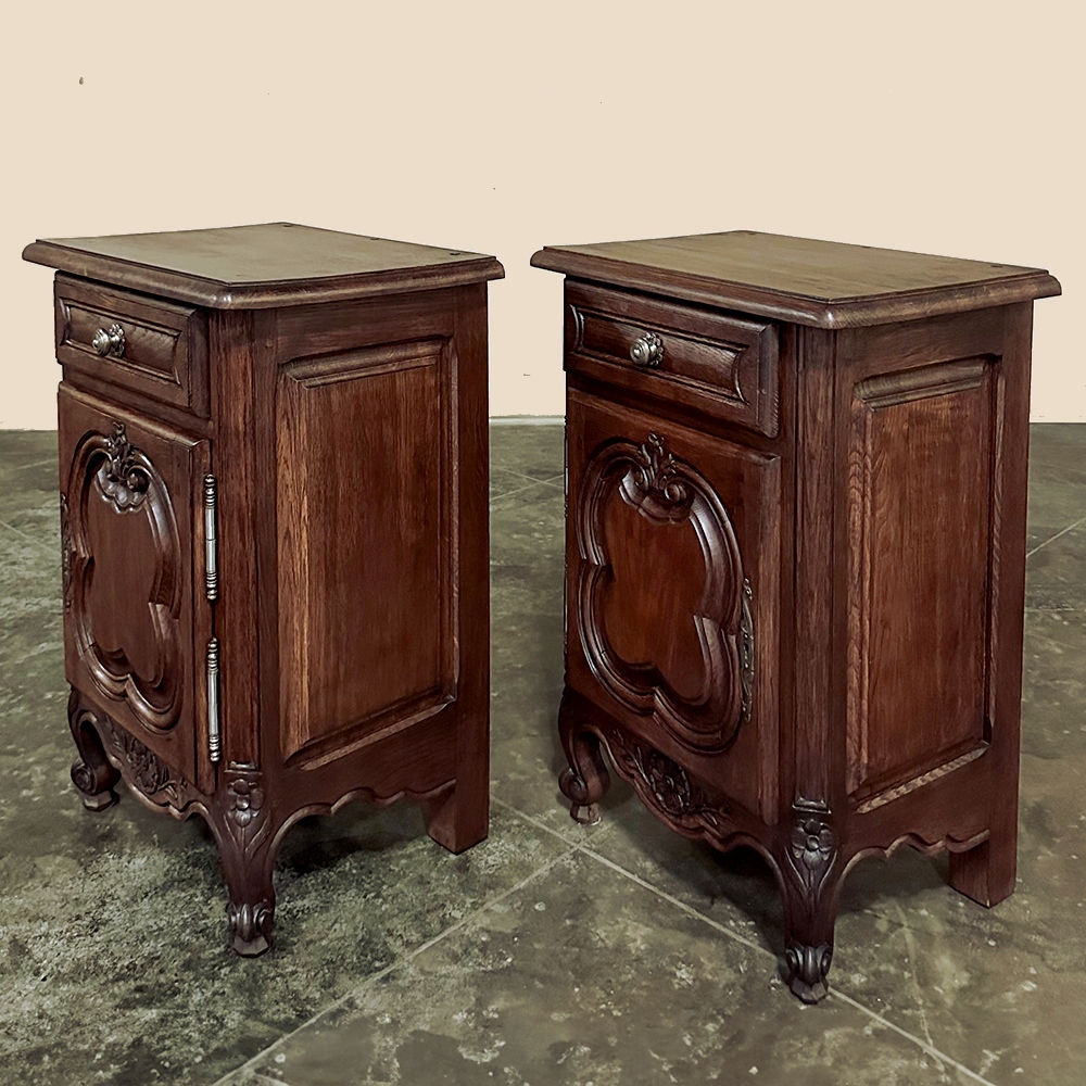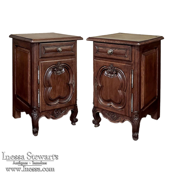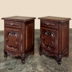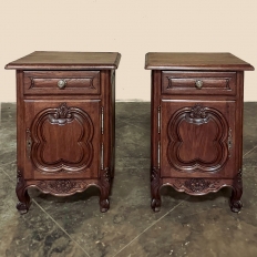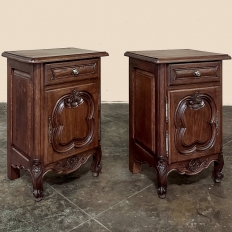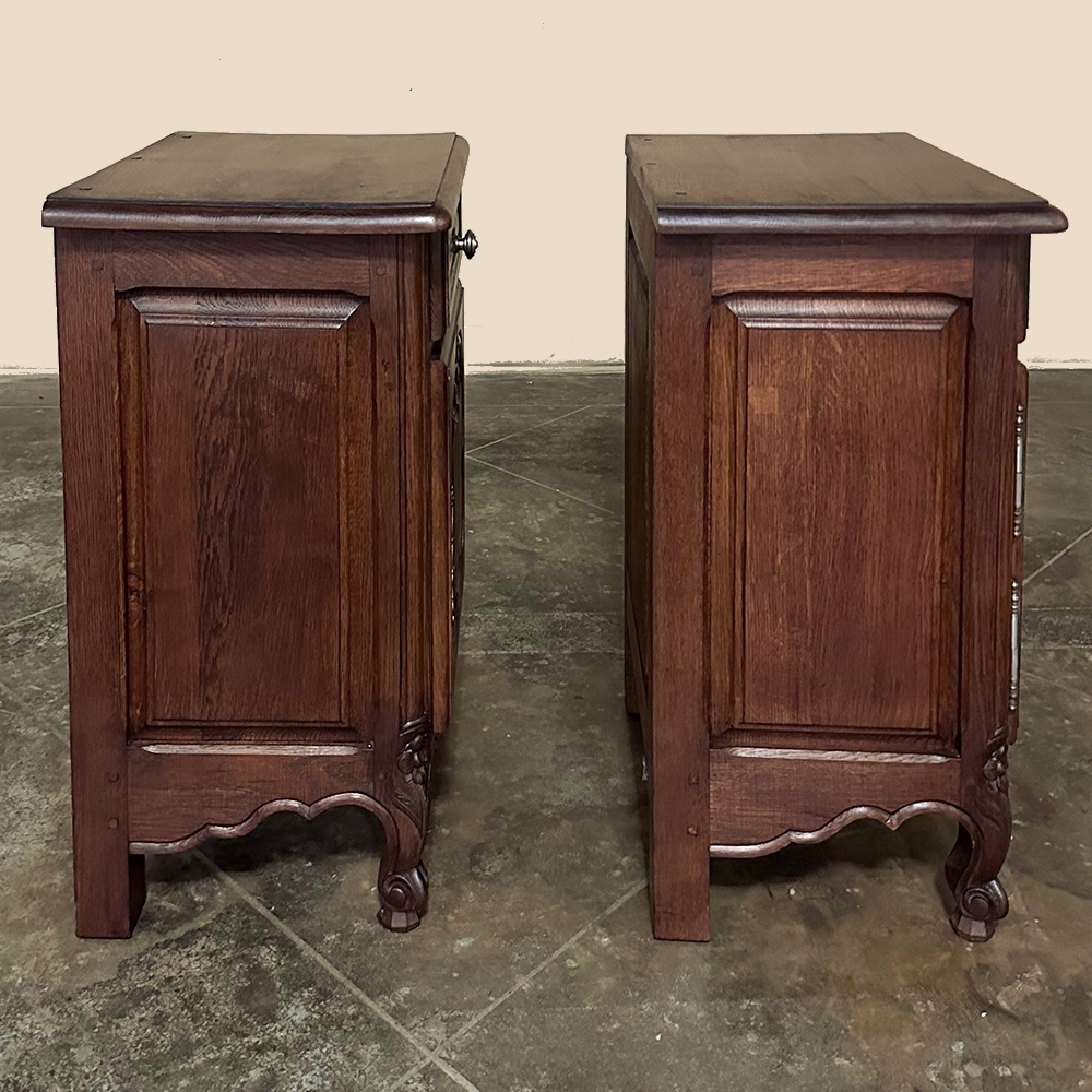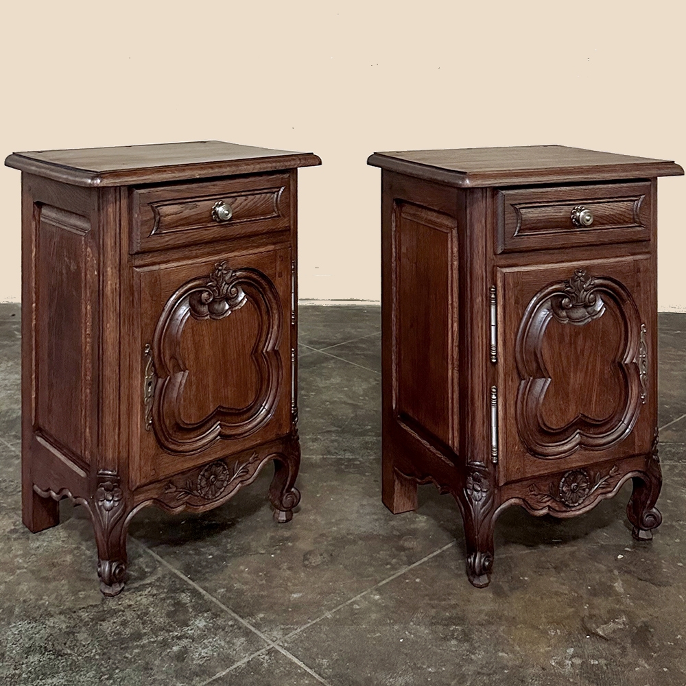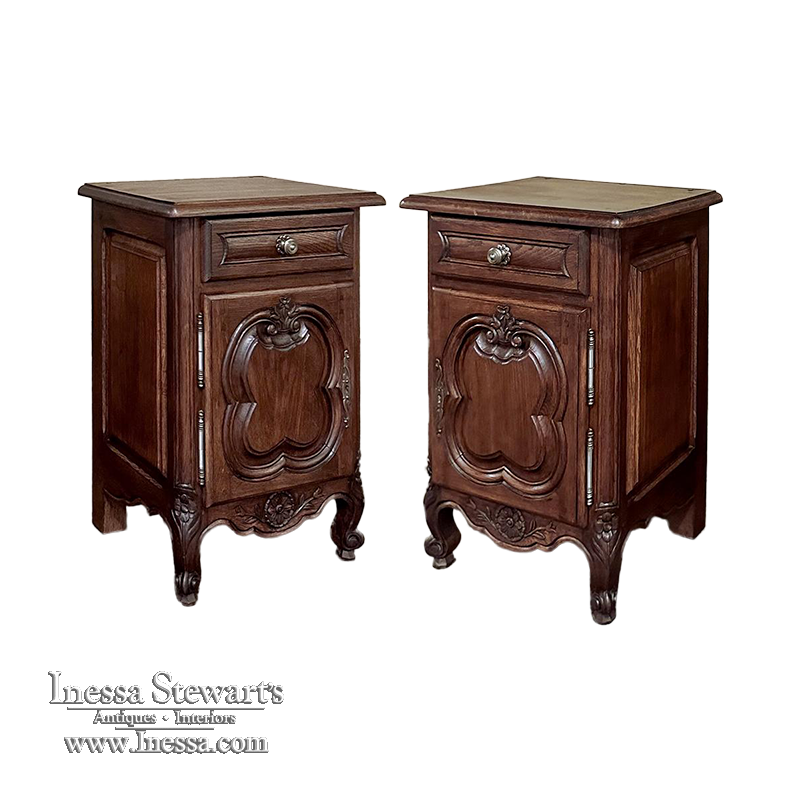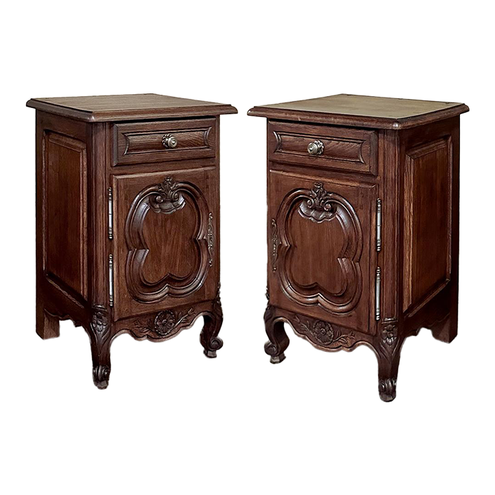 Pair Antique Country French Nightstands will make great bedside companions, but since they're finished all around, work just as well as accompaniments in a seating group, or beside a sofa.  Hand-crafted from solid, dense, hand-select oak, each features a beveled plank top, chamfered side panels, a finely molded drawer and scrolled raised panel on the doors.  The doors are hung with outboard steel barrel hinges matching the steel drawer knobs and key guards, allowing the doors to open wide for easy access.  The scrolled apron below is carved with a flower in a rosette configuration flanked by foliate sprays, with the entire apron framed by scrolled legs carved with acanthus plumes and escargot feet.  Note the pegged mortise & tenon construction.  Even the back side is crafted with solid oak chamfered into the framework as a technique only the best cabinetmakers would use.