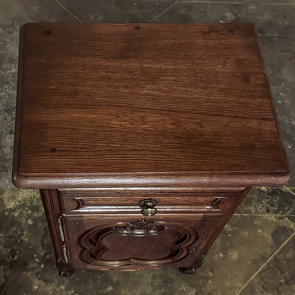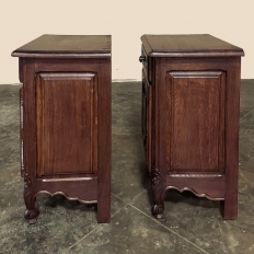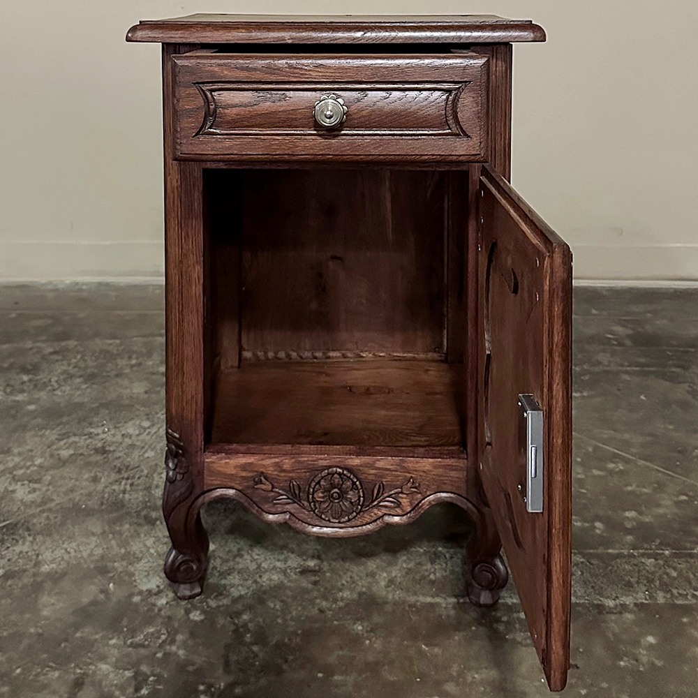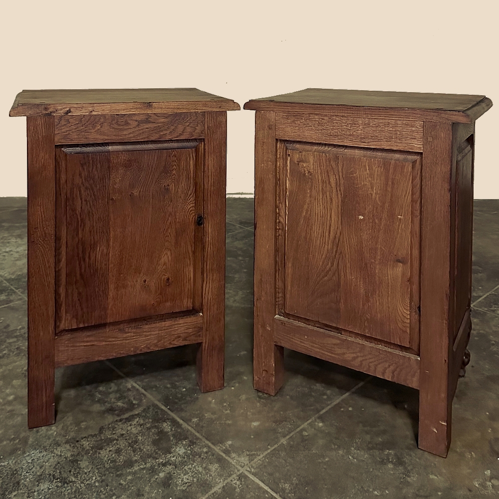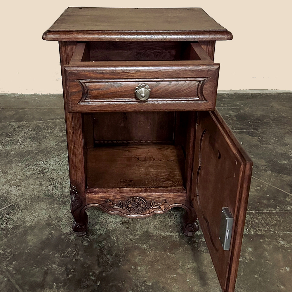 Pair Antique Country French Nightstands will make great bedside companions, but since they're finished all around, work just as well as accompaniments in a seating group, or beside a sofa.  Hand-crafted from solid, dense, hand-select oak, each features a beveled plank top, chamfered side panels, a finely molded drawer and scrolled raised panel on the doors.  The doors are hung with outboard steel barrel hinges matching the steel drawer knobs and key guards, allowing the doors to open wide for easy access.  The scrolled apron below is carved with a flower in a rosette configuration flanked by foliate sprays, with the entire apron framed by scrolled legs carved with acanthus plumes and escargot feet.  Note the pegged mortise & tenon construction.  Even the back side is crafted with solid oak chamfered into the framework as a technique only the best cabinetmakers would use.