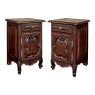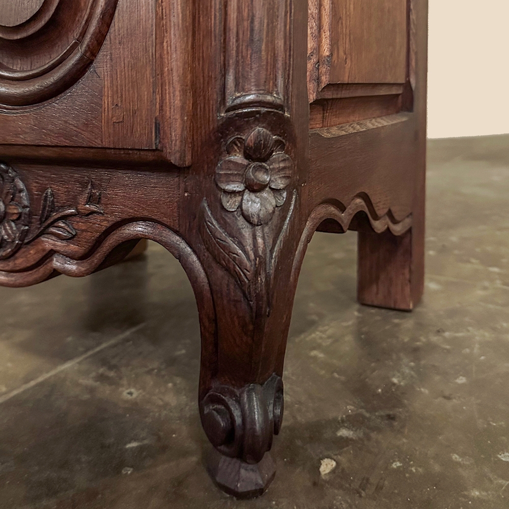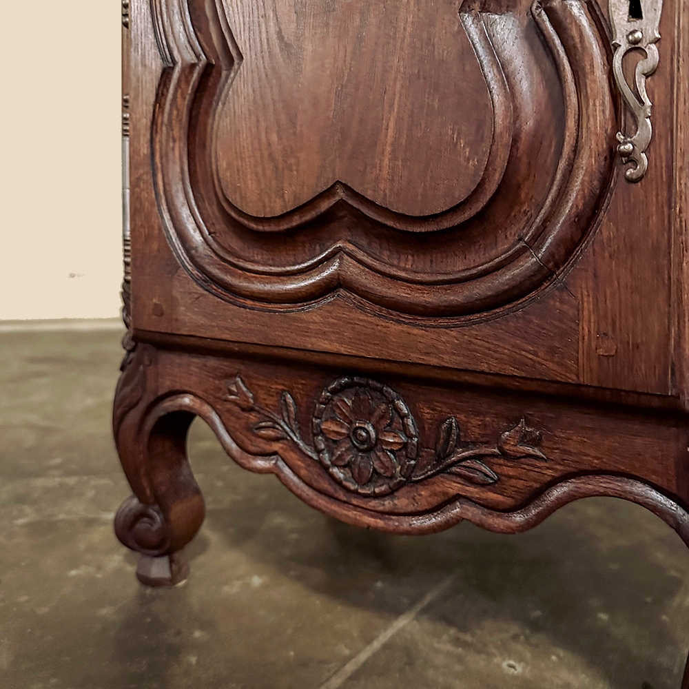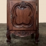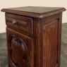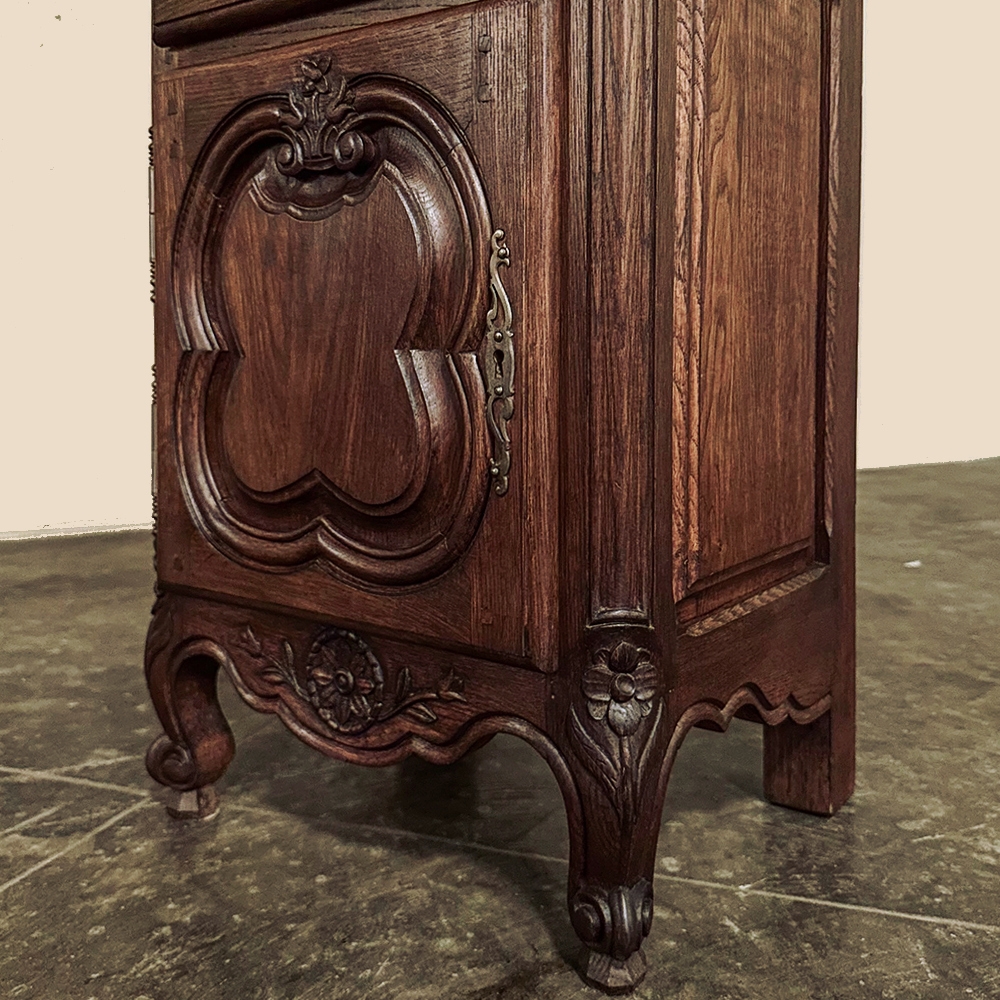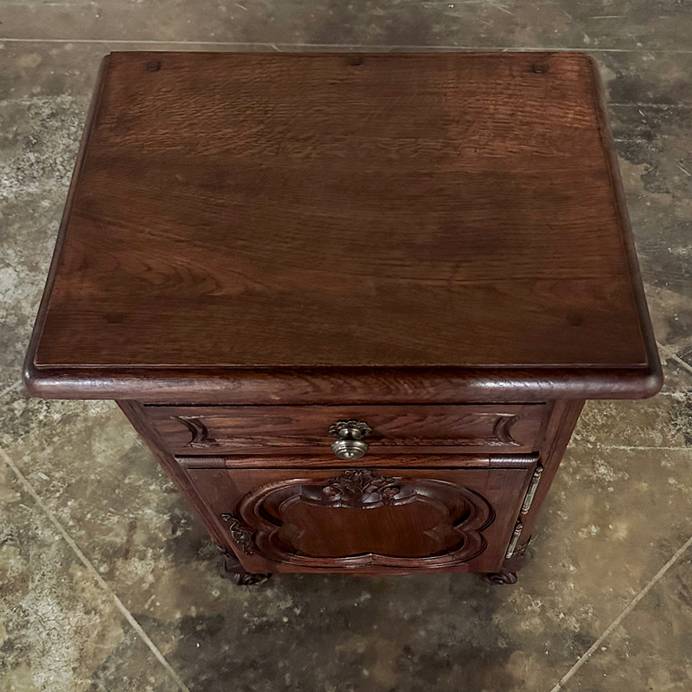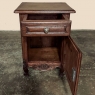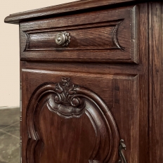 Pair Antique Country French Nightstands will make great bedside companions, but since they're finished all around, work just as well as accompaniments in a seating group, or beside a sofa.  Hand-crafted from solid, dense, hand-select oak, each features a beveled plank top, chamfered side panels, a finely molded drawer and scrolled raised panel on the doors.  The doors are hung with outboard steel barrel hinges matching the steel drawer knobs and key guards, allowing the doors to open wide for easy access.  The scrolled apron below is carved with a flower in a rosette configuration flanked by foliate sprays, with the entire apron framed by scrolled legs carved with acanthus plumes and escargot feet.  Note the pegged mortise & tenon construction.  Even the back side is crafted with solid oak chamfered into the framework as a technique only the best cabinetmakers would use.