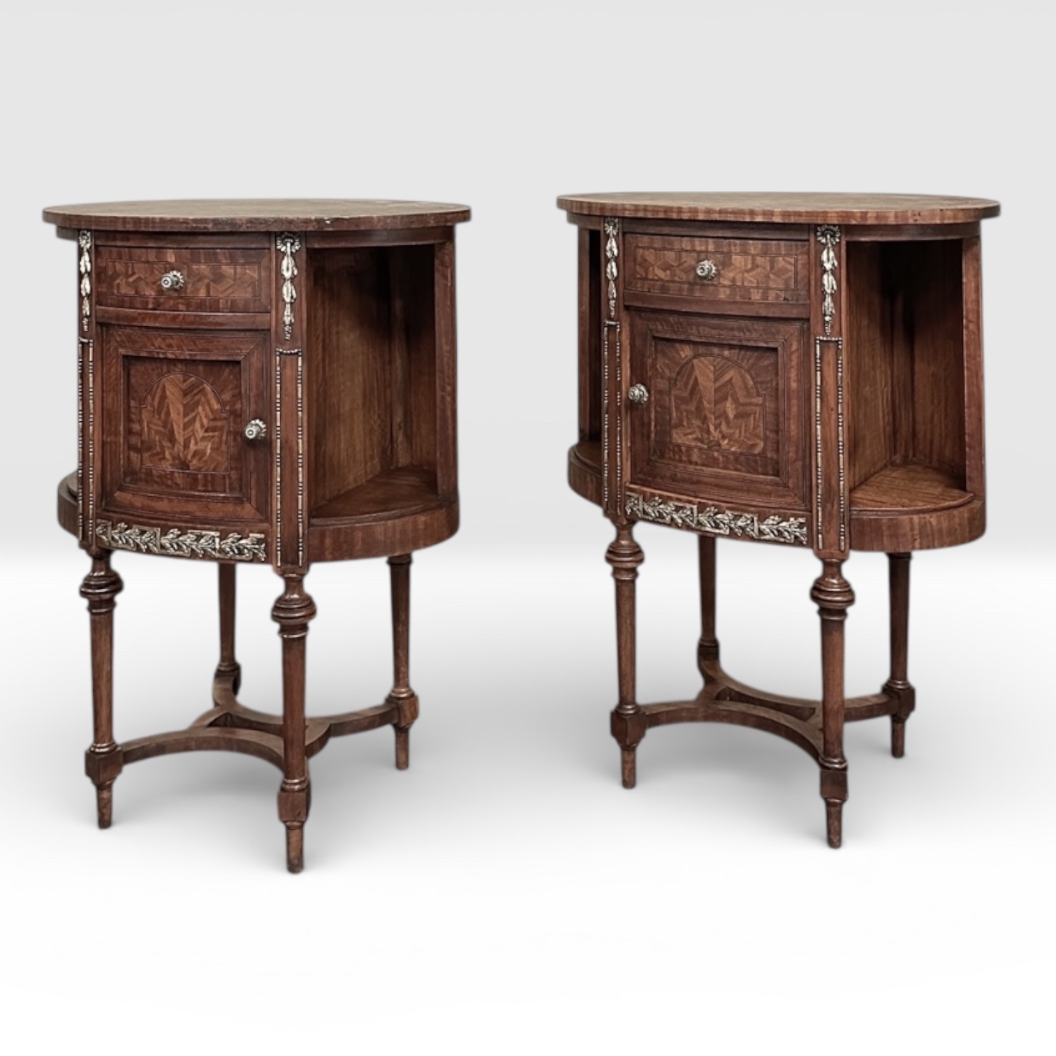 Pair Antique French Louis XVI Oval Marquetry Nightstands ~ End Tables