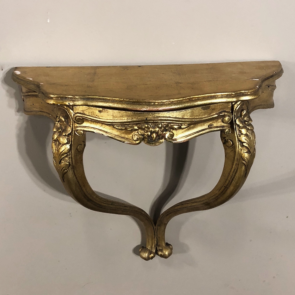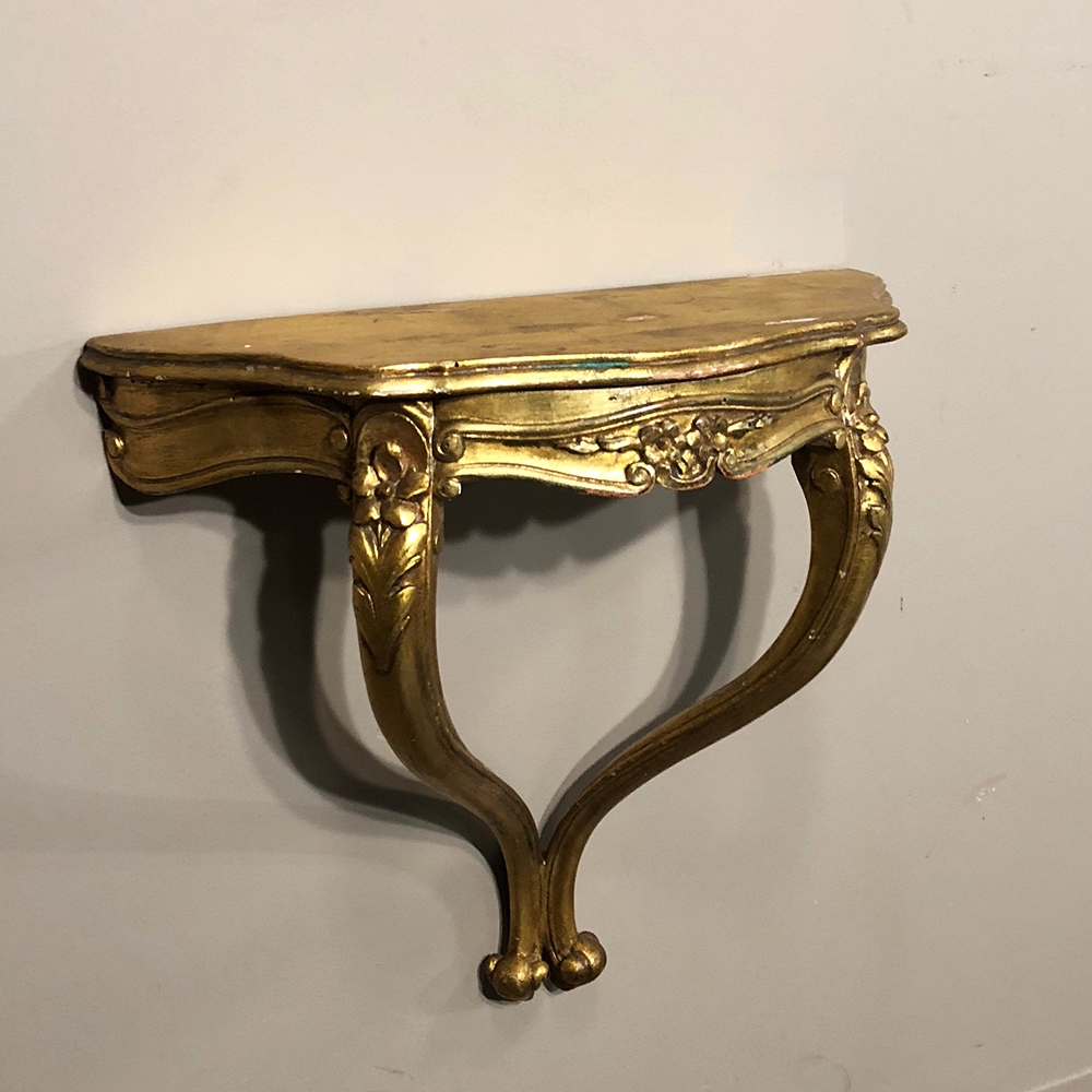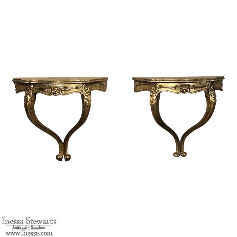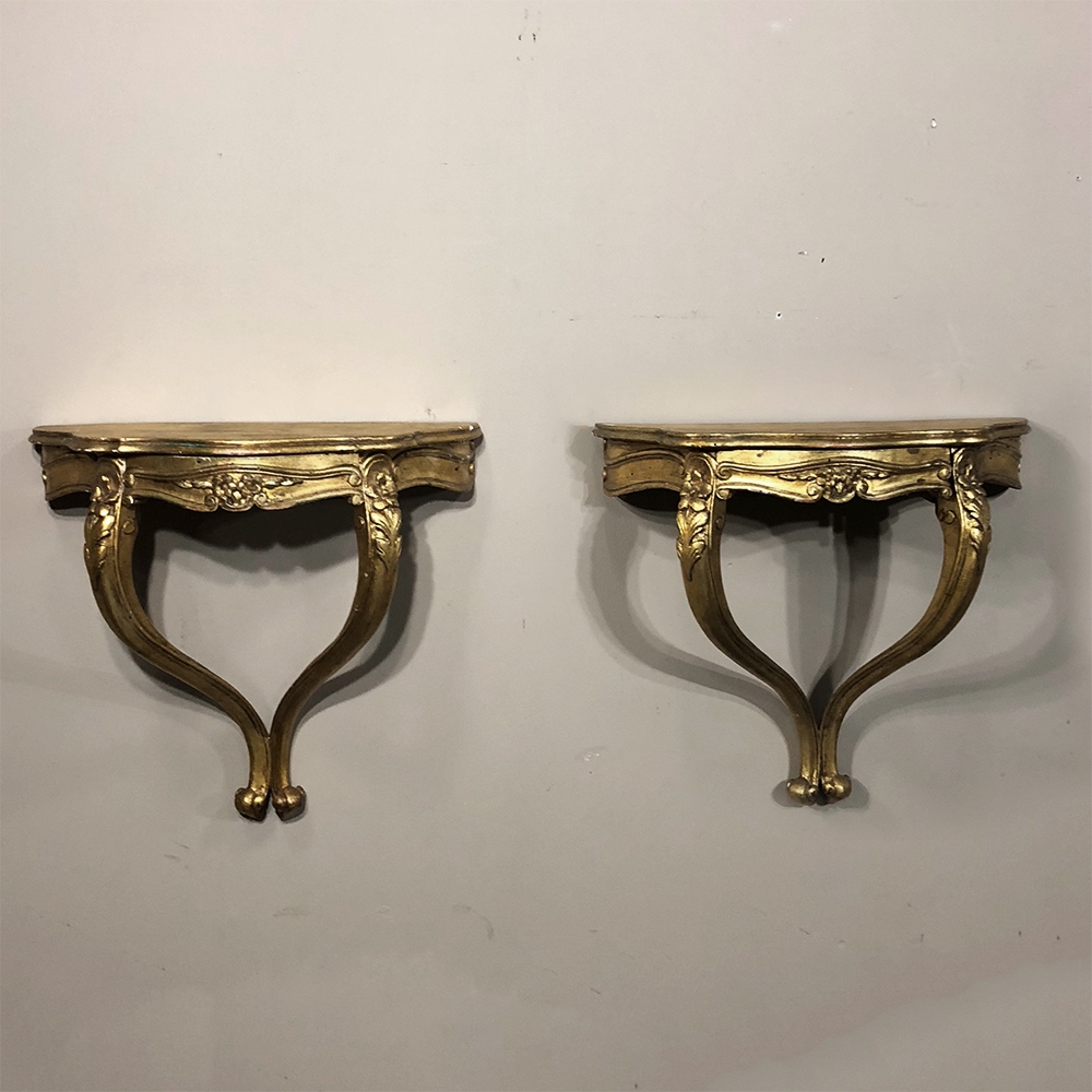 SalePair Antique Italian Baroque Giltwood Nightstands/Consoles is easily mounted on the wall to make the perfect bedside companions, and you're good to go in inimitable Italian flair! Each was hand-carved then given a golden painted finish for an understated elegance.