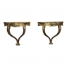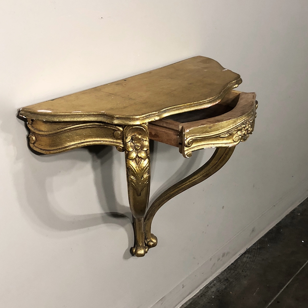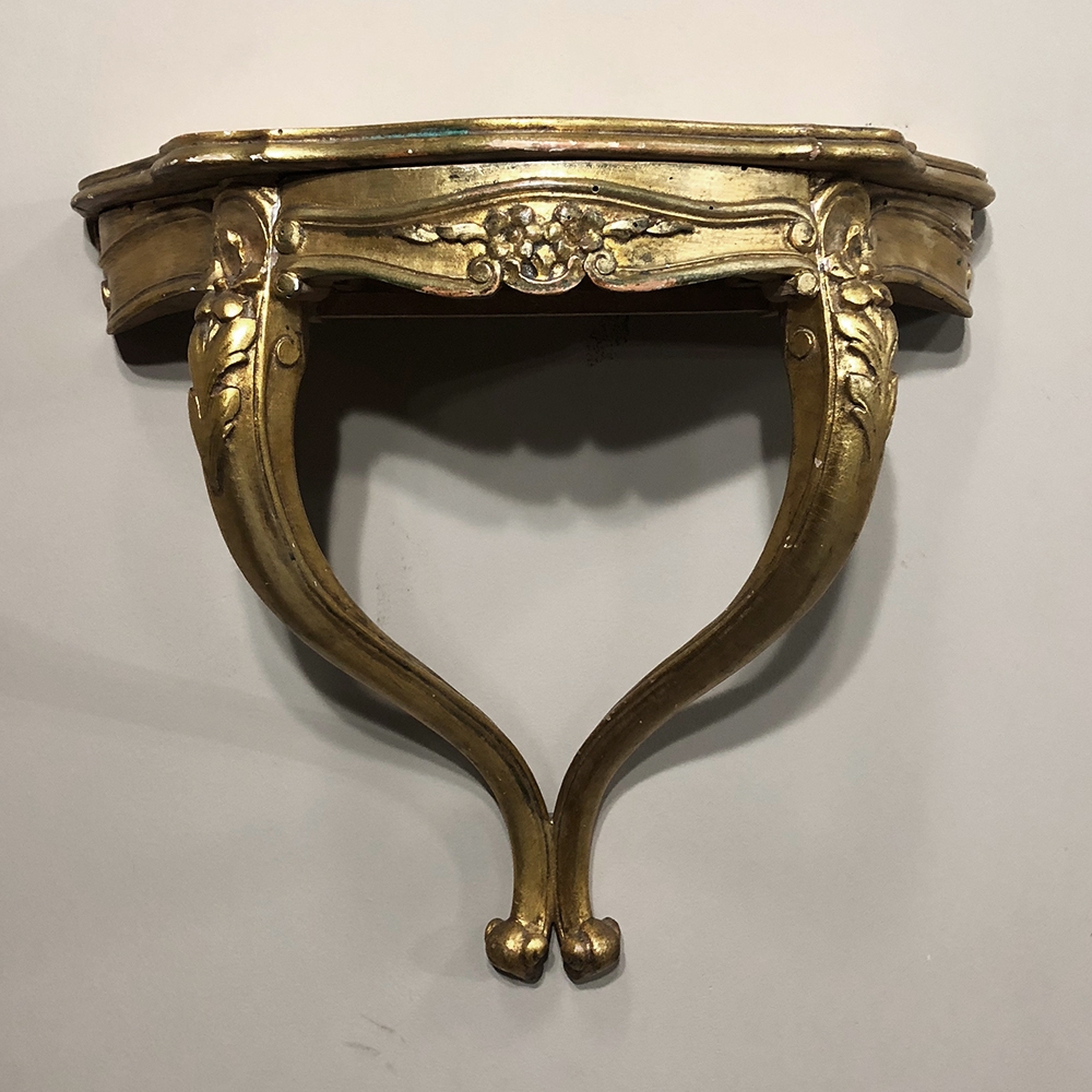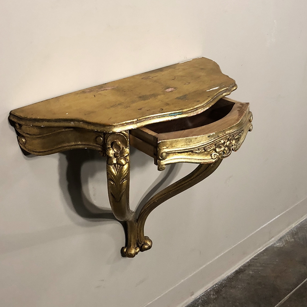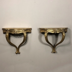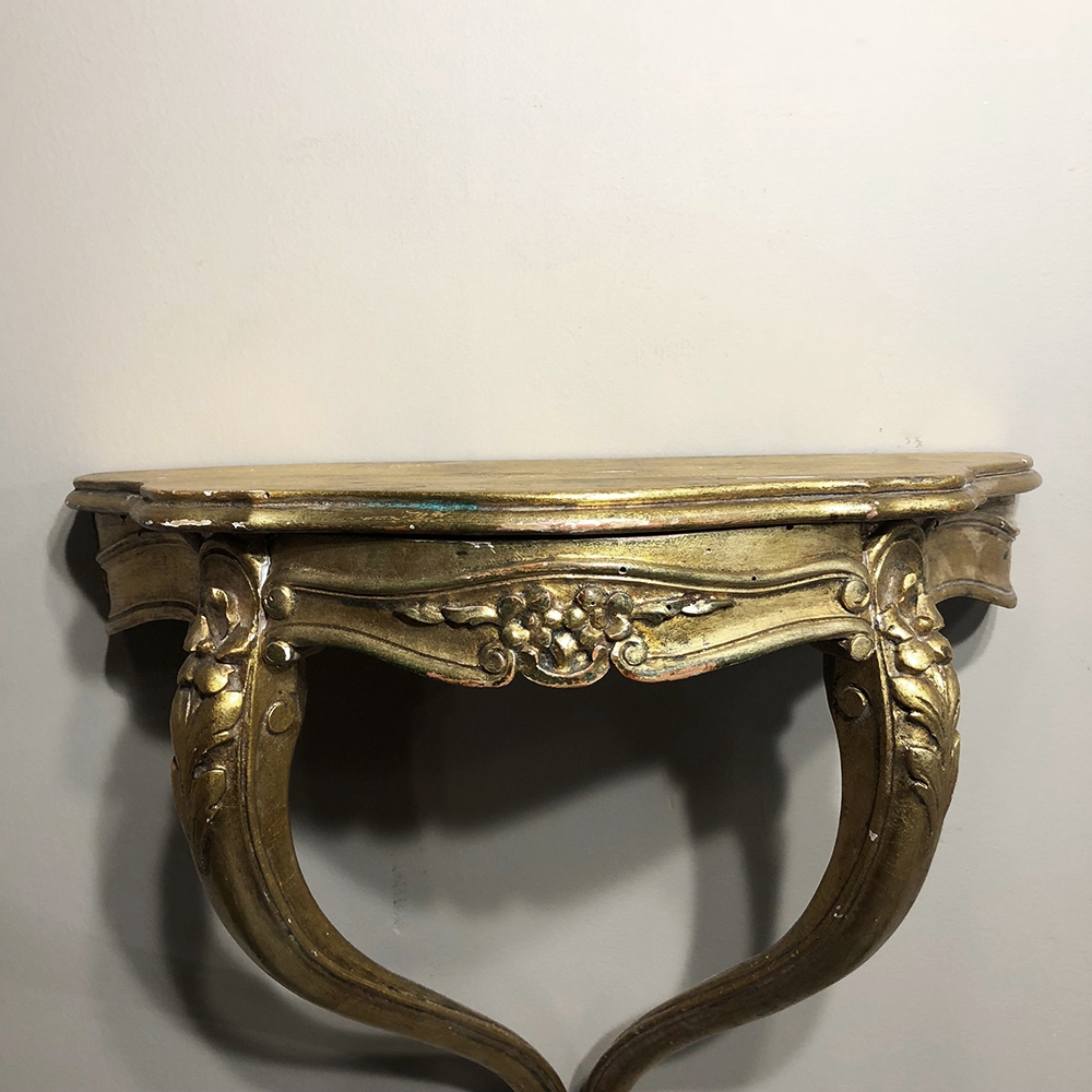 SalePair Antique Italian Baroque Giltwood Nightstands/Consoles is easily mounted on the wall to make the perfect bedside companions, and you're good to go in inimitable Italian flair! Each was hand-carved then given a golden painted finish for an understated elegance.