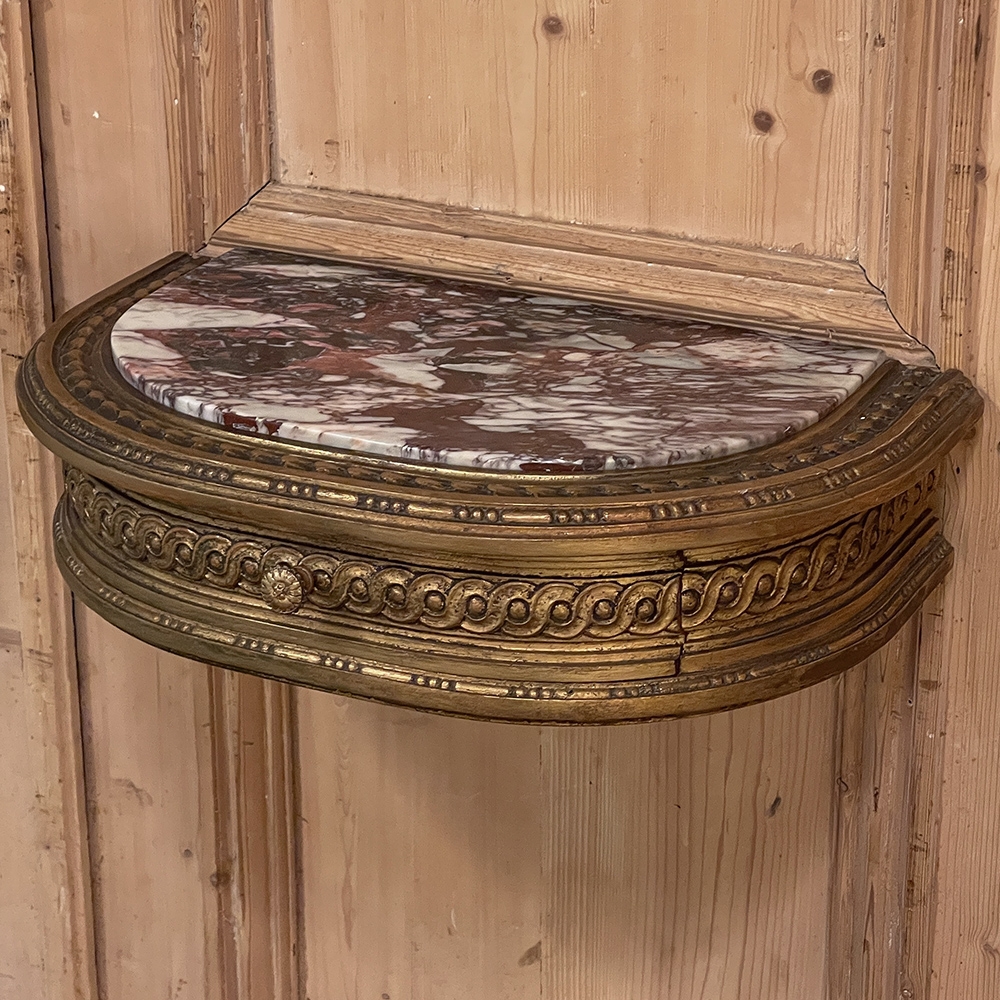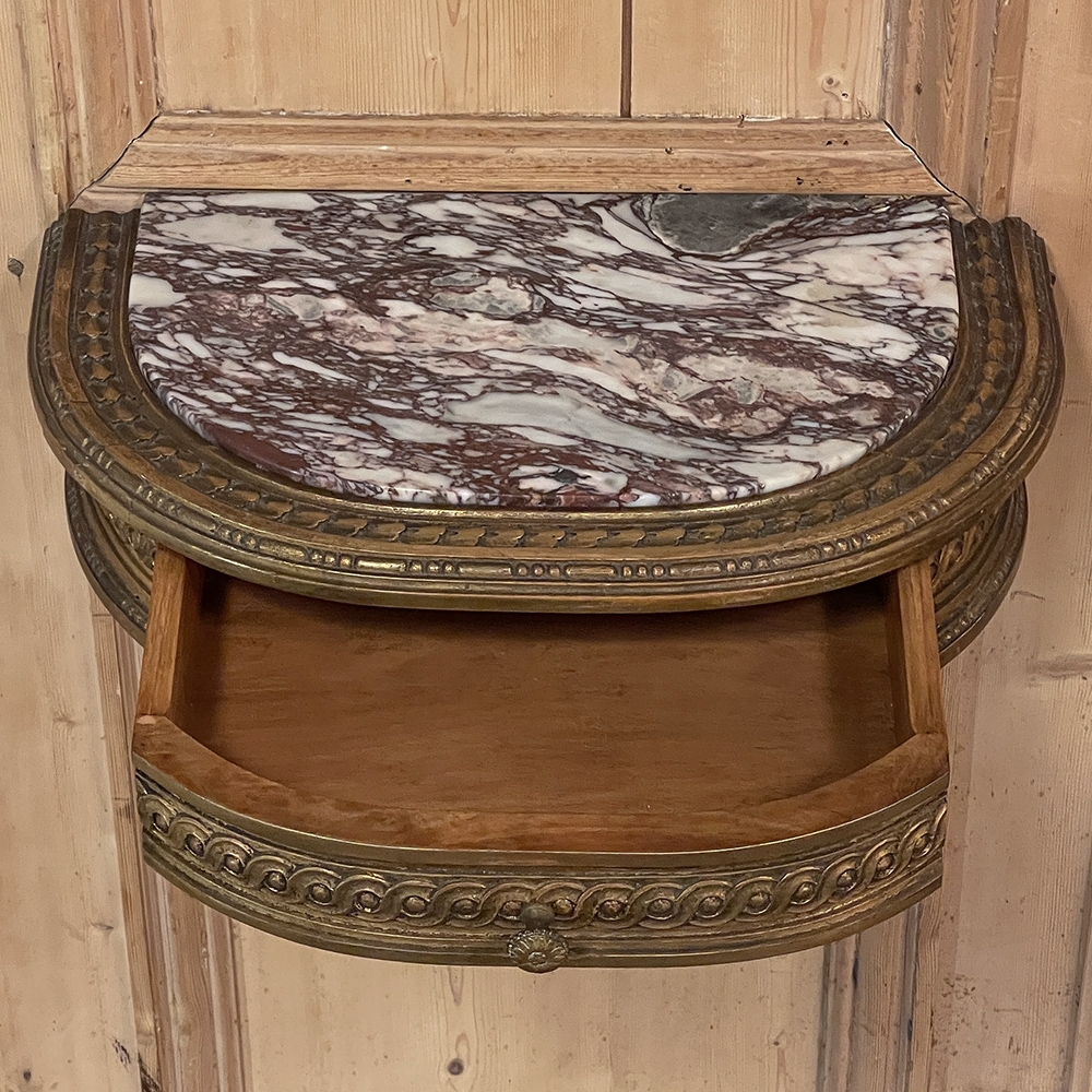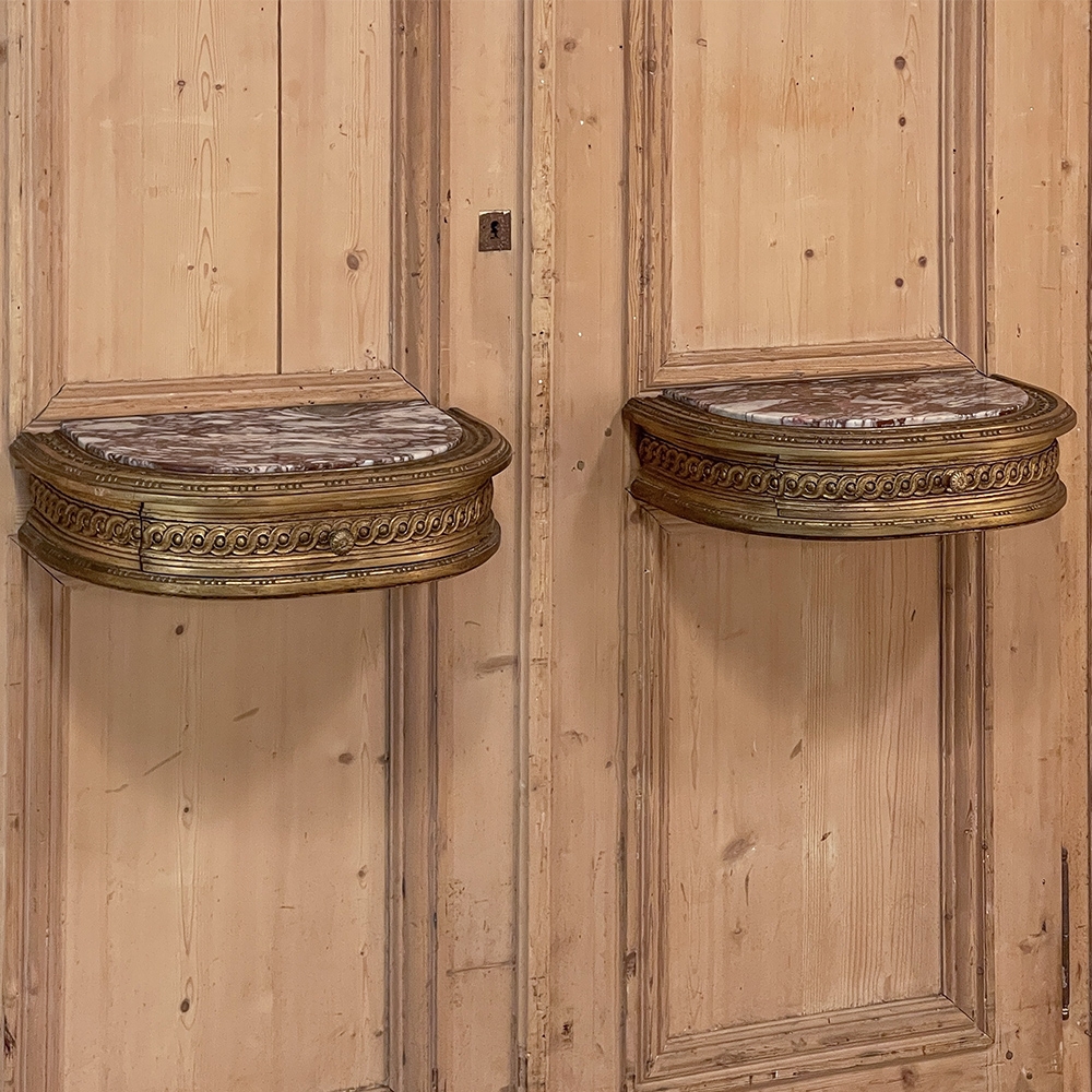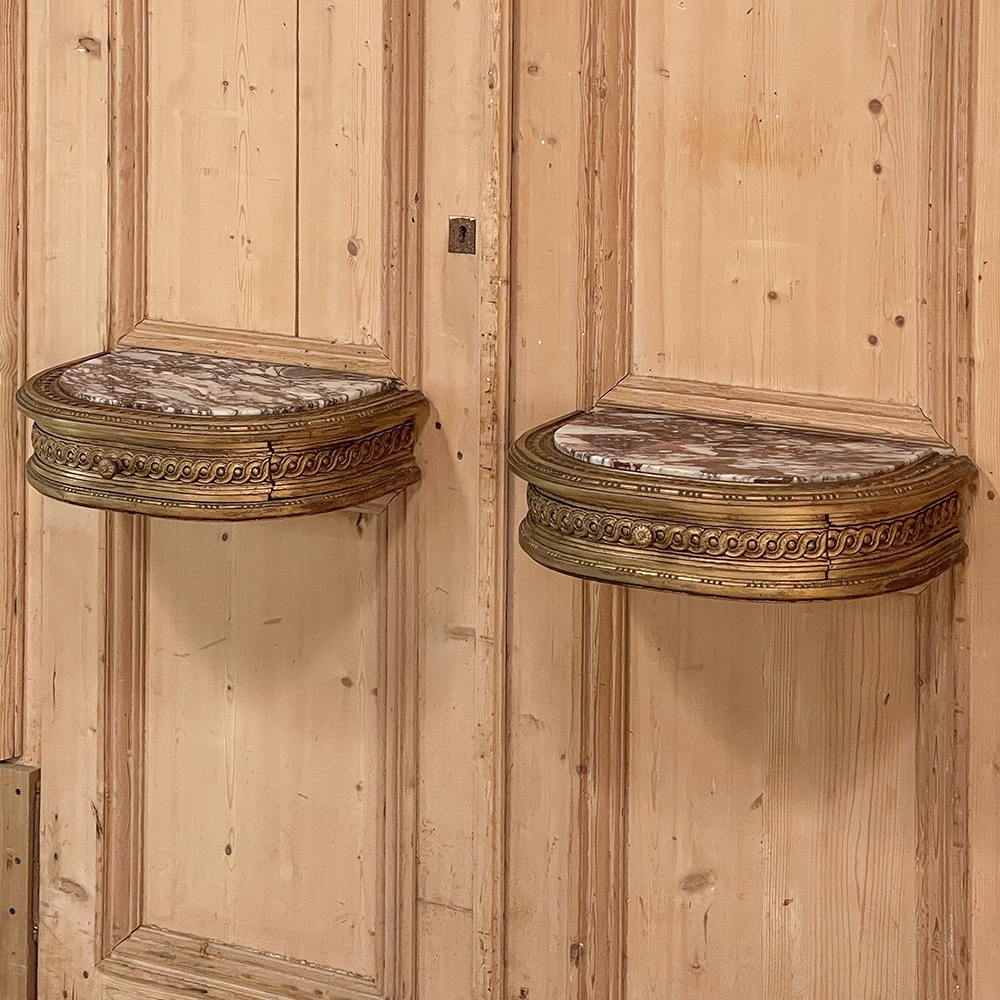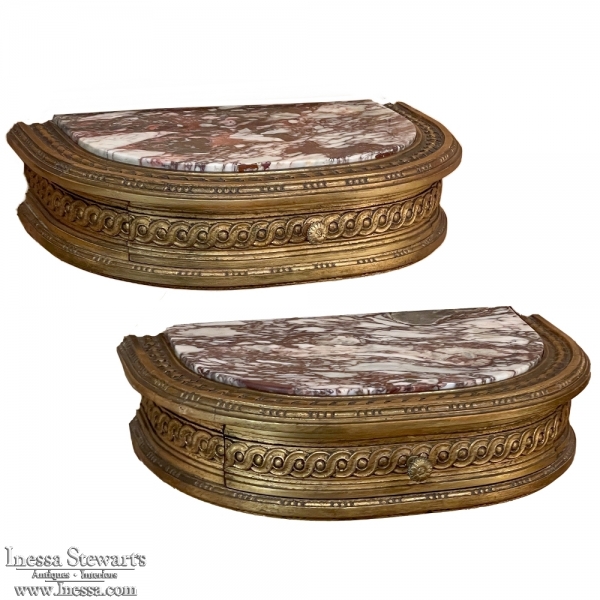 Pair Antique Italian Giltwood Marble Top Wall-Mount Nightstands ~ Consoles are a splendid choice for a timeless touch of style blended with the ultimate in space efficiency! Designed to mount to the wall, each features a demilune form including a luxuriously veined marble inset top. The casework is adorned with bold molded detail above and below, centered from wall to wall with Greek coin motif. Cut directly into the facade of each piece is a spacious drawer with a single pull knob, continuing the classic look of the pair. The gilt finish has achieved a lovely patina over the decades, only adding to the charm.
