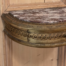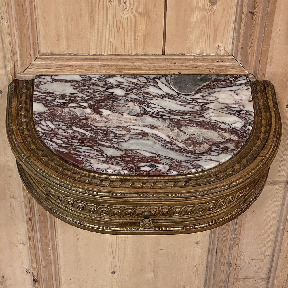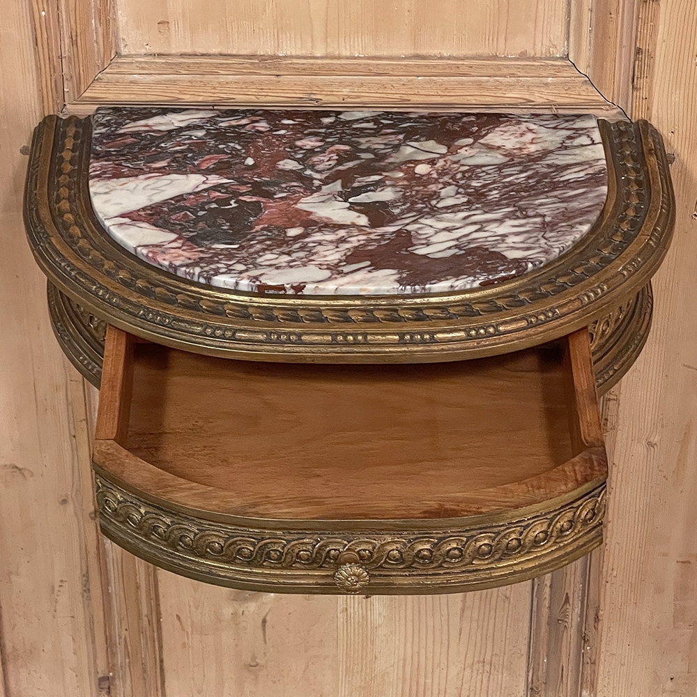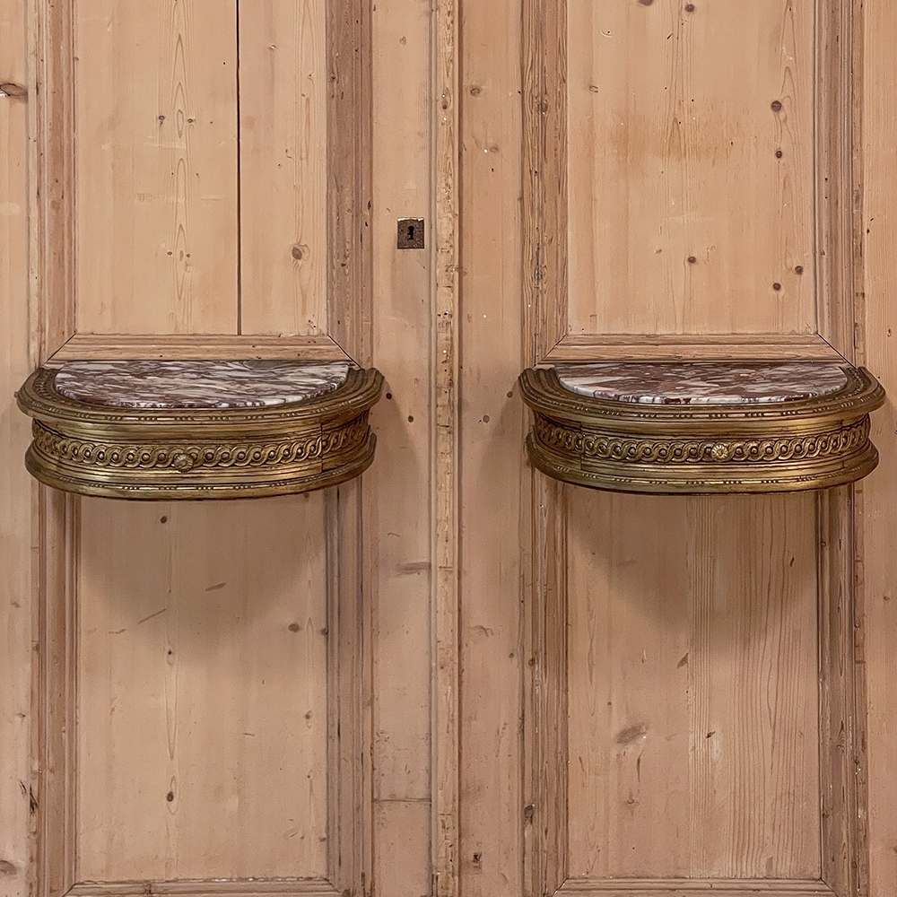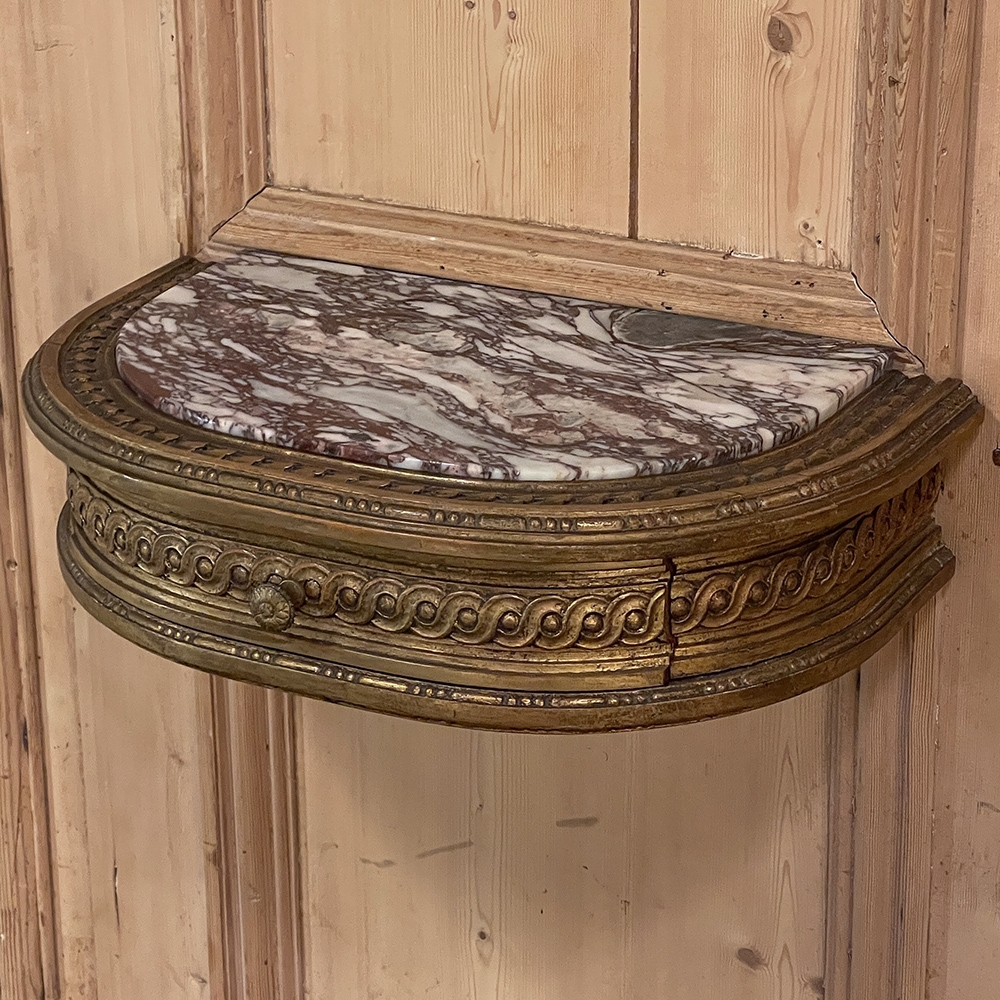 Pair Antique Italian Giltwood Marble Top Wall-Mount Nightstands ~ Consoles are a splendid choice for a timeless touch of style blended with the ultimate in space efficiency! Designed to mount to the wall, each features a demilune form including a luxuriously veined marble inset top. The casework is adorned with bold molded detail above and below, centered from wall to wall with Greek coin motif. Cut directly into the facade of each piece is a spacious drawer with a single pull knob, continuing the classic look of the pair. The gilt finish has achieved a lovely patina over the decades, only adding to the charm.
