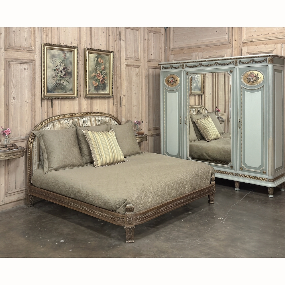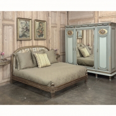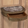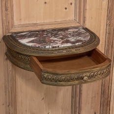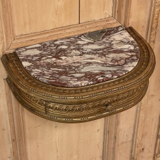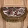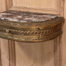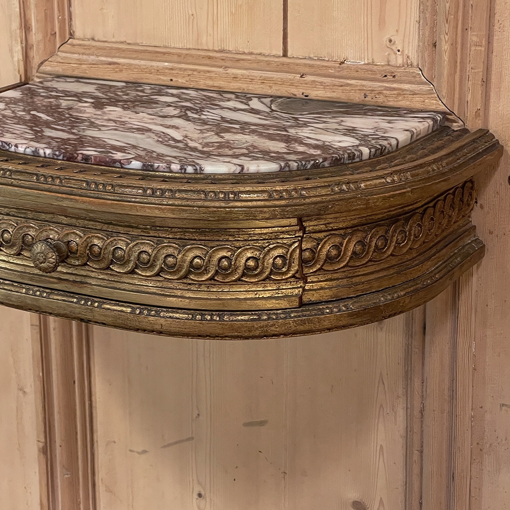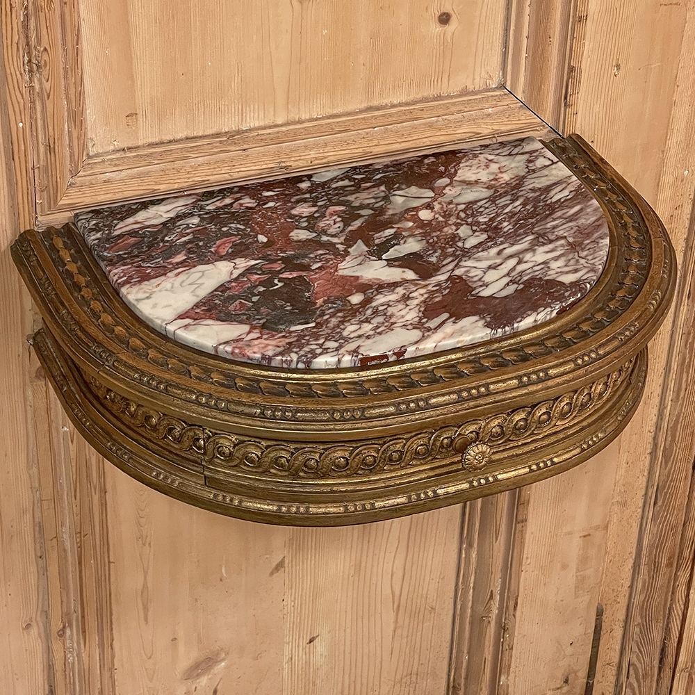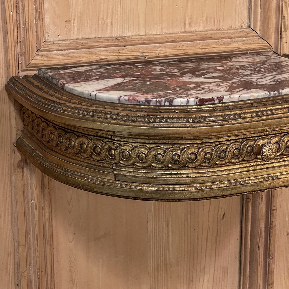 Pair Antique Italian Giltwood Marble Top Wall-Mount Nightstands ~ Consoles are a splendid choice for a timeless touch of style blended with the ultimate in space efficiency! Designed to mount to the wall, each features a demilune form including a luxuriously veined marble inset top. The casework is adorned with bold molded detail above and below, centered from wall to wall with Greek coin motif. Cut directly into the facade of each piece is a spacious drawer with a single pull knob, continuing the classic look of the pair. The gilt finish has achieved a lovely patina over the decades, only adding to the charm.