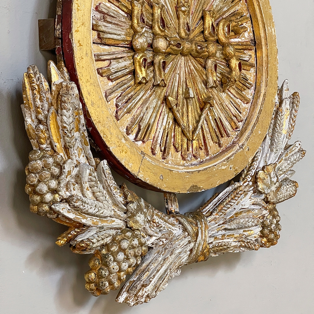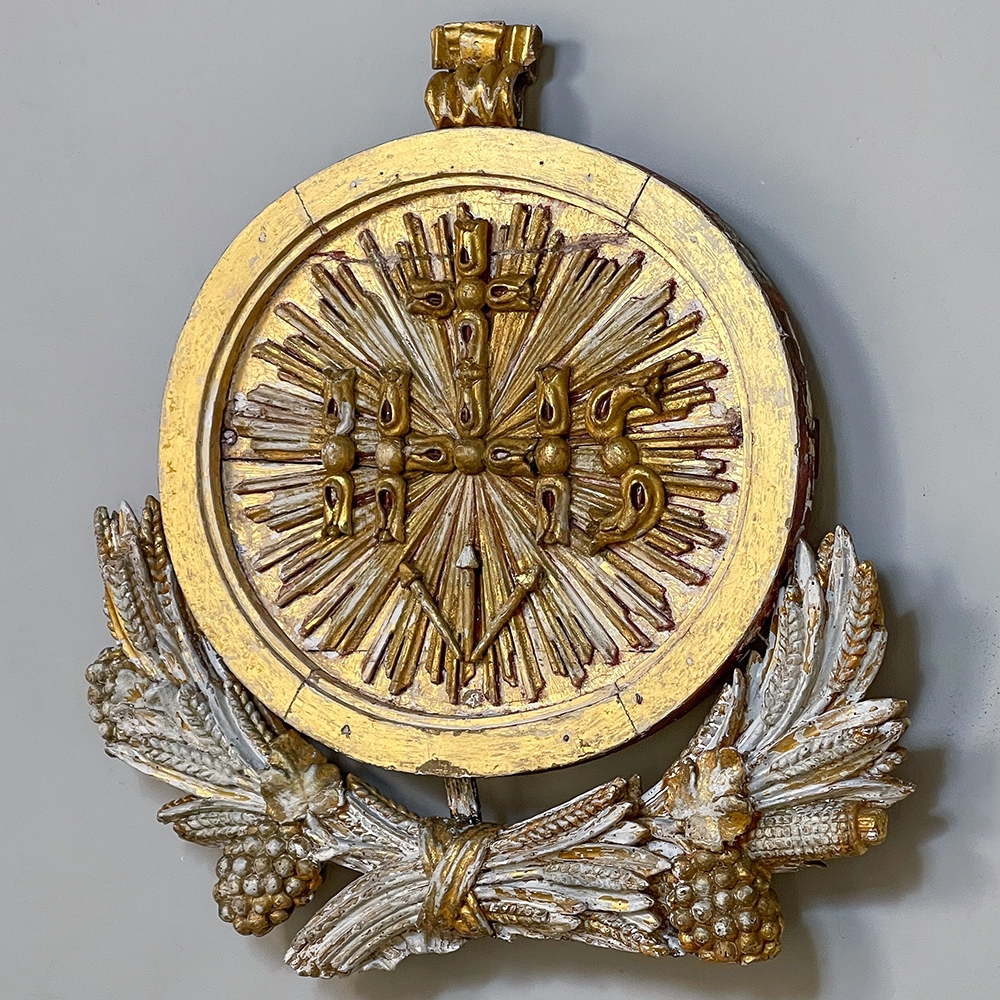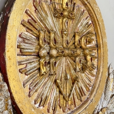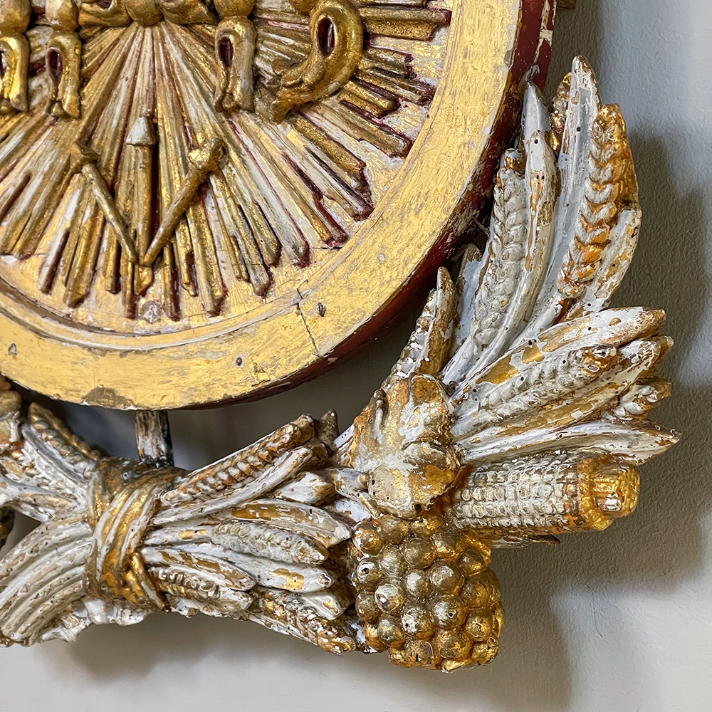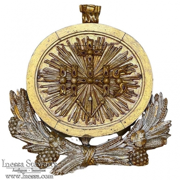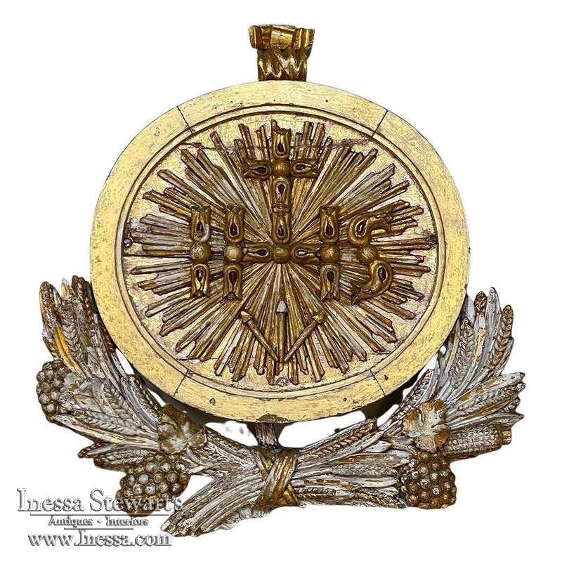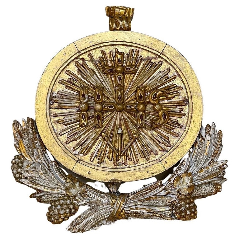 18th Century Carved & Painted Symbolic Christian Plaque will make a unique and special addition to your devotional display! Hand-carved from fruitwood around the time of the founding of our nation, it was sculpted by a talented artisan depicting various examples of symbolism from the Christian faith. Foliates form the letters that appeared on the plaque placed on the cross, with the cross itself also represented using the same imagery. Three arrows represent the Holy Trinity, while all are set on a backdrop of a sunburst design alluding to the Divine Light. The work is set on a coin-like circular background and is enhanced by a gold finish. Underneath the coin are bundles of wheat and clusters of grapes symbolizing the Holy Communion and Last Supper, with gold highlighting on a gray background which enhances the sculpted detail.