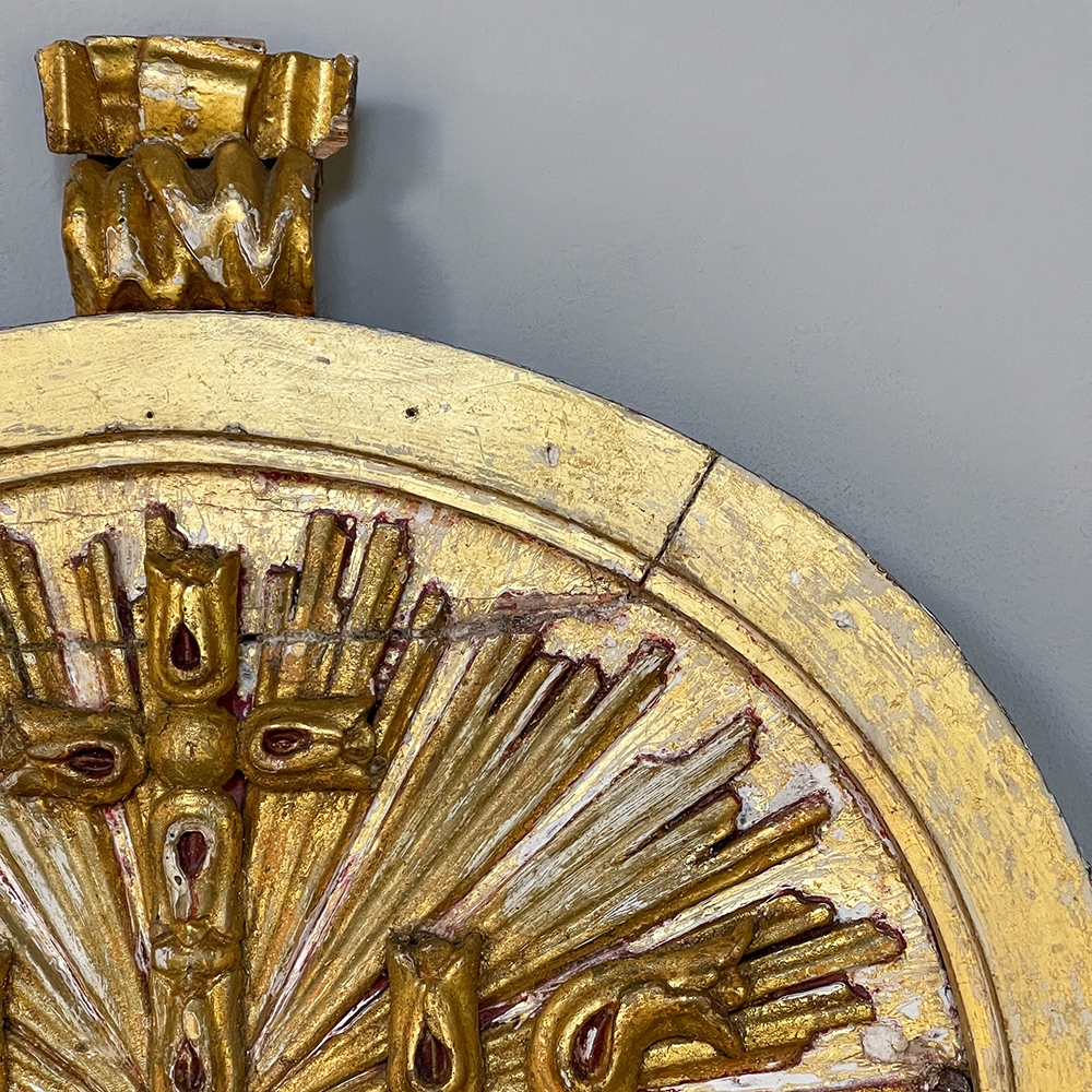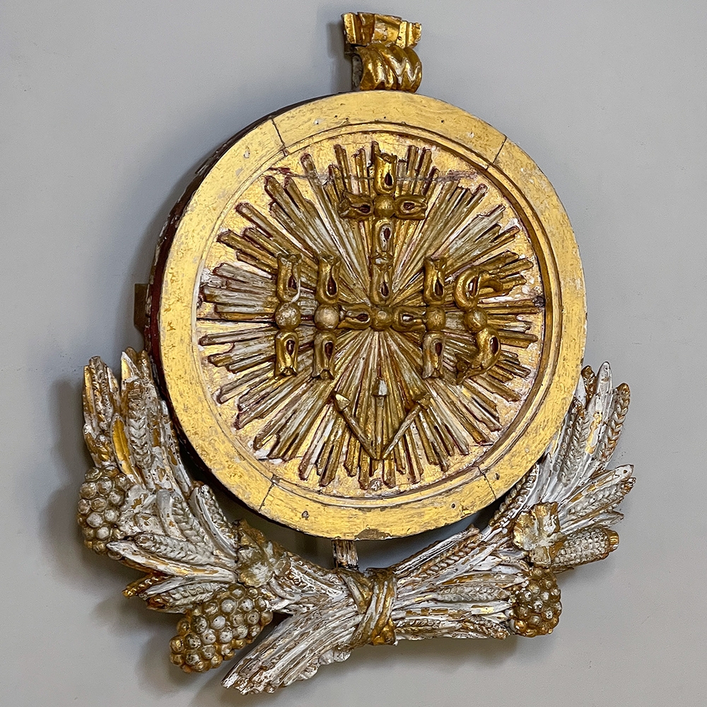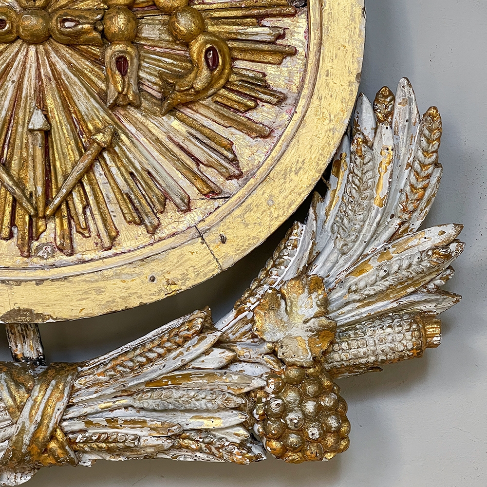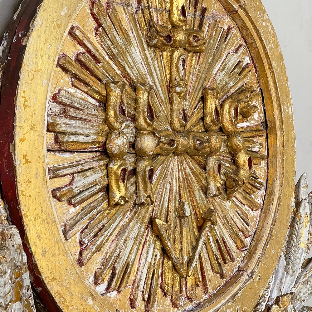 18th Century Carved & Painted Symbolic Christian Plaque will make a unique and special addition to your devotional display! Hand-carved from fruitwood around the time of the founding of our nation, it was sculpted by a talented artisan depicting various examples of symbolism from the Christian faith. Foliates form the letters that appeared on the plaque placed on the cross, with the cross itself also represented using the same imagery. Three arrows represent the Holy Trinity, while all are set on a backdrop of a sunburst design alluding to the Divine Light. The work is set on a coin-like circular background and is enhanced by a gold finish. Underneath the coin are bundles of wheat and clusters of grapes symbolizing the Holy Communion and Last Supper, with gold highlighting on a gray background which enhances the sculpted detail.