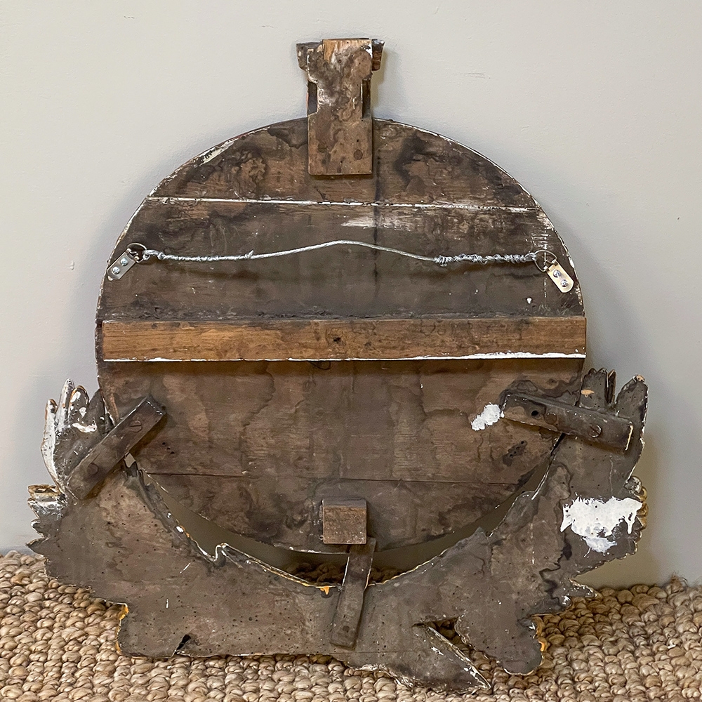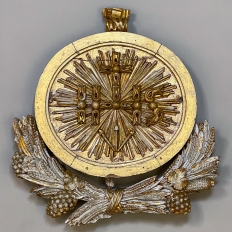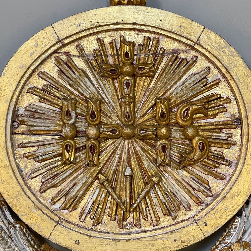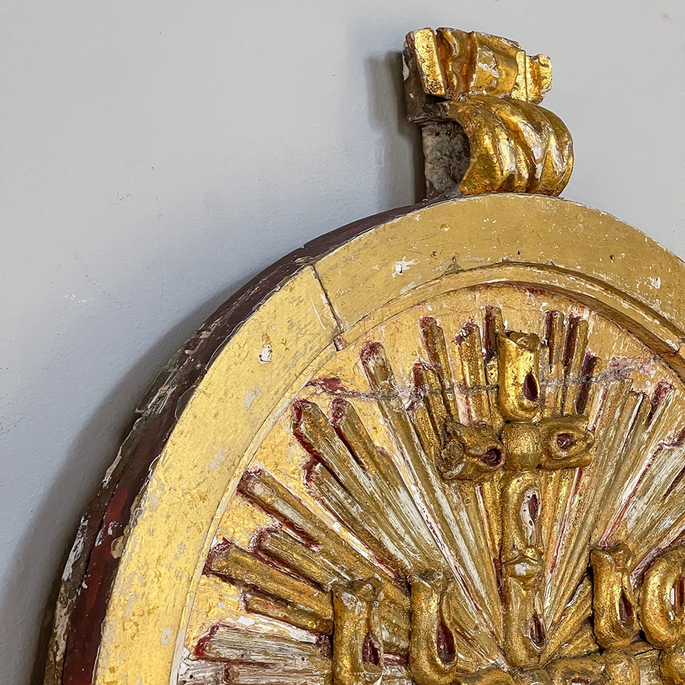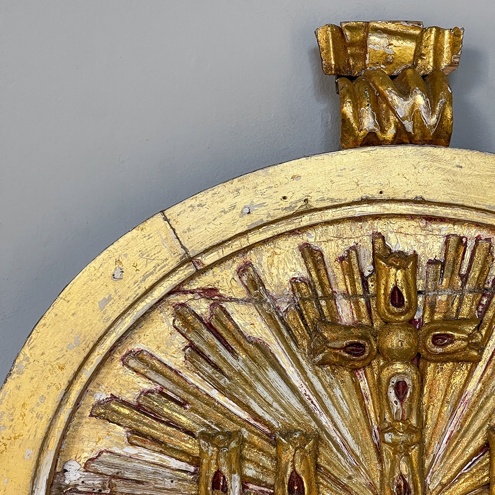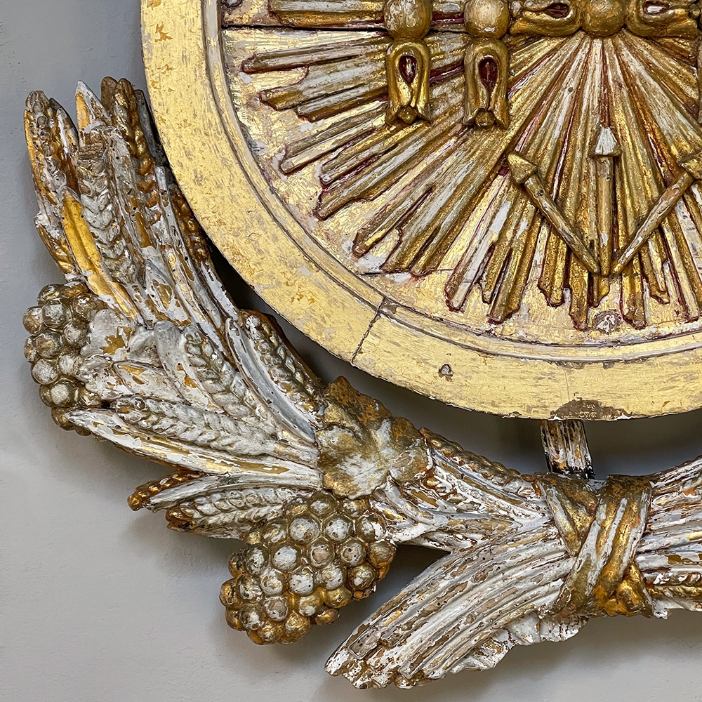 18th Century Carved & Painted Symbolic Christian Plaque will make a unique and special addition to your devotional display! Hand-carved from fruitwood around the time of the founding of our nation, it was sculpted by a talented artisan depicting various examples of symbolism from the Christian faith. Foliates form the letters that appeared on the plaque placed on the cross, with the cross itself also represented using the same imagery. Three arrows represent the Holy Trinity, while all are set on a backdrop of a sunburst design alluding to the Divine Light. The work is set on a coin-like circular background and is enhanced by a gold finish. Underneath the coin are bundles of wheat and clusters of grapes symbolizing the Holy Communion and Last Supper, with gold highlighting on a gray background which enhances the sculpted detail.