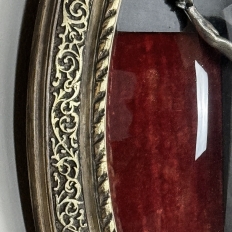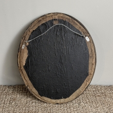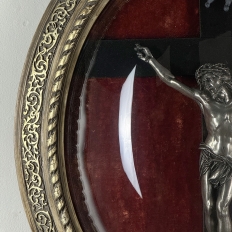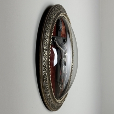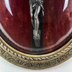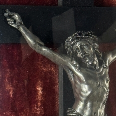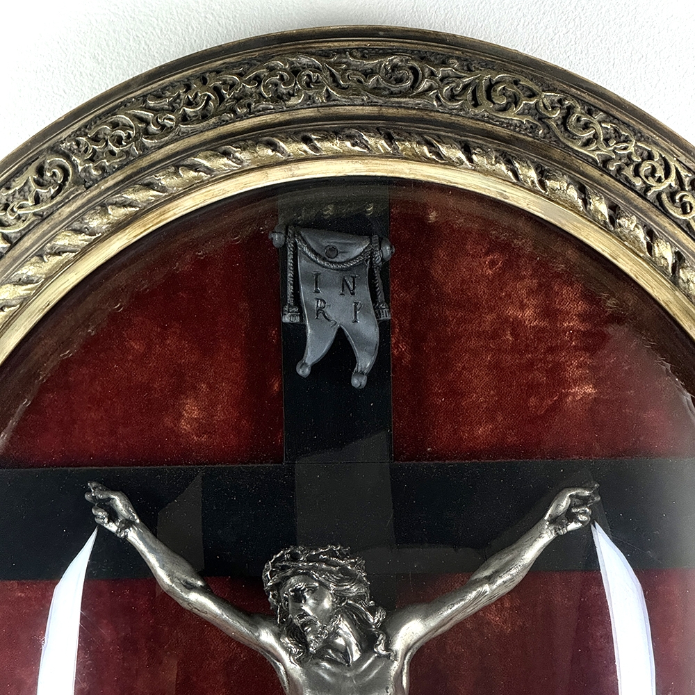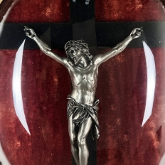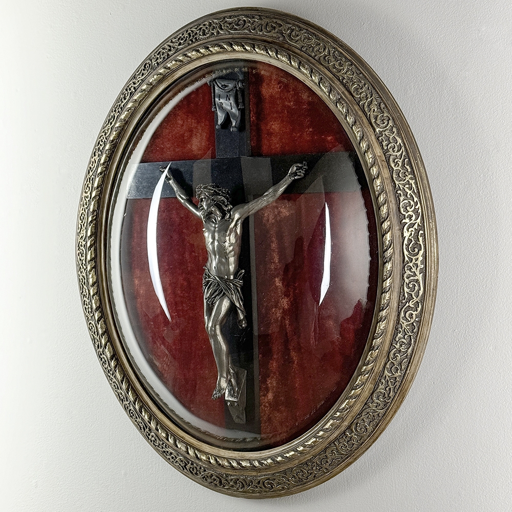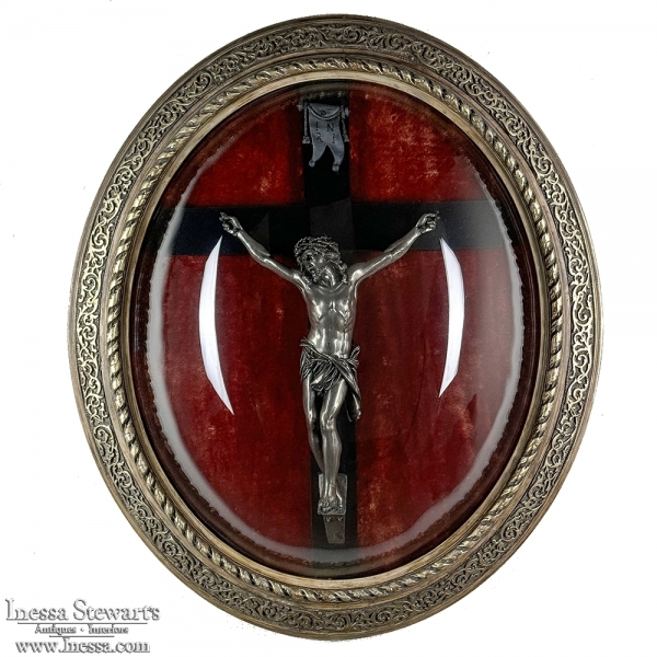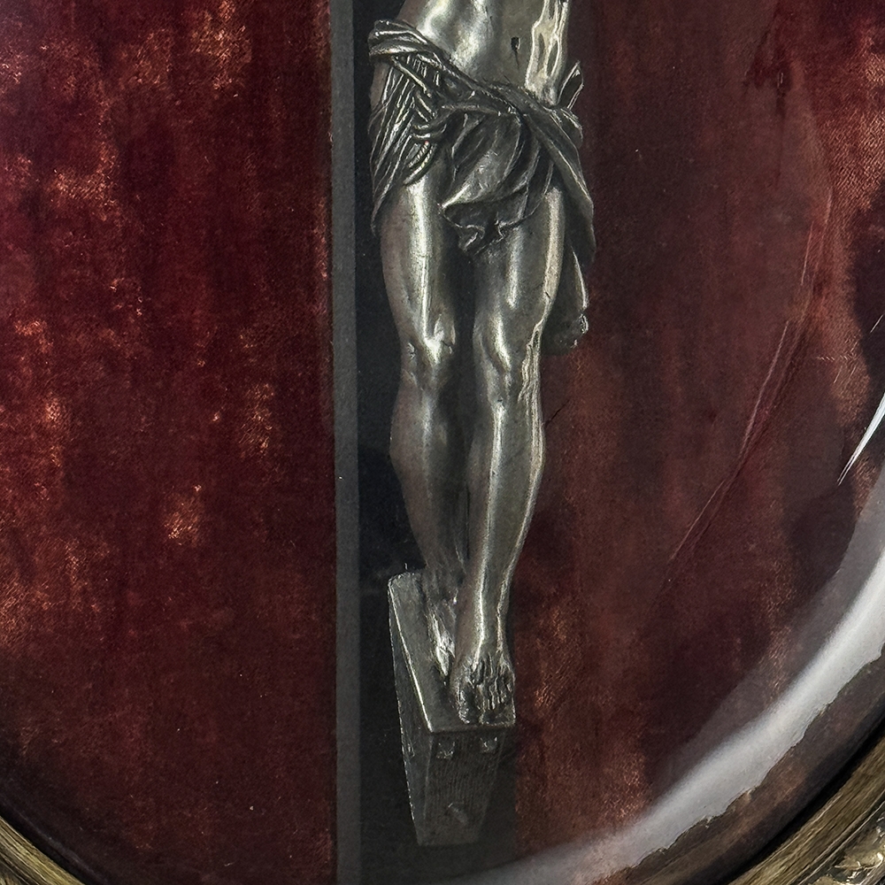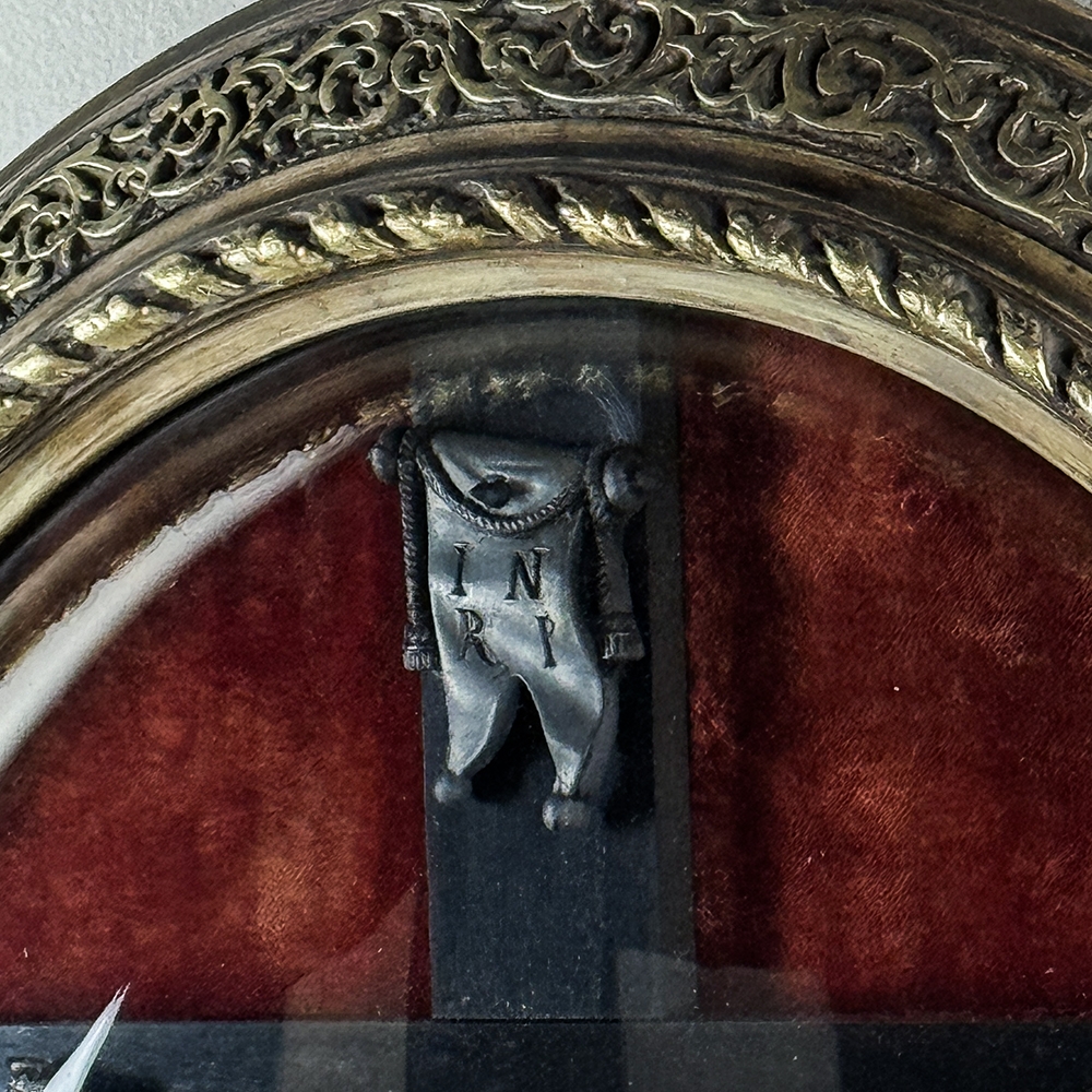 19th Century Crucifix in Oval Giltwood Frame with Glass is remarkably well preserved, and perfect for a devotional addition to your home. The dark stained cross provides a nice contrast to the pewter corpus which exhibits extraordinary detail, all set on a background of burgundy velvet, which is surrounded by the original giltwood frame and even the domed glass has survived the past century! Note the details in the banner above the corpus, the crown of thorns, and the intricacies of the embossing on the frame. Ideal for over the doorway, a cased opening, or above the headboard or anywhere a reminder of the message of Jesus is desired!