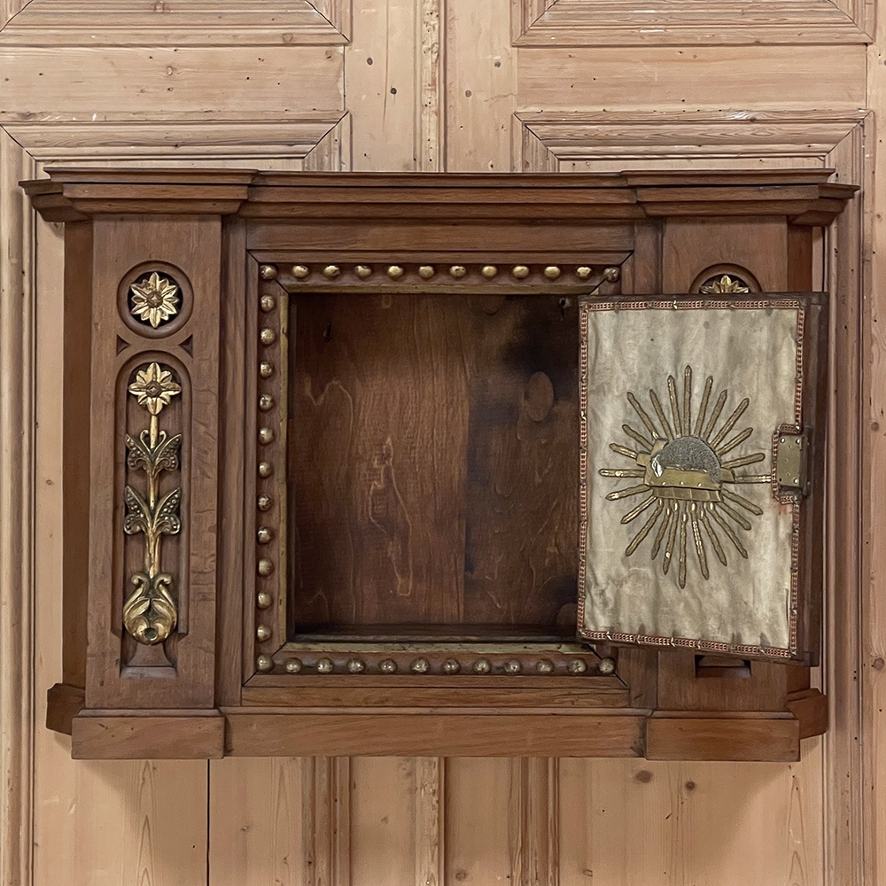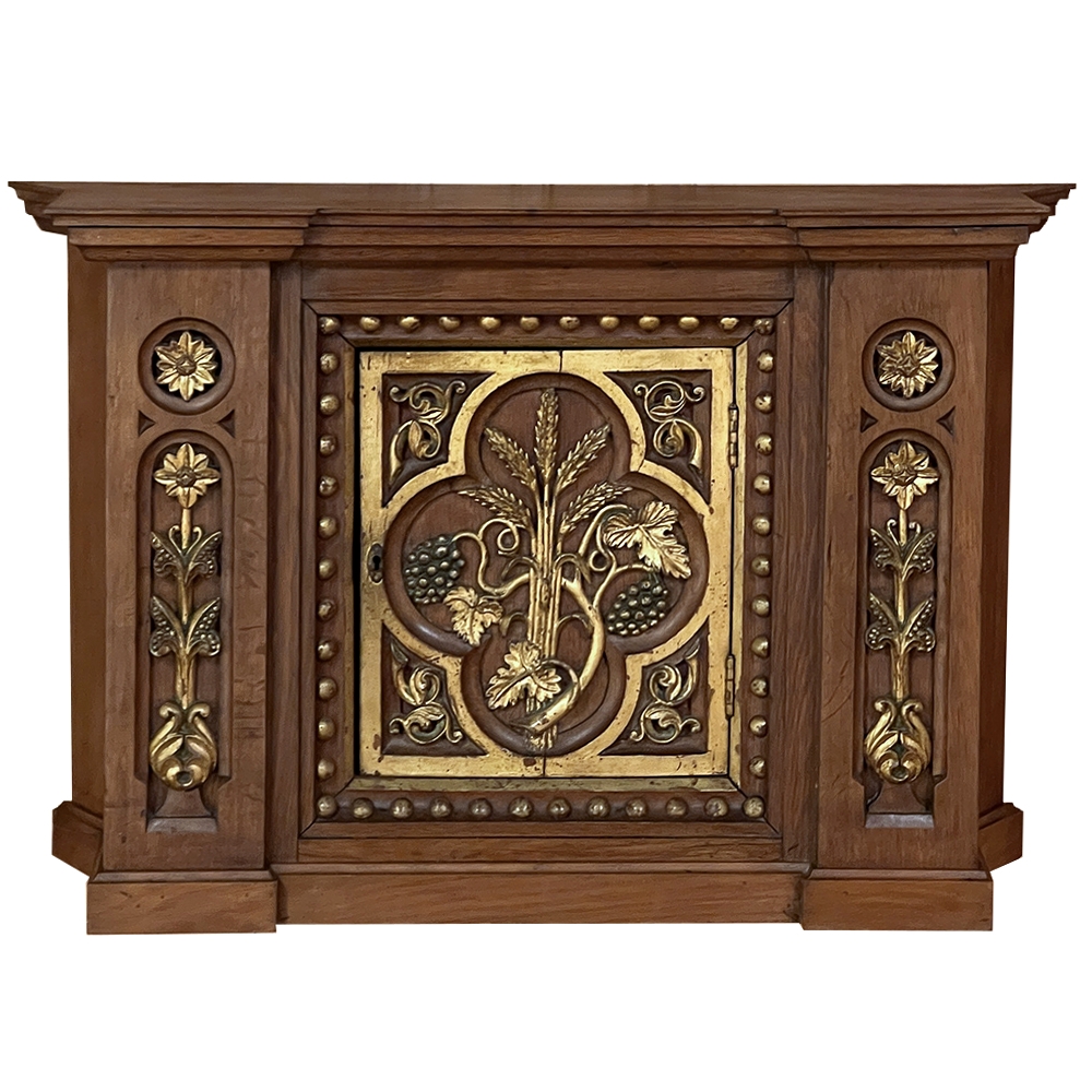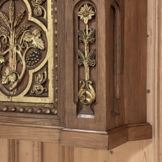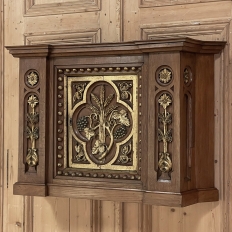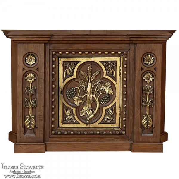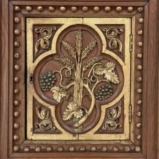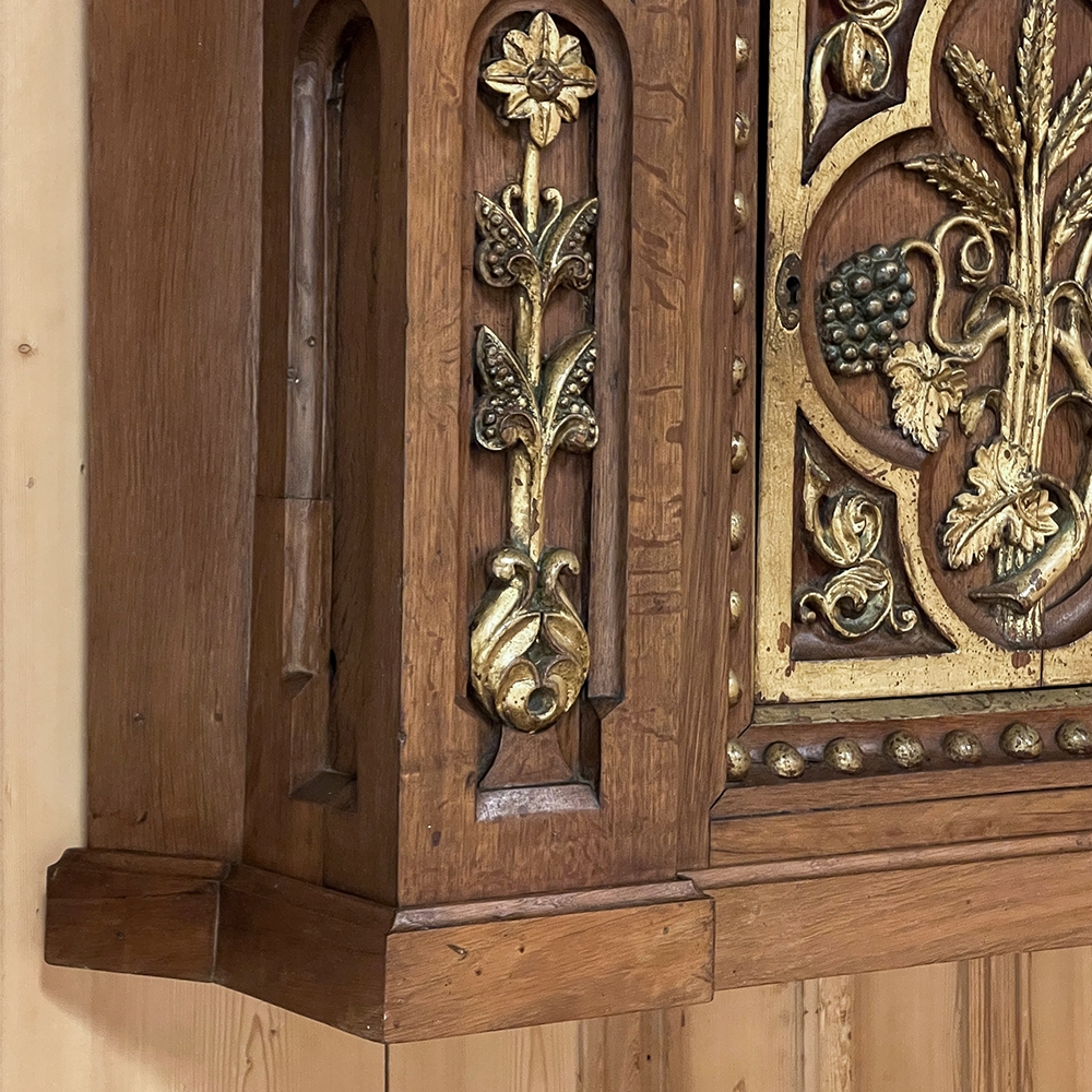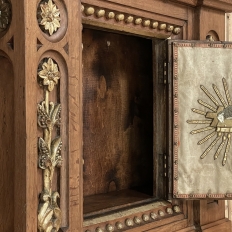 Sale19th Century French Gothic Sacrament Cabinet was artfully sculpted from solid oak and fruitwood to create a remarkable religious artifact designed to be appreciated throughout the ages! The trapezoidal form of the casework is in keeping with the Gothic style, which historians concur originated in the Cathedral of St. Denis during the middle of the 12th century. Boldly molded crown follows the complex contours and overlooks the case below which features a single door flanked by cornerposts that feature pilasters facing front as well as the sides, with recessed arched panels topped with recessed circular frames above filled with carved rosettes highlighted in gold. The arched recesses facing the front are also filled with carved floral and wheat motifs also highlighted in gold, representing the Bread of Life. The door panel, however, steals the show, with a gloriously carved relief work depicting both wheat and fully laden grapevines adding the significance of the Blood of Christ, set in a recessed quatrefoil and surrounded by foliates, framework, and an outer frame of highlighted beading. The door opens to reveal an embroidered panel depicting the Lamb of God resting on a cross above a sunburst motif, with a gimped bordering held in place by star-shaped brass tacks.