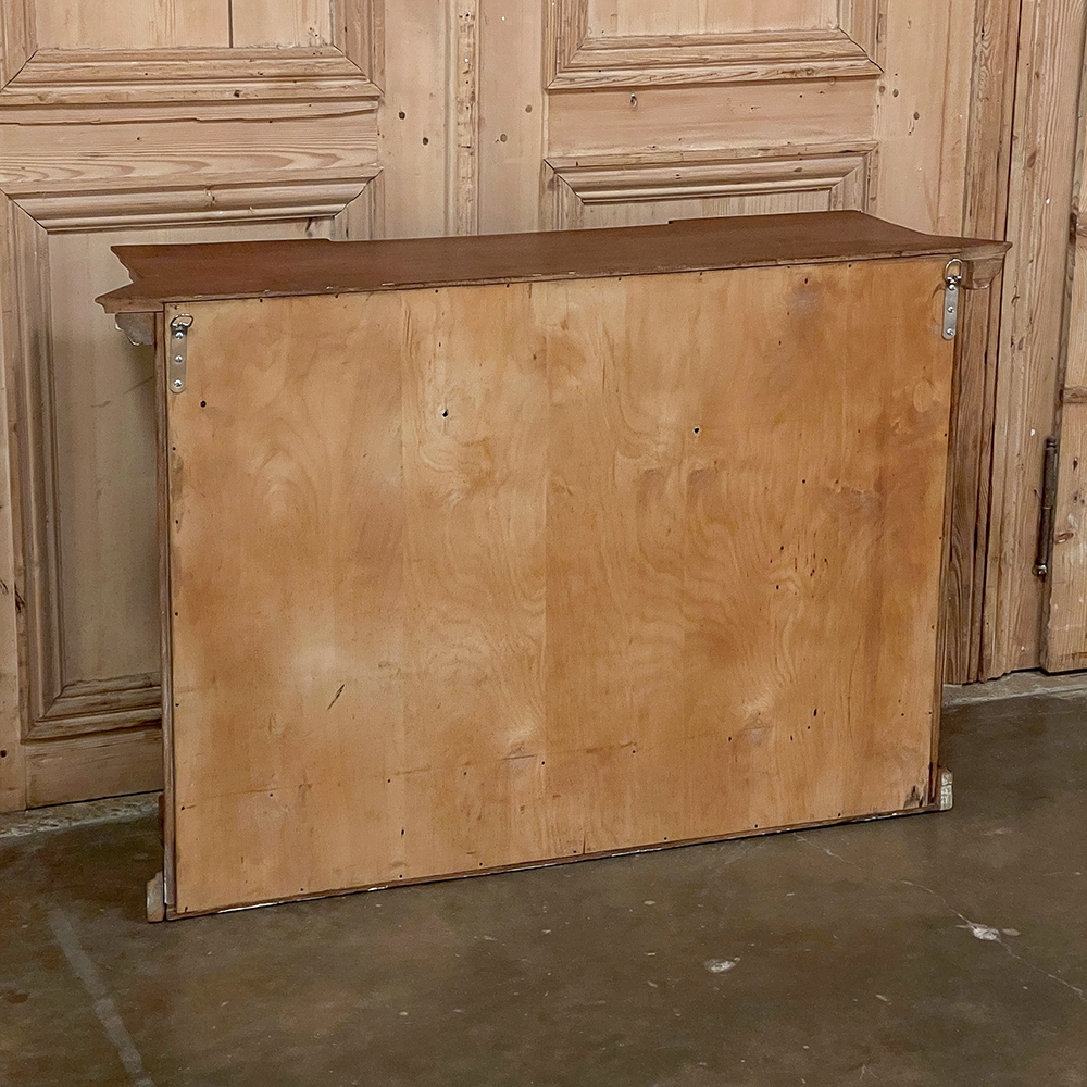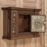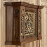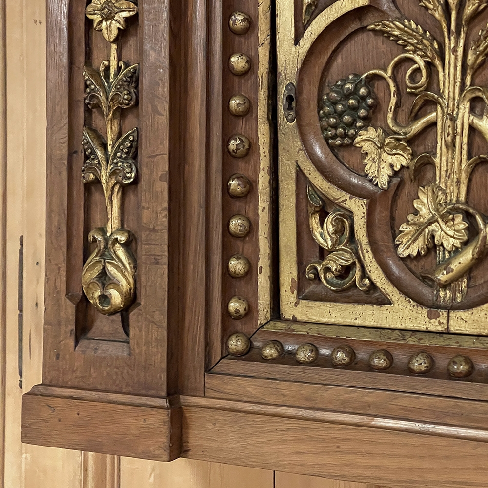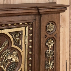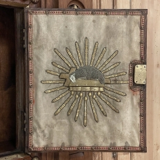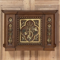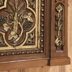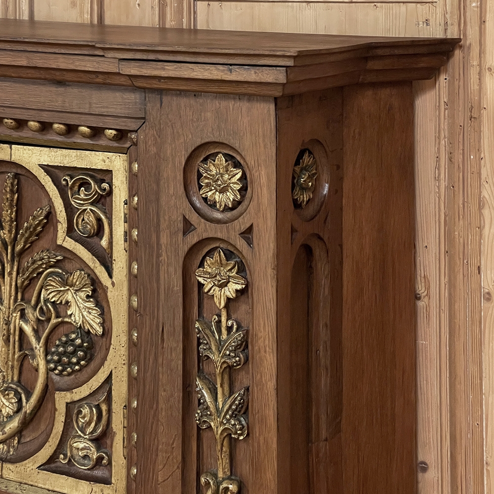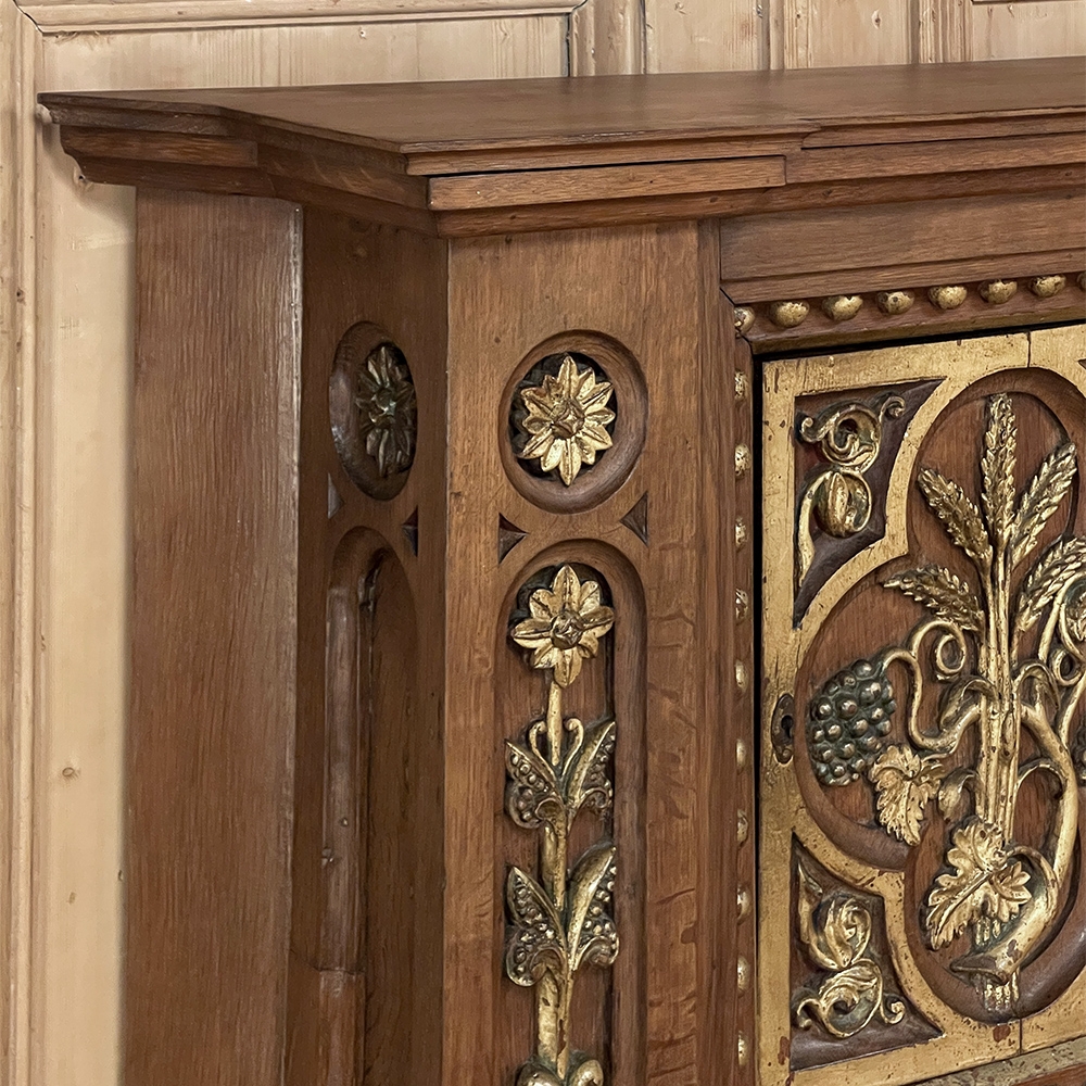 Sale19th Century French Gothic Sacrament Cabinet was artfully sculpted from solid oak and fruitwood to create a remarkable religious artifact designed to be appreciated throughout the ages! The trapezoidal form of the casework is in keeping with the Gothic style, which historians concur originated in the Cathedral of St. Denis during the middle of the 12th century. Boldly molded crown follows the complex contours and overlooks the case below which features a single door flanked by cornerposts that feature pilasters facing front as well as the sides, with recessed arched panels topped with recessed circular frames above filled with carved rosettes highlighted in gold. The arched recesses facing the front are also filled with carved floral and wheat motifs also highlighted in gold, representing the Bread of Life. The door panel, however, steals the show, with a gloriously carved relief work depicting both wheat and fully laden grapevines adding the significance of the Blood of Christ, set in a recessed quatrefoil and surrounded by foliates, framework, and an outer frame of highlighted beading. The door opens to reveal an embroidered panel depicting the Lamb of God resting on a cross above a sunburst motif, with a gimped bordering held in place by star-shaped brass tacks.
