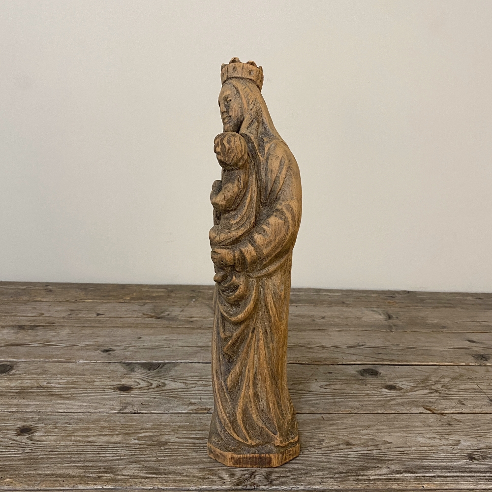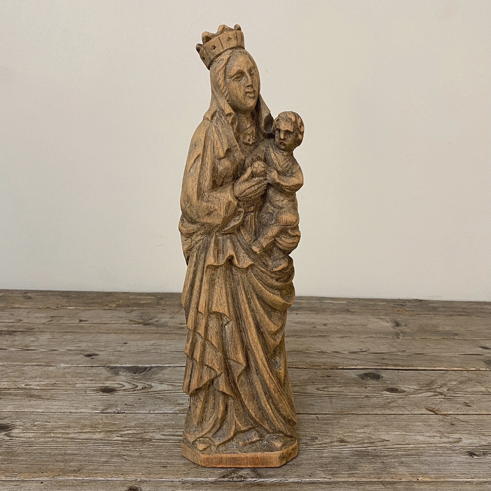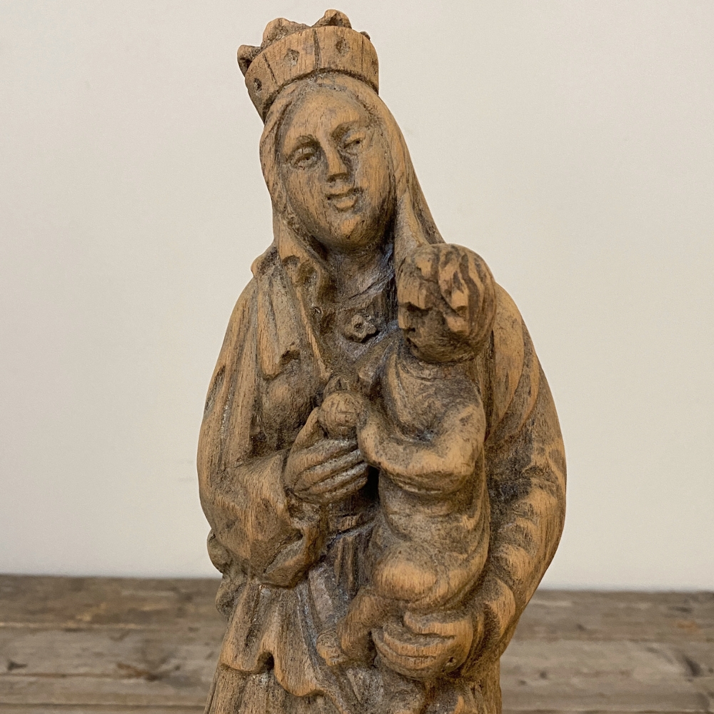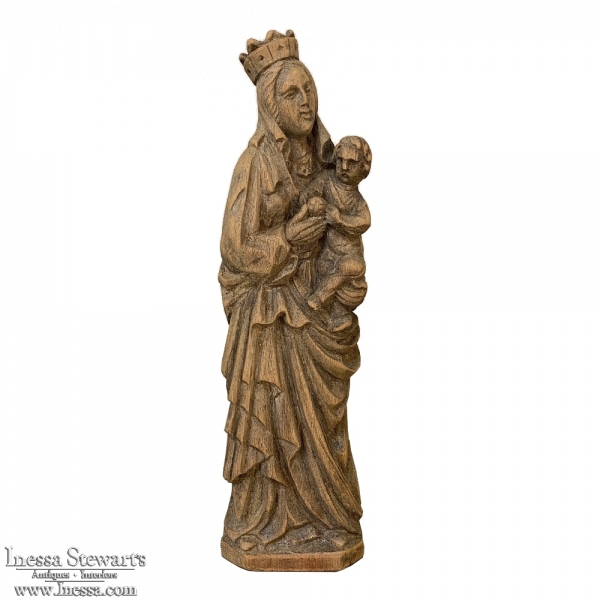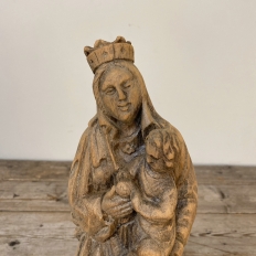 19th Century French Hand-Carved Madonna & Child is a wonderful example of a devotional work, sculpted from a single block of hardwood. The Madonna is depicted wearing a crown, and atop the crown appear to be the sculptor's initials. The natural patina and weathered look add visual appeal.