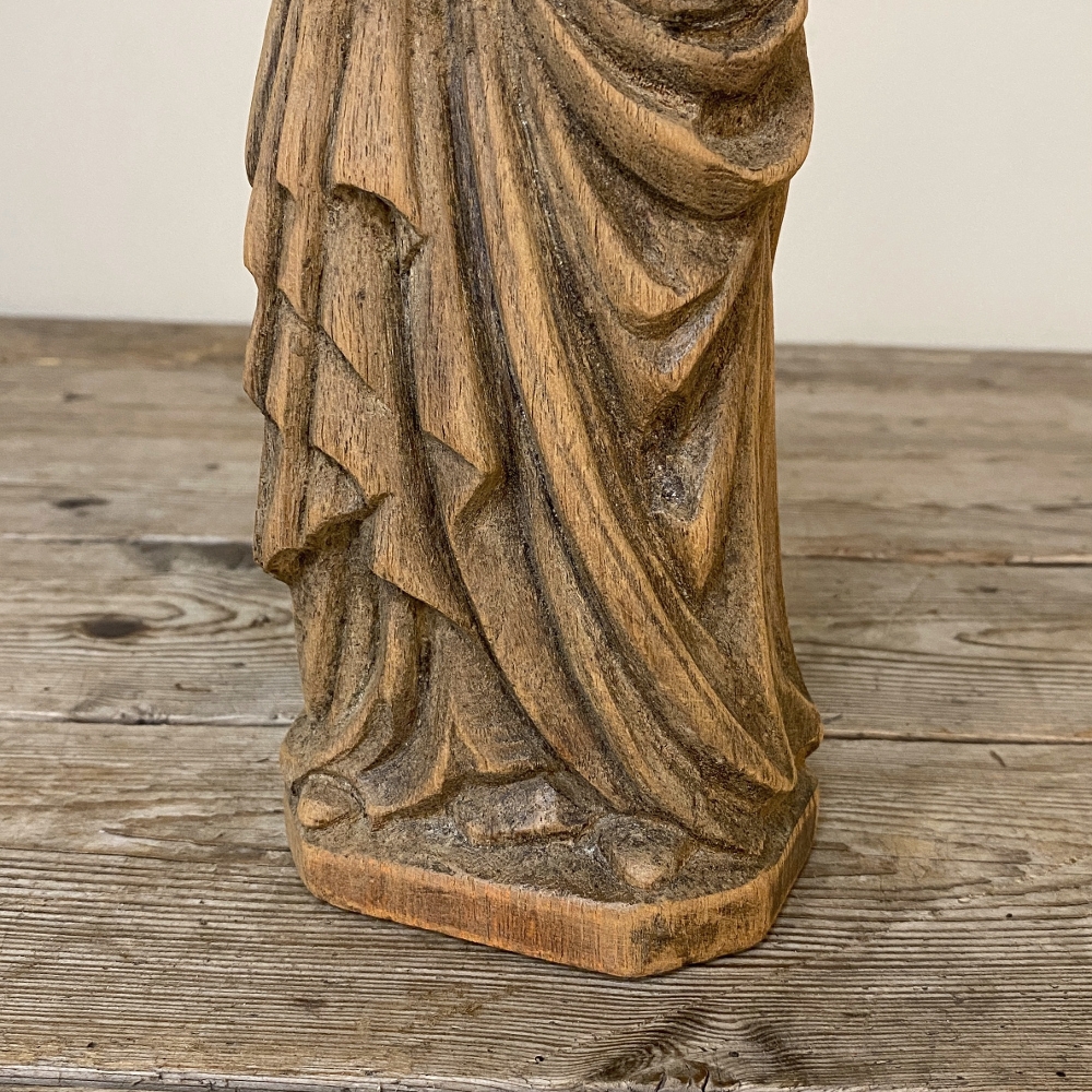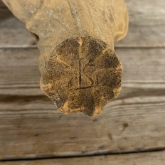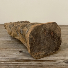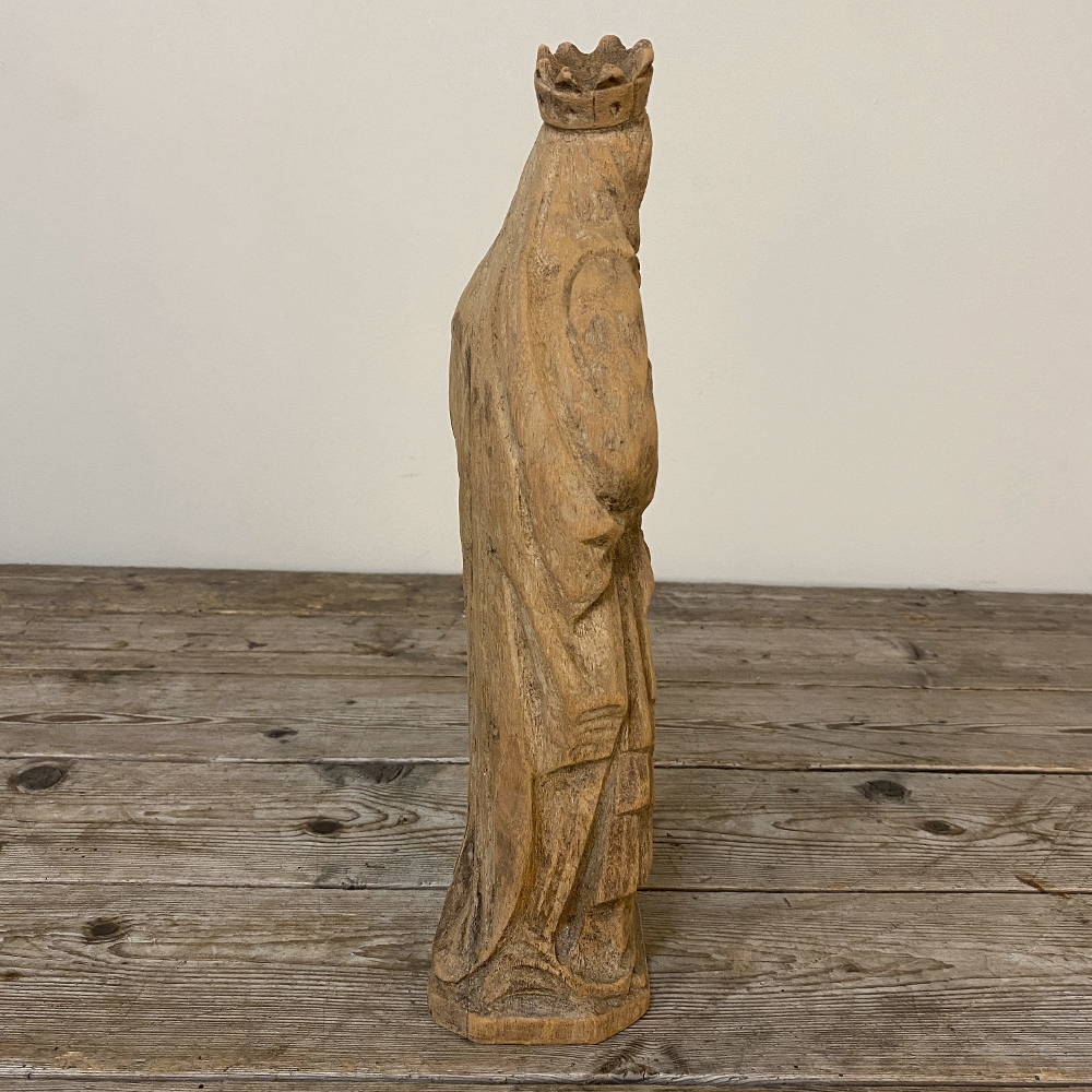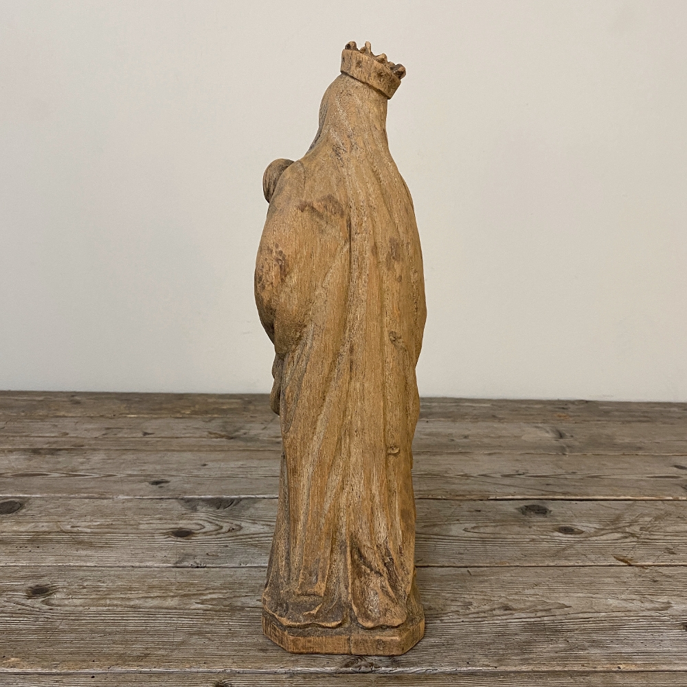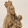 19th Century French Hand-Carved Madonna & Child is a wonderful example of a devotional work, sculpted from a single block of hardwood. The Madonna is depicted wearing a crown, and atop the crown appear to be the sculptor's initials. The natural patina and weathered look add visual appeal.