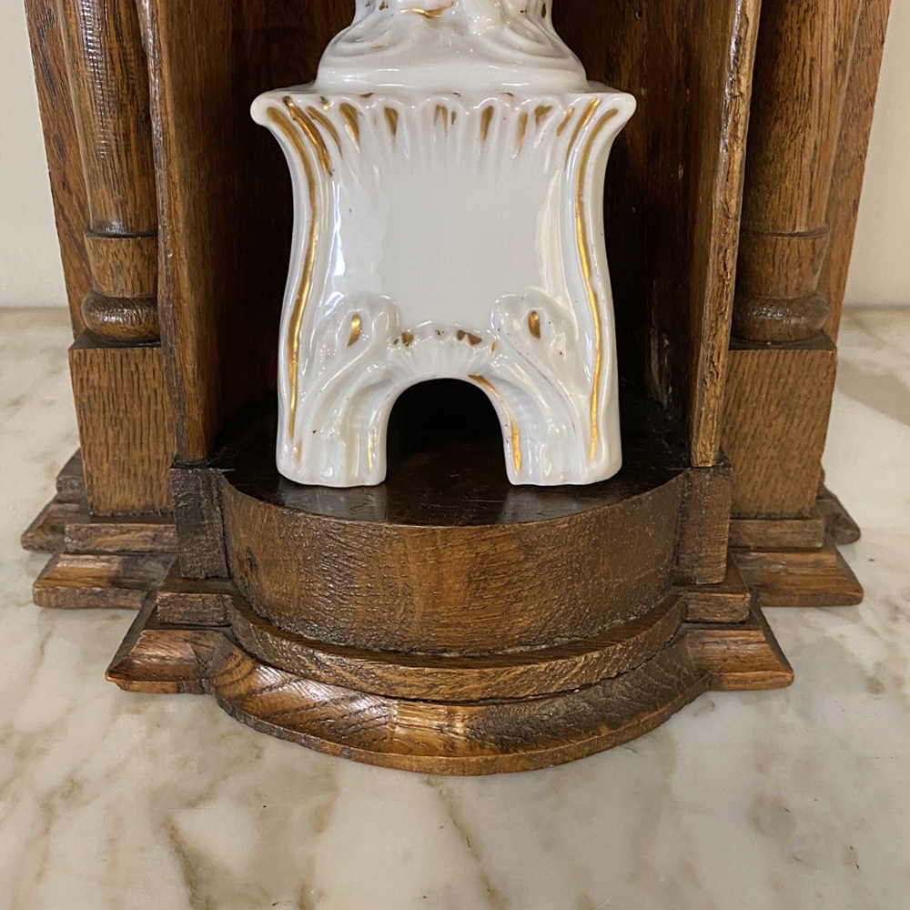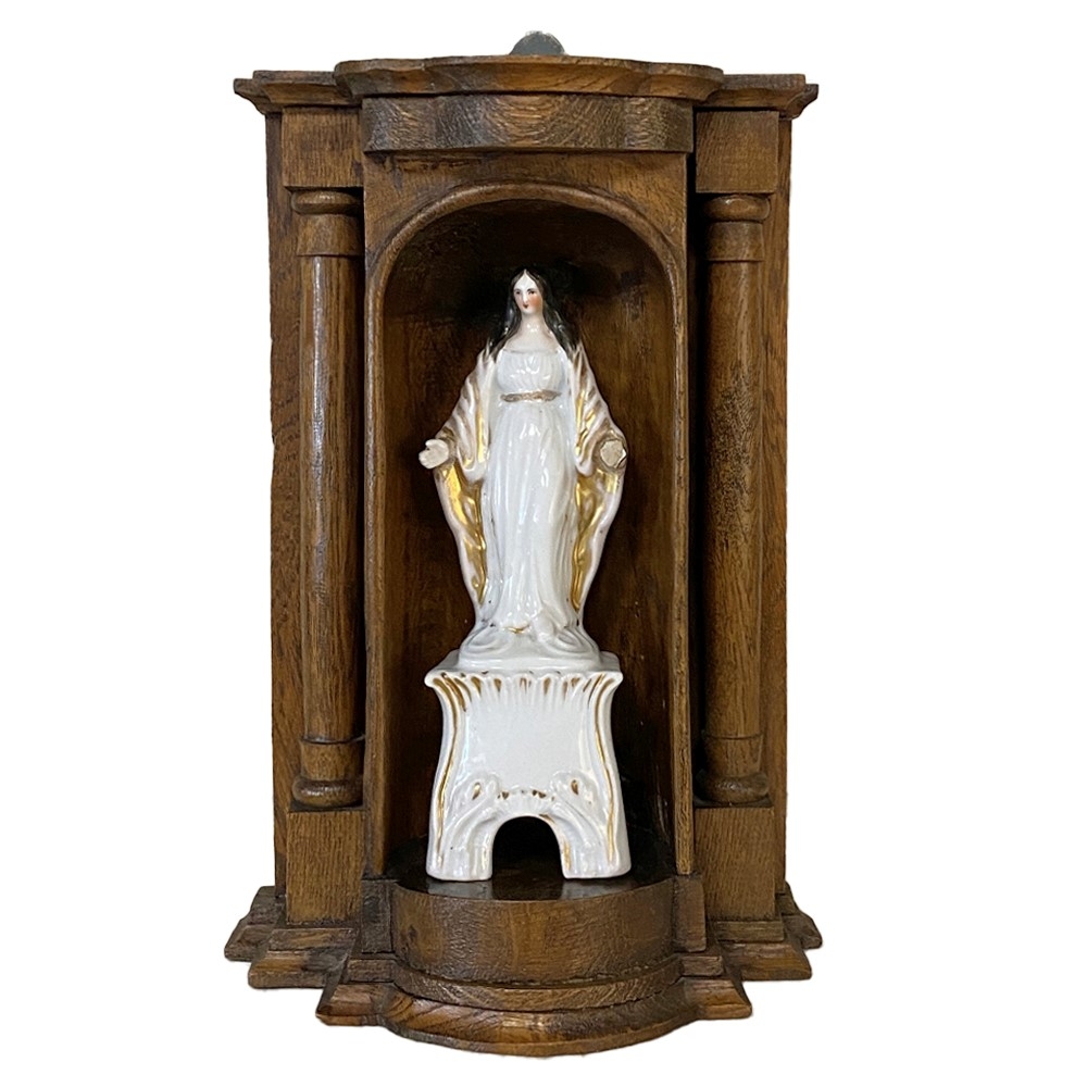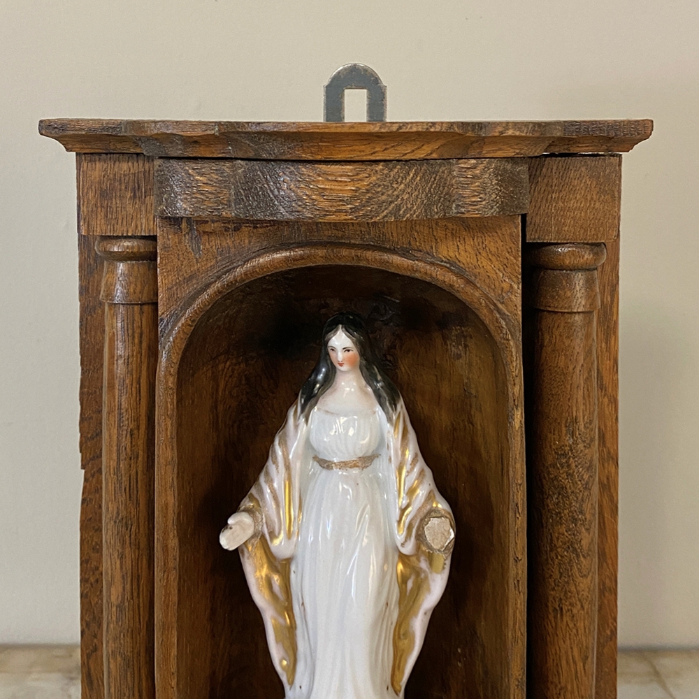 19th Century Painted Porcelain Madonna in Original Hand-Crafted Oak Shrine