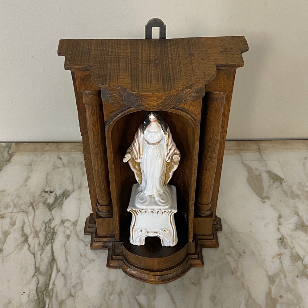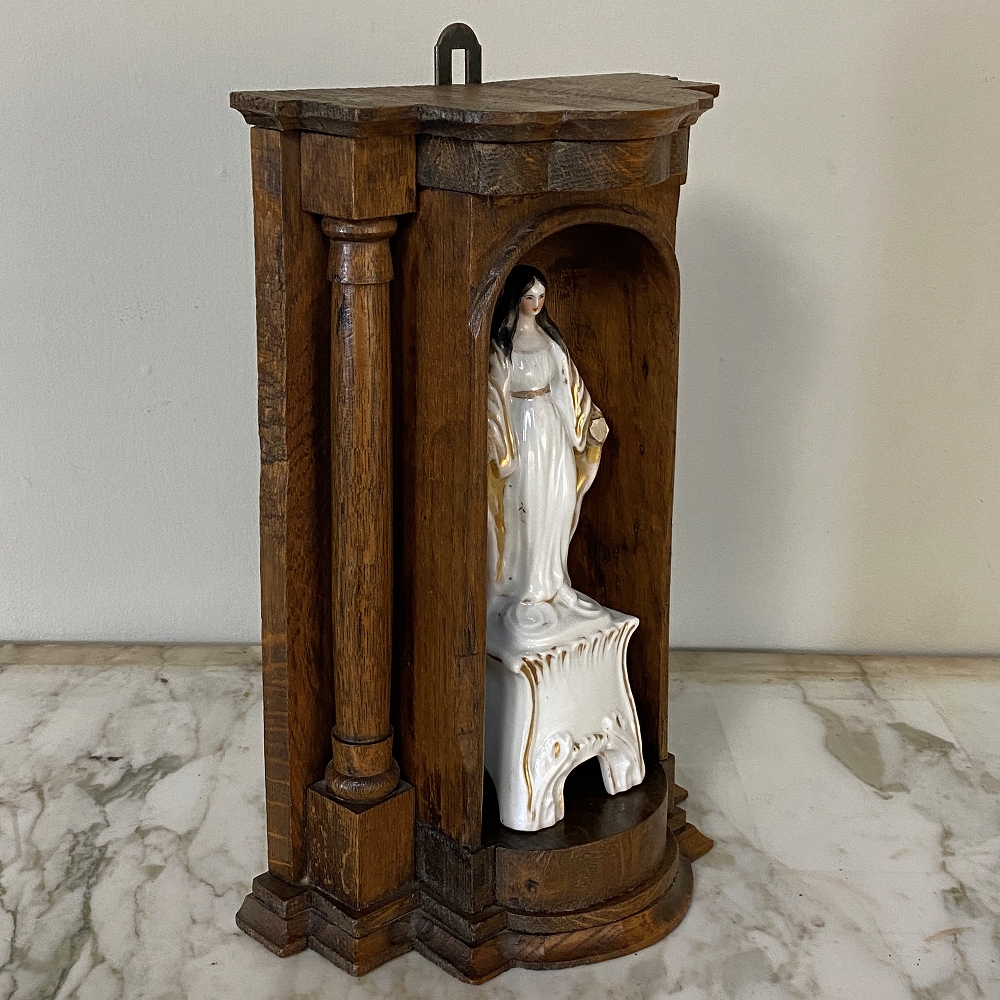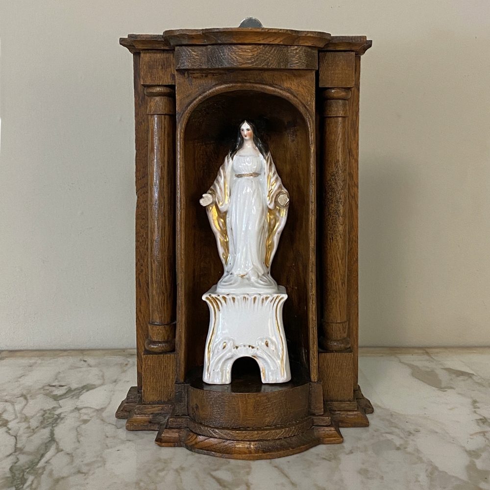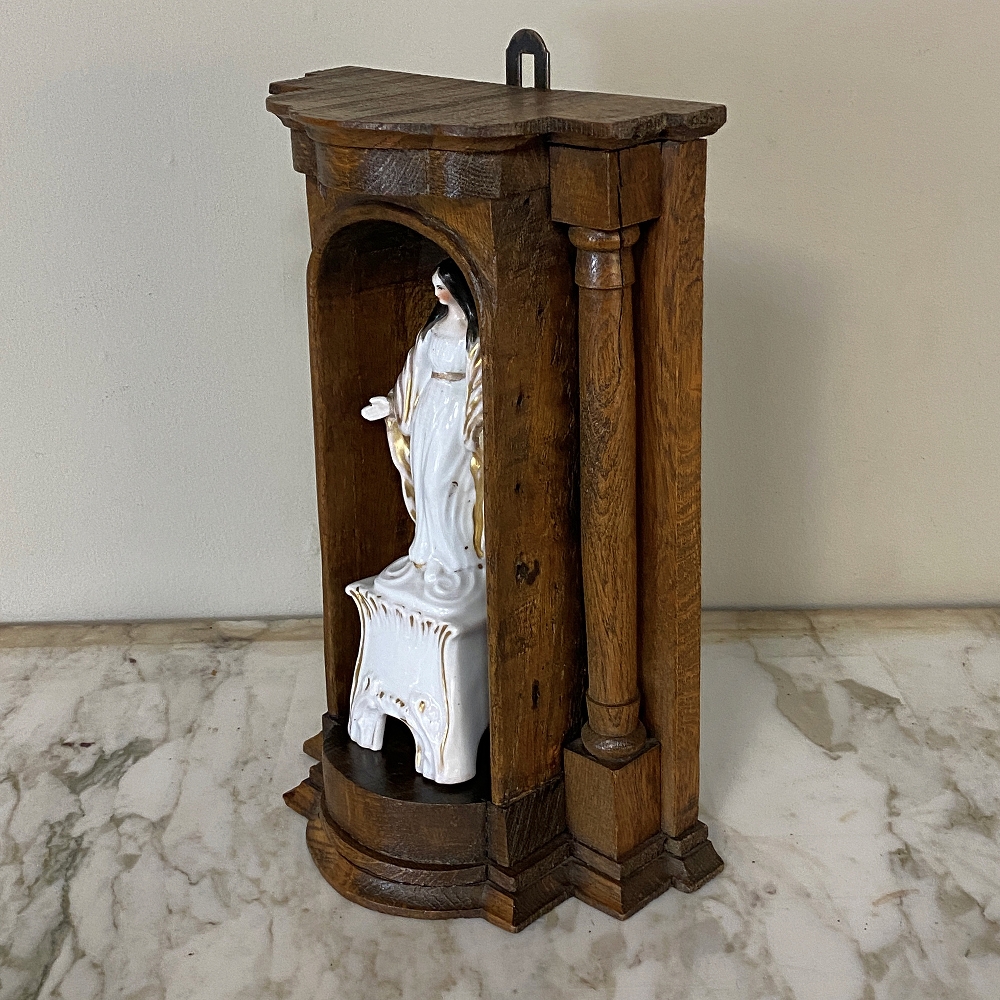 19th Century Painted Porcelain Madonna in Original Hand-Crafted Oak Shrine