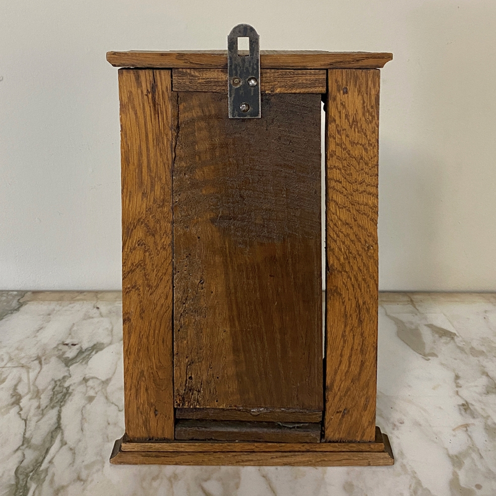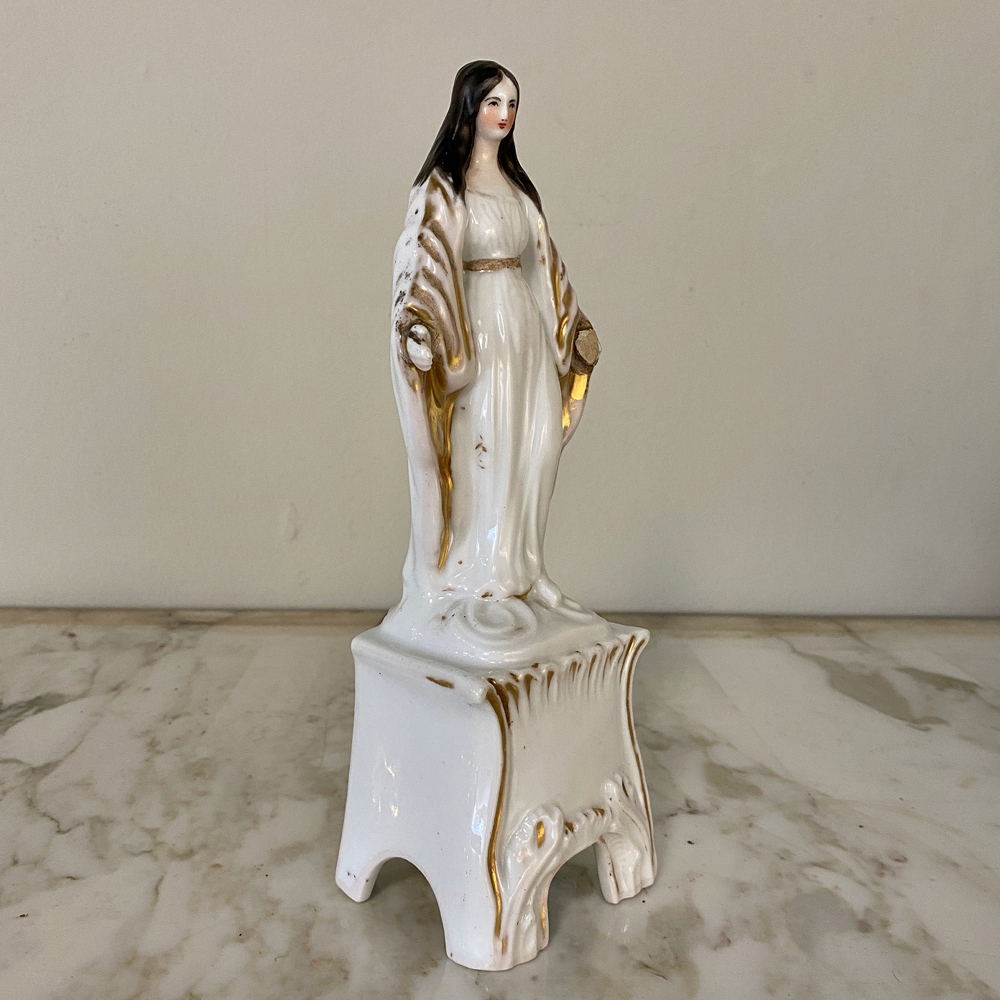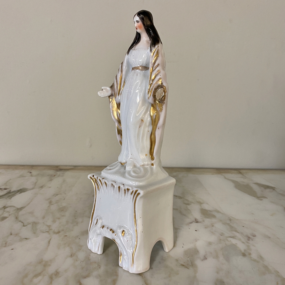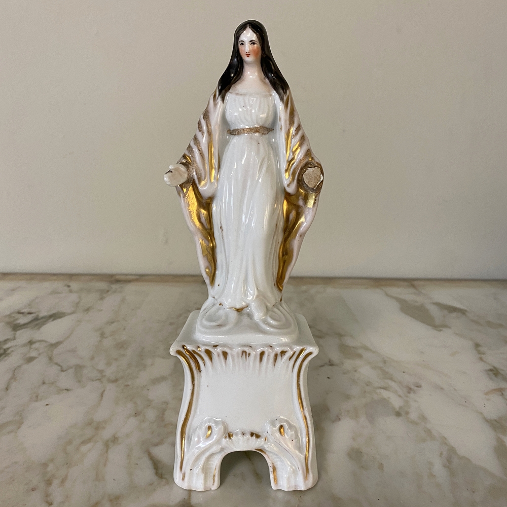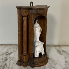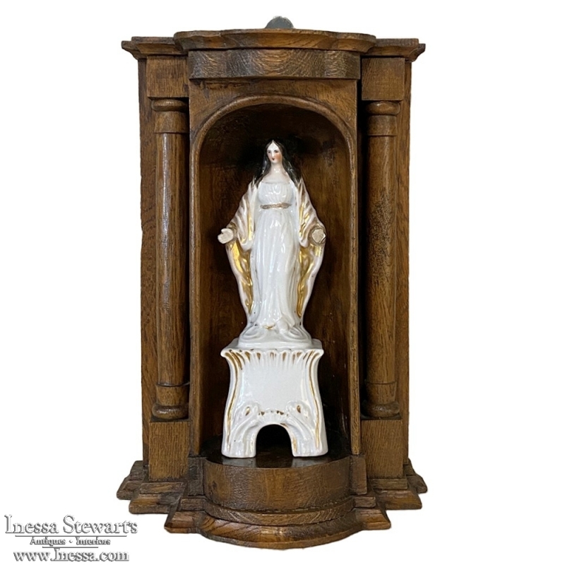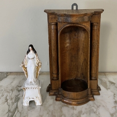 19th Century Painted Porcelain Madonna in Original Hand-Crafted Oak Shrine is the perfect choice for your private devotional area. Designed to mount on the wall or to sit on a surface, the hand-sculpted shrine features multi-tiered molded detail with columns flanking the main arched opening. The beautiful detail of The Madonna in pure white porcelain has been enhanced by the painted hair and gold accents of her raiment as well as the pedestal which is integral to the sculpture.
