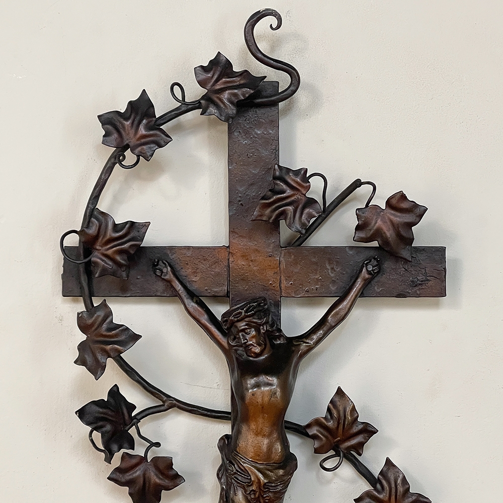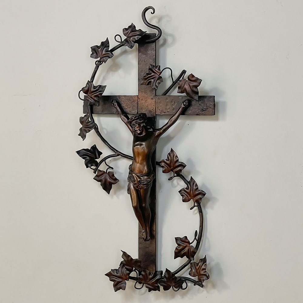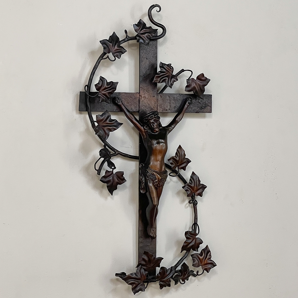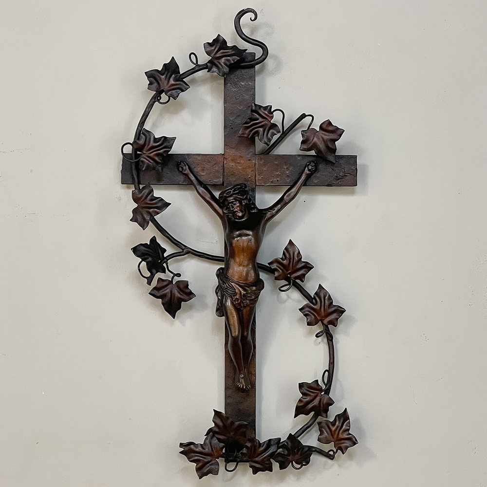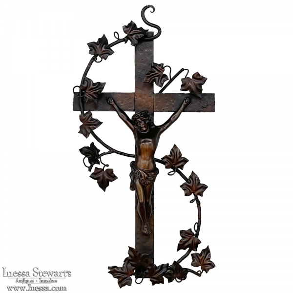 Antique Painted Wrought Iron Crucifix is a splendid work designed to last for centuries! The corpus is cast iron, and mounted upon the forged cross with meticulously wrought grapevine and leaves intertwining the work. A subtle bronze colored finish has been applied adding a wonderful aged tone to the work.