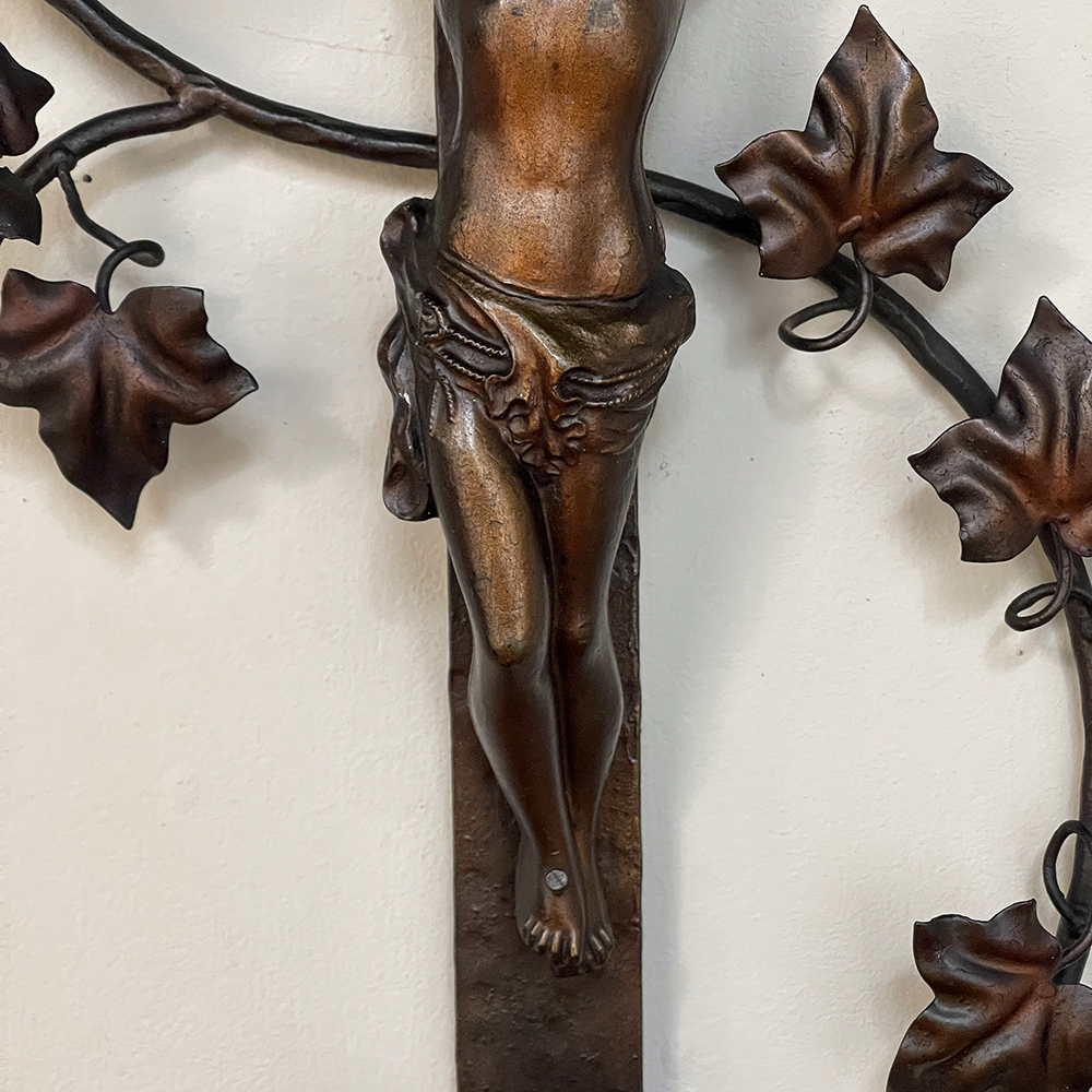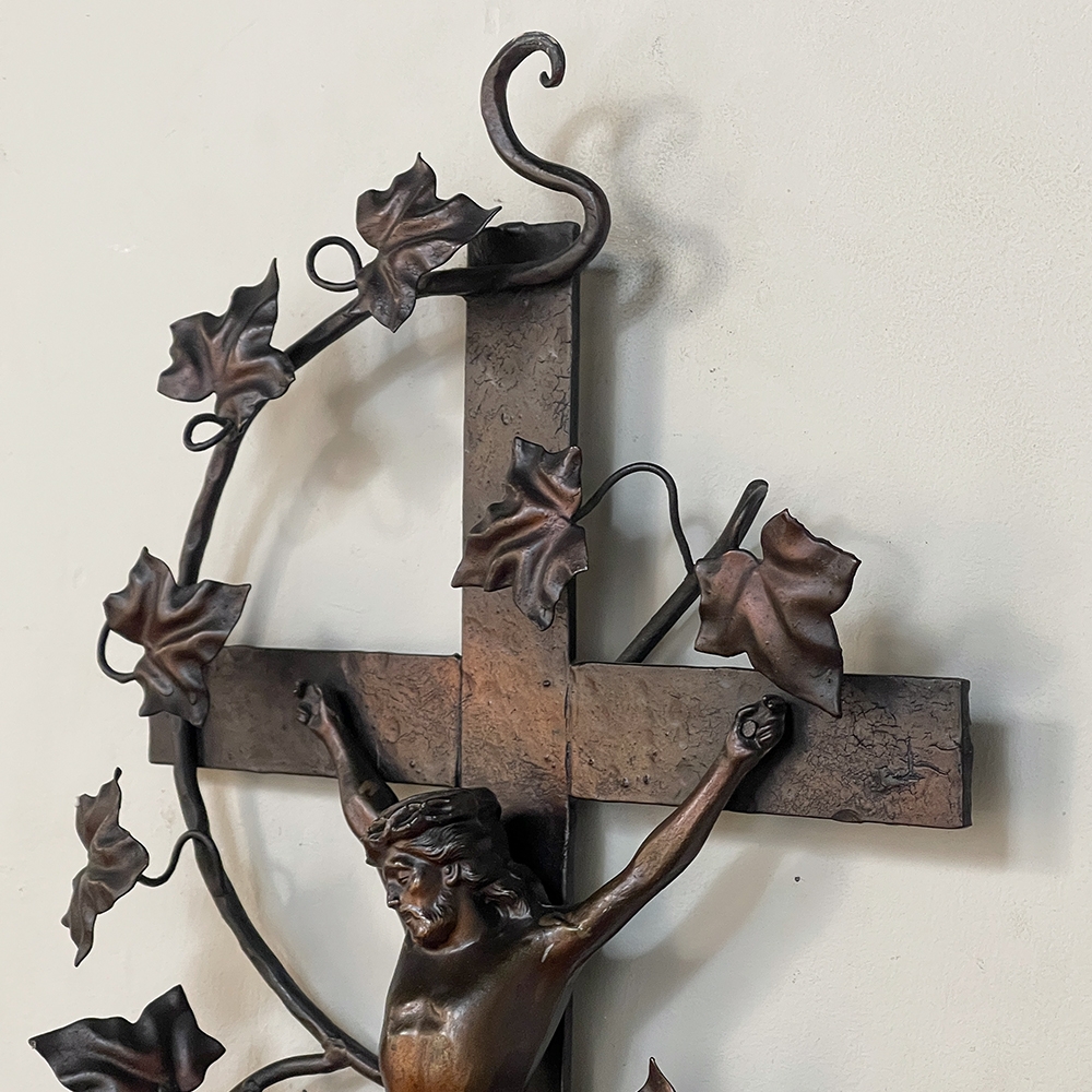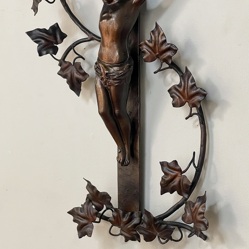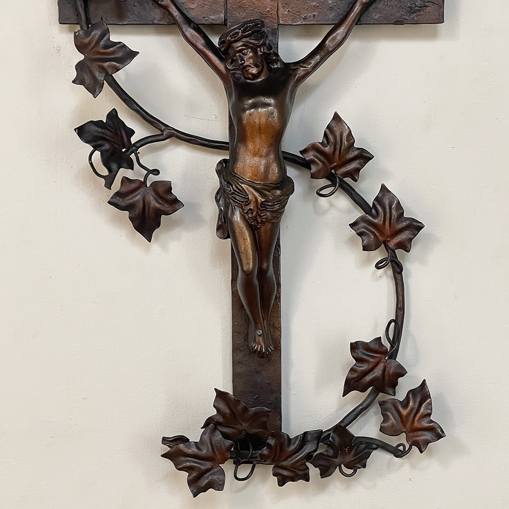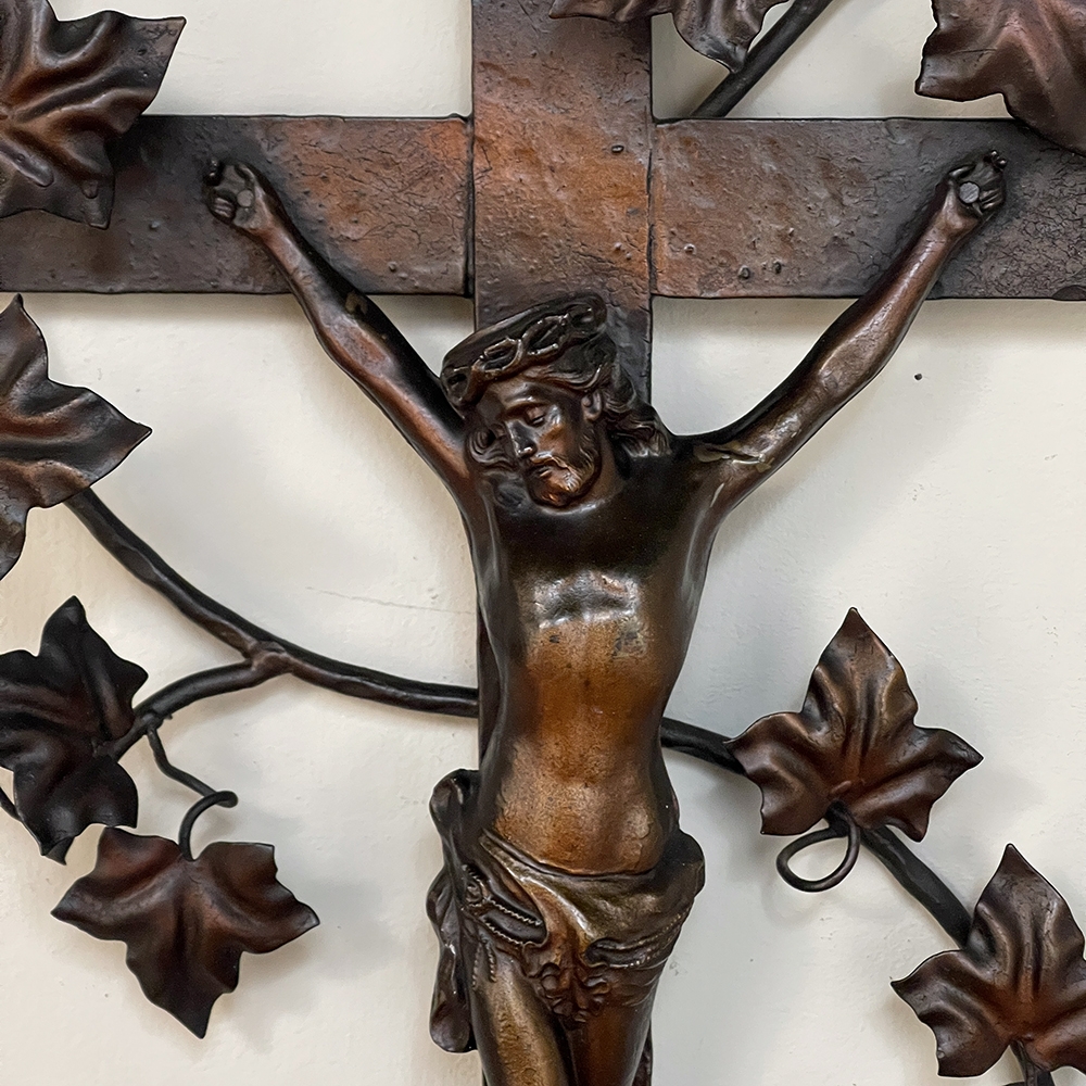 Antique Painted Wrought Iron Crucifix is a splendid work designed to last for centuries! The corpus is cast iron, and mounted upon the forged cross with meticulously wrought grapevine and leaves intertwining the work. A subtle bronze colored finish has been applied adding a wonderful aged tone to the work.