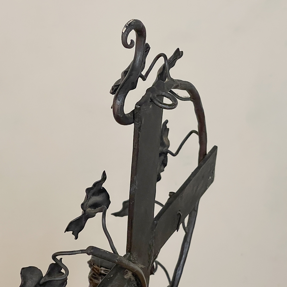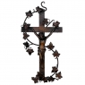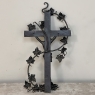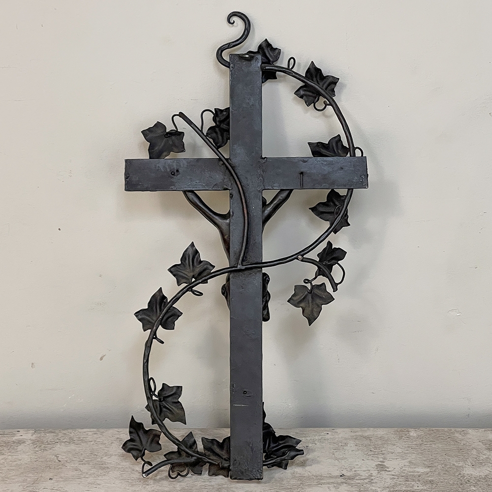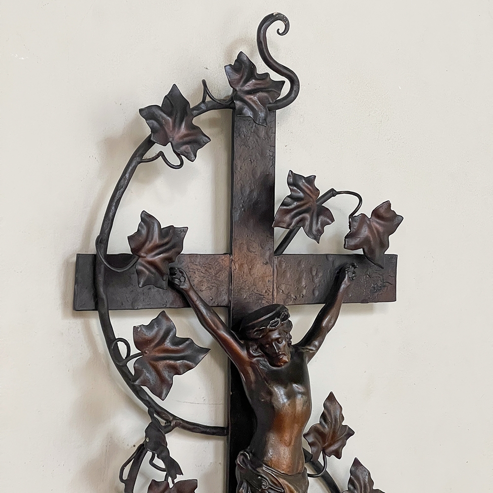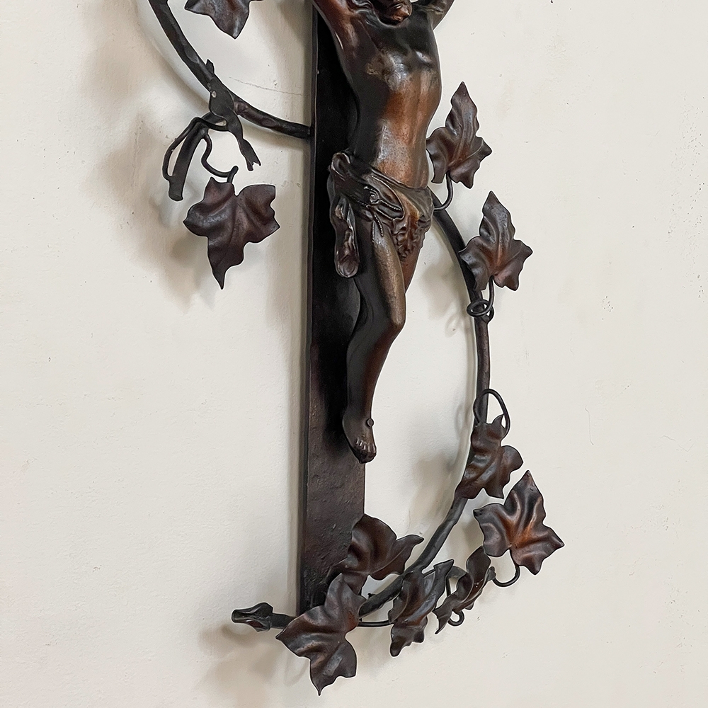 Antique Painted Wrought Iron Crucifix is a splendid work designed to last for centuries! The corpus is cast iron, and mounted upon the forged cross with meticulously wrought grapevine and leaves intertwining the work. A subtle bronze colored finish has been applied adding a wonderful aged tone to the work.