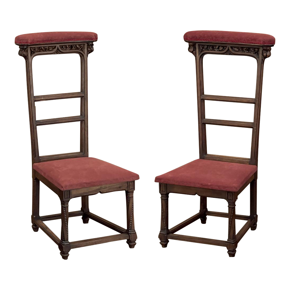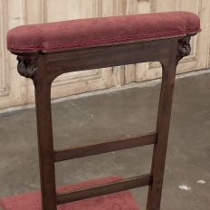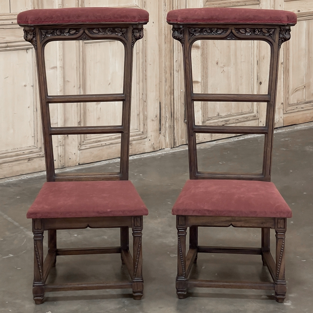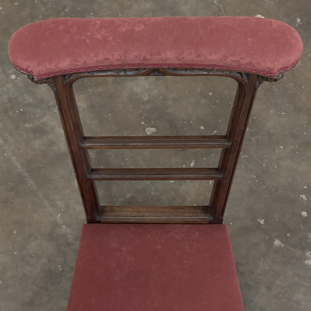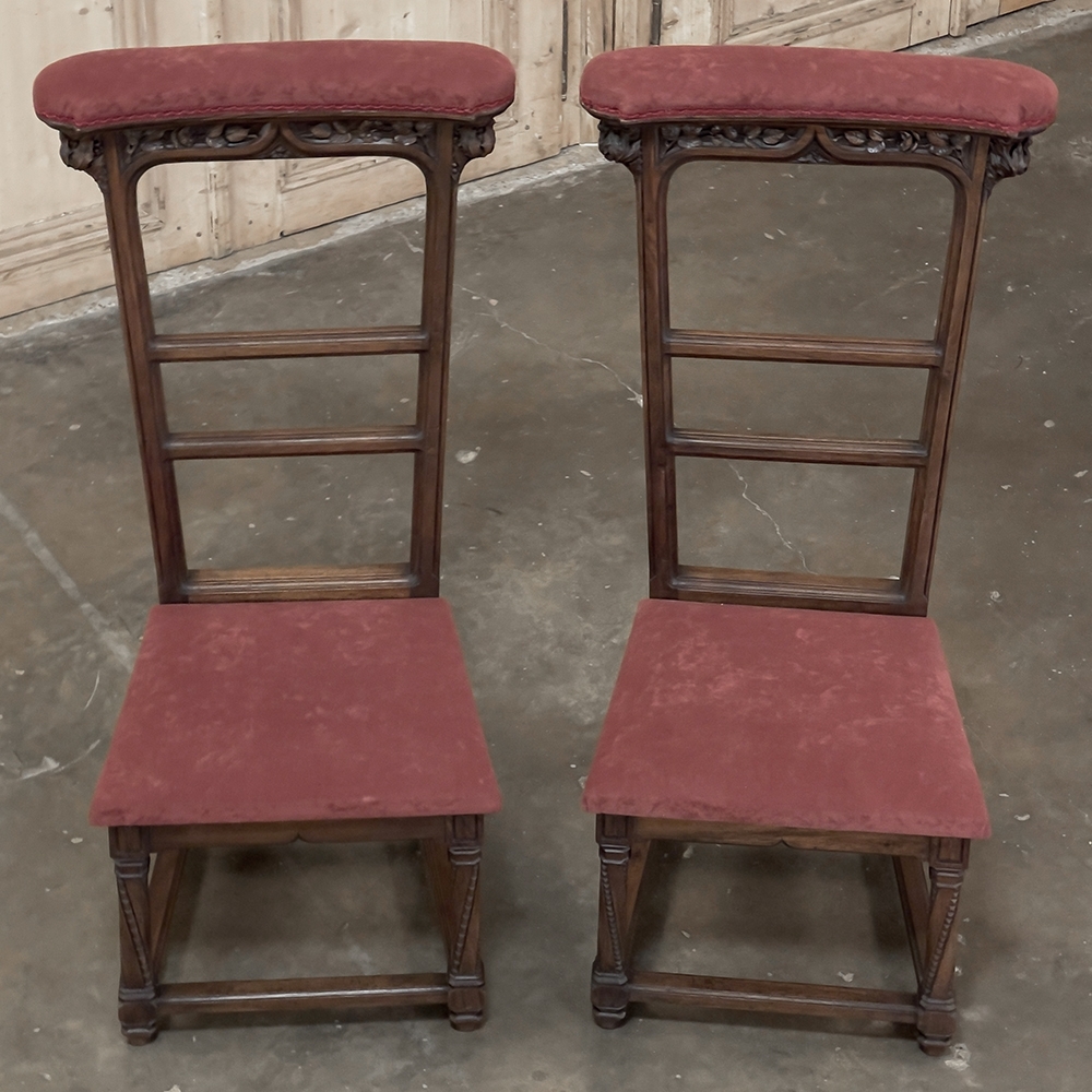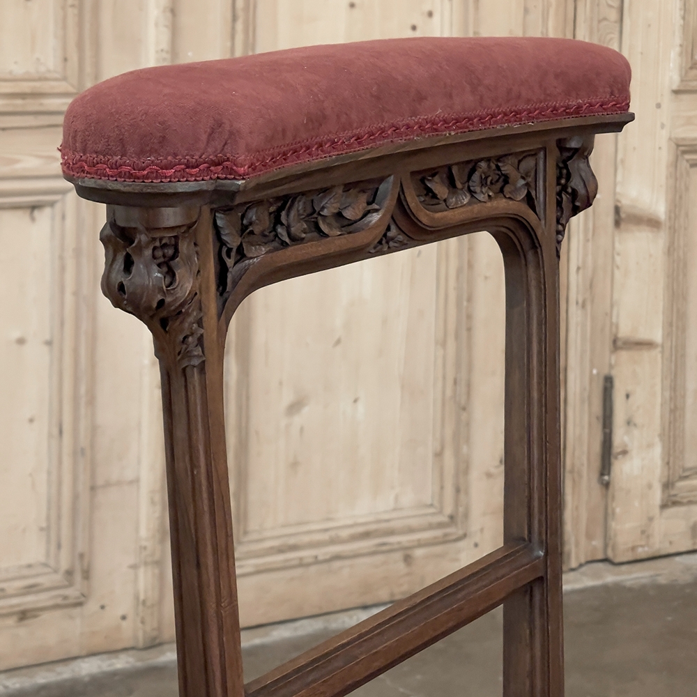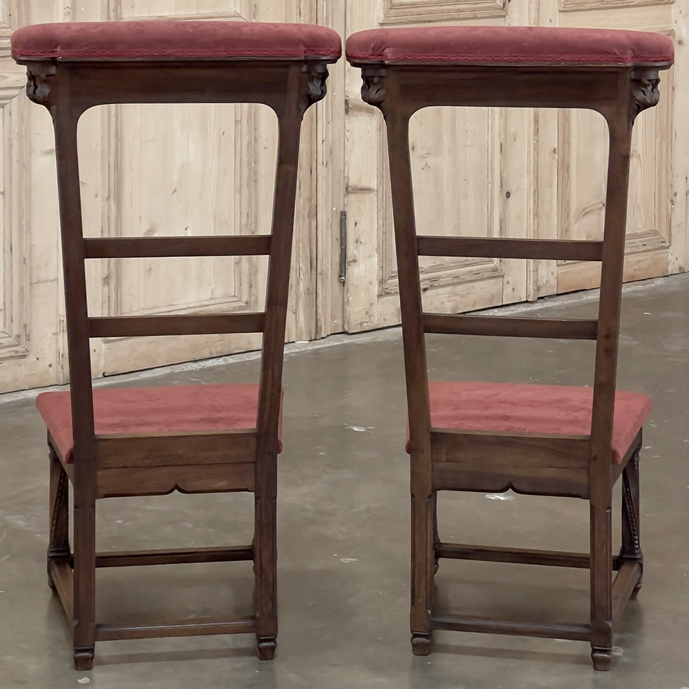 Pair 19th Century French Walnut Neogothic Prayer Kneelers are an interesting design, with timeless styling that dates back almost a thousand years, yet with a lightweight structure that makes them easy to move about the home. Fine walnut was employed to create the visually open architecture, with two tall uprights connected at the kneeler and with two cross stretchers. The four legs below, the front ones being carved with spiral, beaded fluting, are connected yet again with four stretchers to add stability. The apron is fairly straightforward, while the topmost portion of the back displays the most elaborate carved detail with bold wraparound acanthus leaves adorning the corners and a floral and foliate spray spanning between the corbels, above which resides the elbow cushioning upholstered in mohair matching the kneeler seat below. Called a prie dieu by the French such a find is unusual as an intact pair!