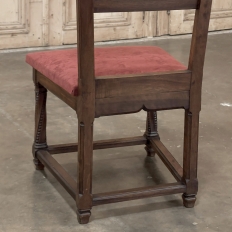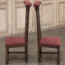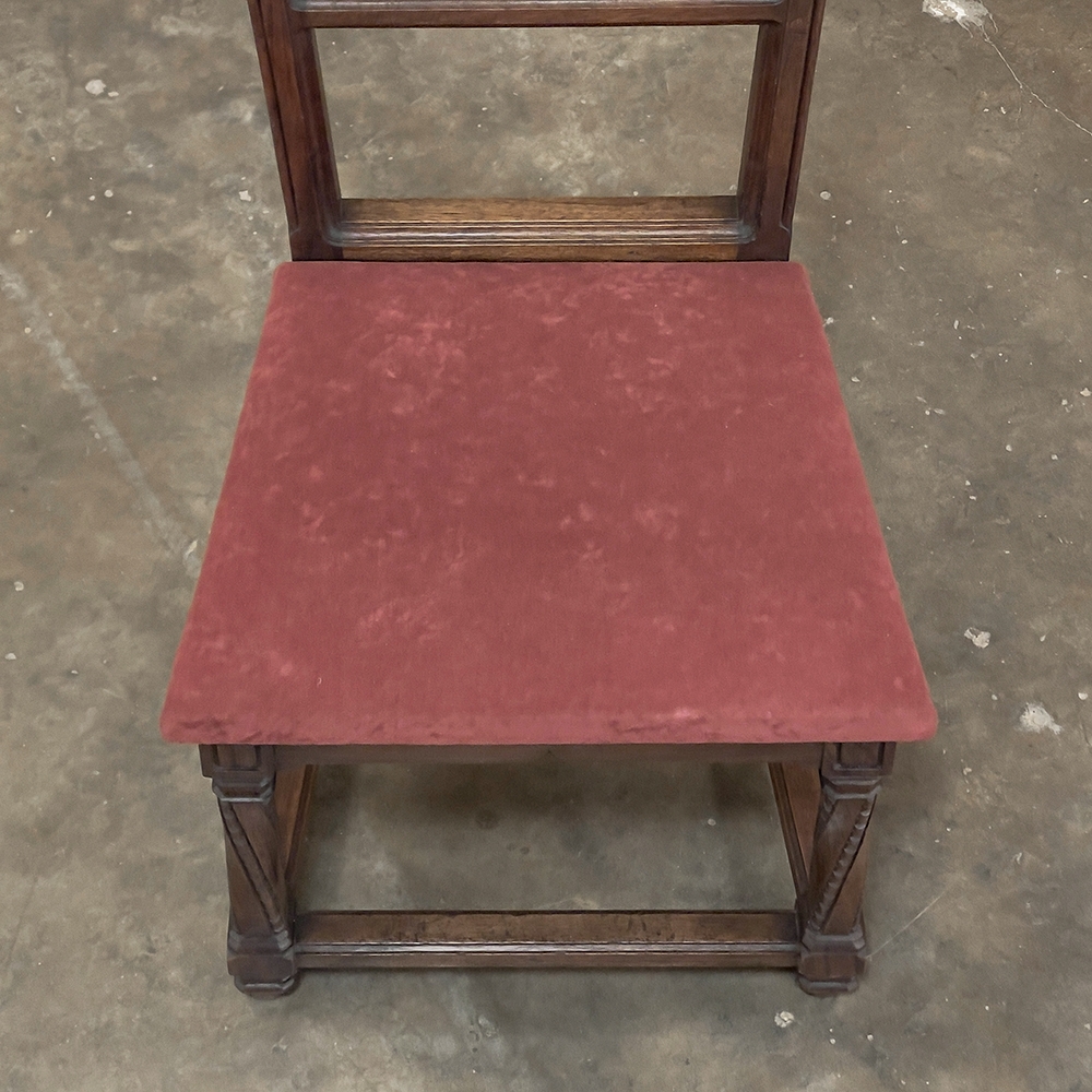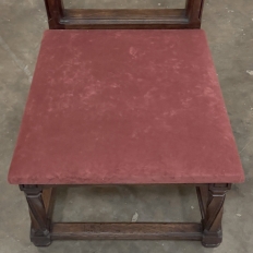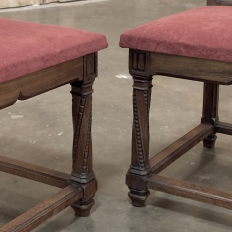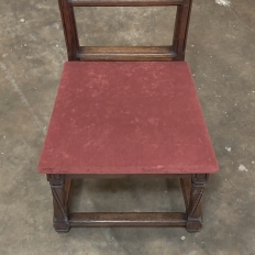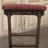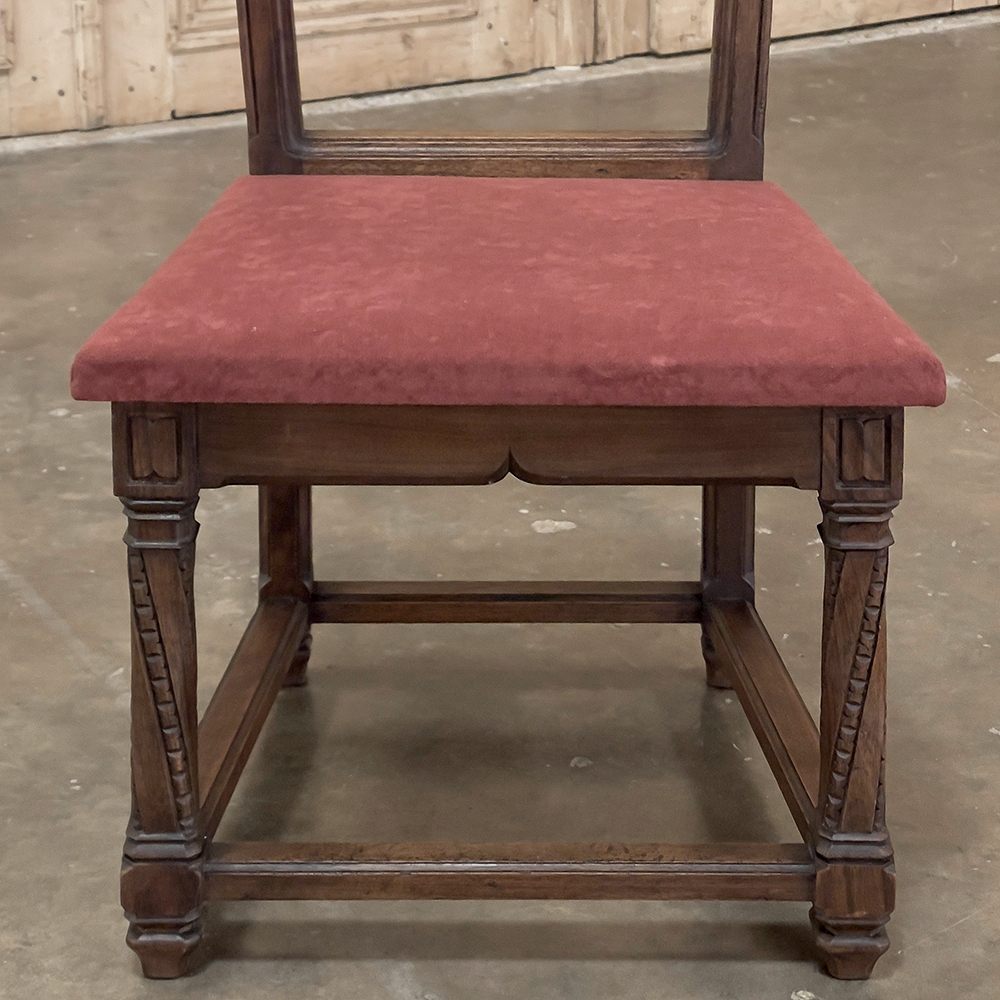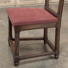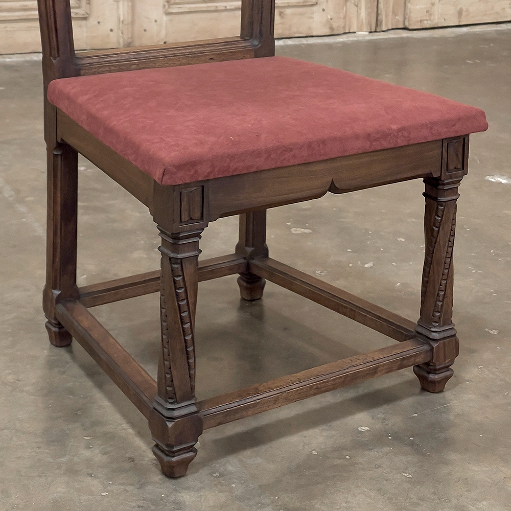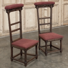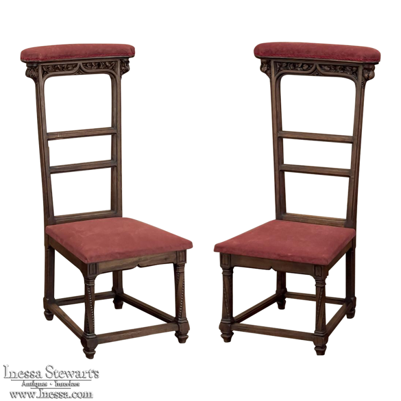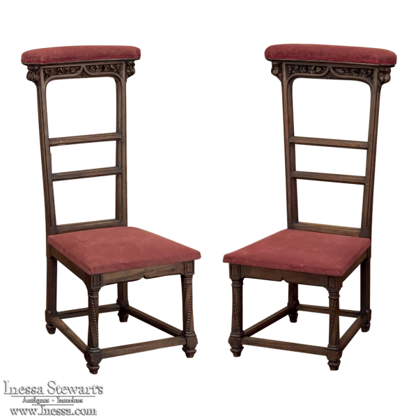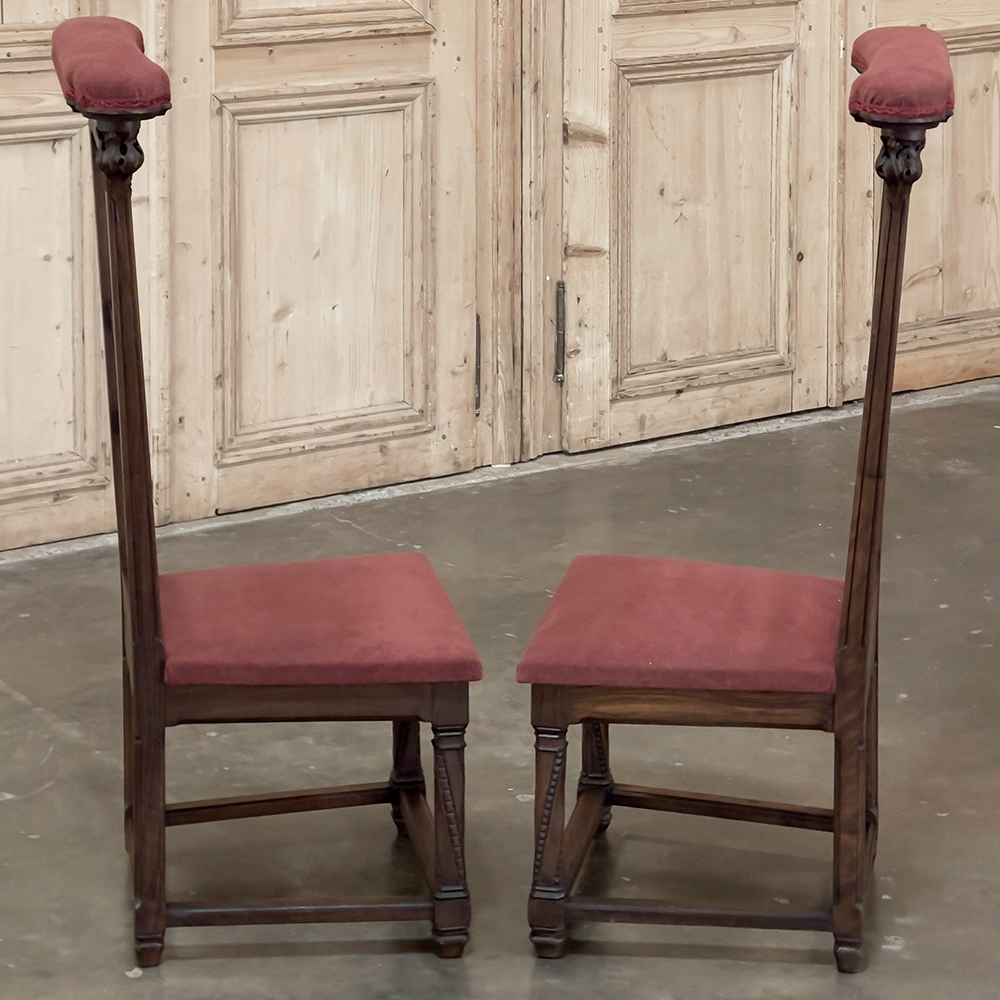 Pair 19th Century French Walnut Neogothic Prayer Kneelers are an interesting design, with timeless styling that dates back almost a thousand years, yet with a lightweight structure that makes them easy to move about the home. Fine walnut was employed to create the visually open architecture, with two tall uprights connected at the kneeler and with two cross stretchers. The four legs below, the front ones being carved with spiral, beaded fluting, are connected yet again with four stretchers to add stability. The apron is fairly straightforward, while the topmost portion of the back displays the most elaborate carved detail with bold wraparound acanthus leaves adorning the corners and a floral and foliate spray spanning between the corbels, above which resides the elbow cushioning upholstered in mohair matching the kneeler seat below. Called a prie dieu by the French such a find is unusual as an intact pair!
