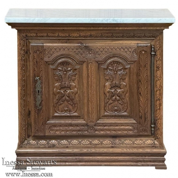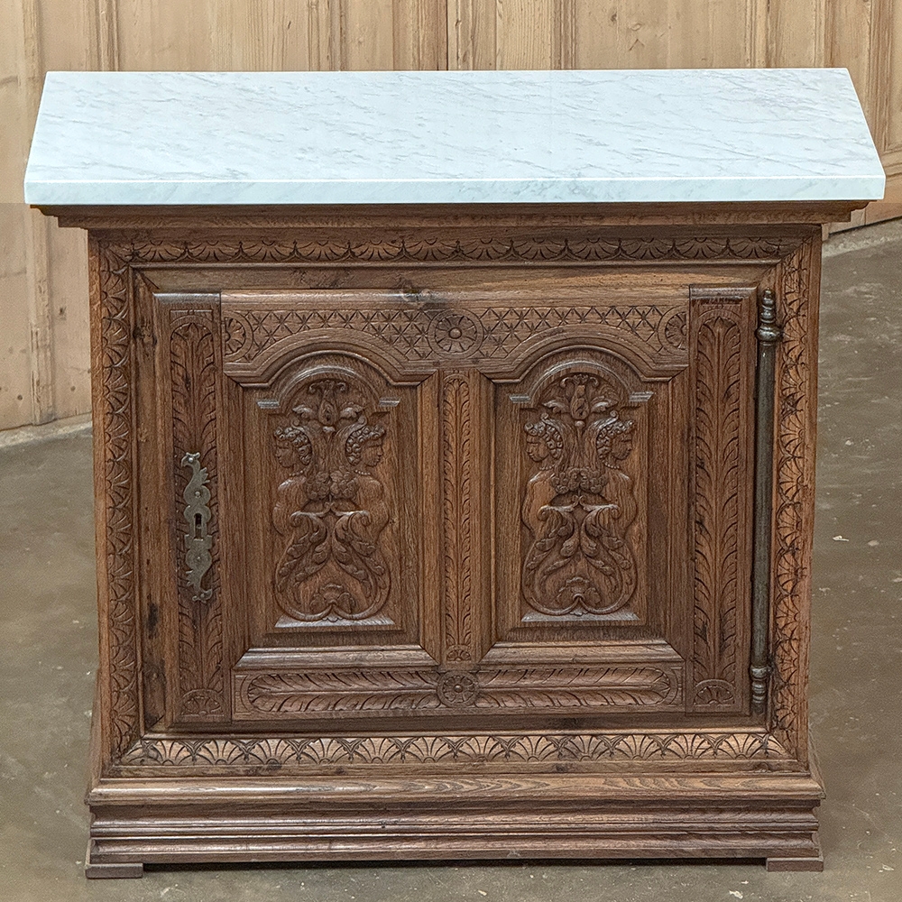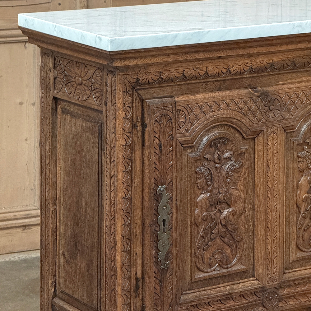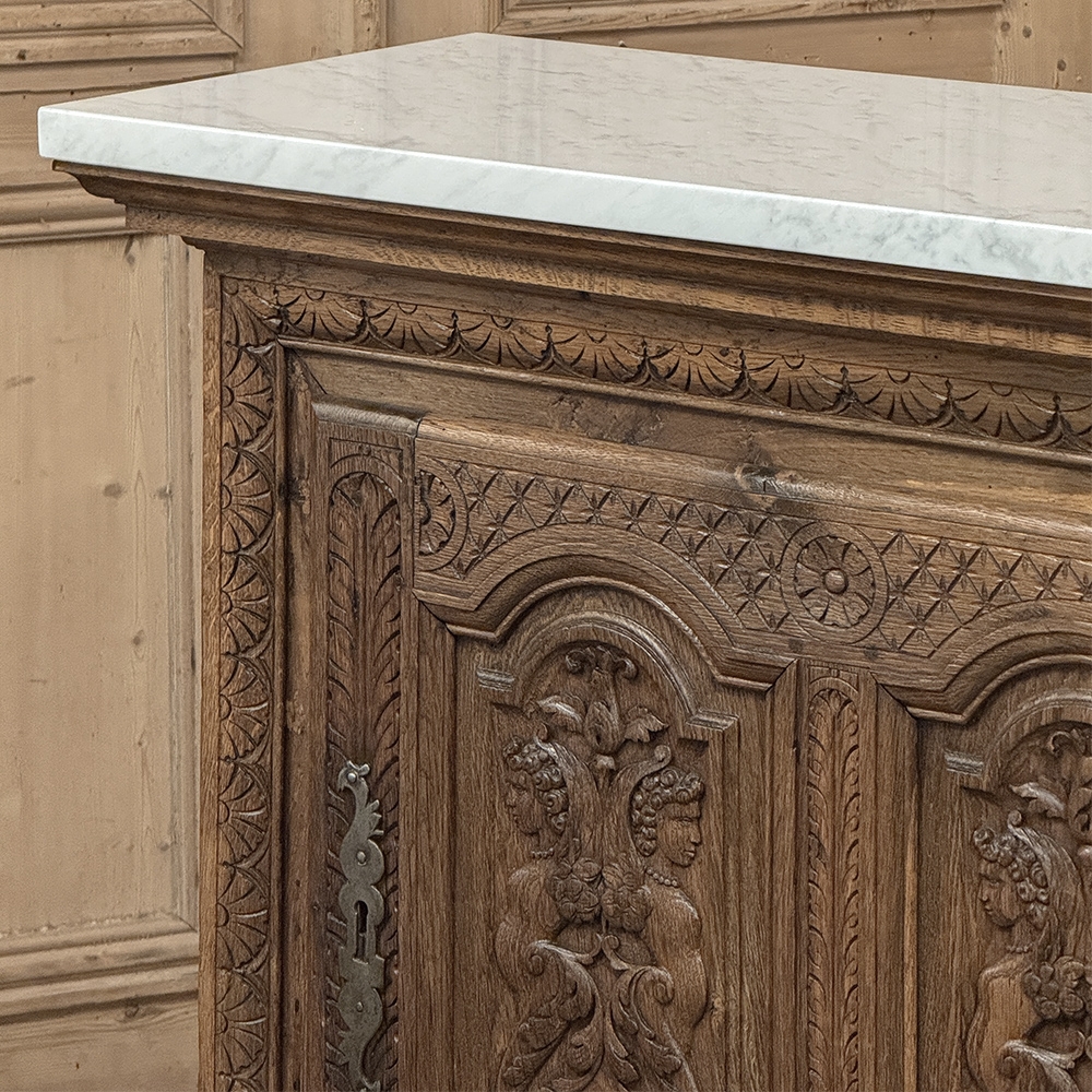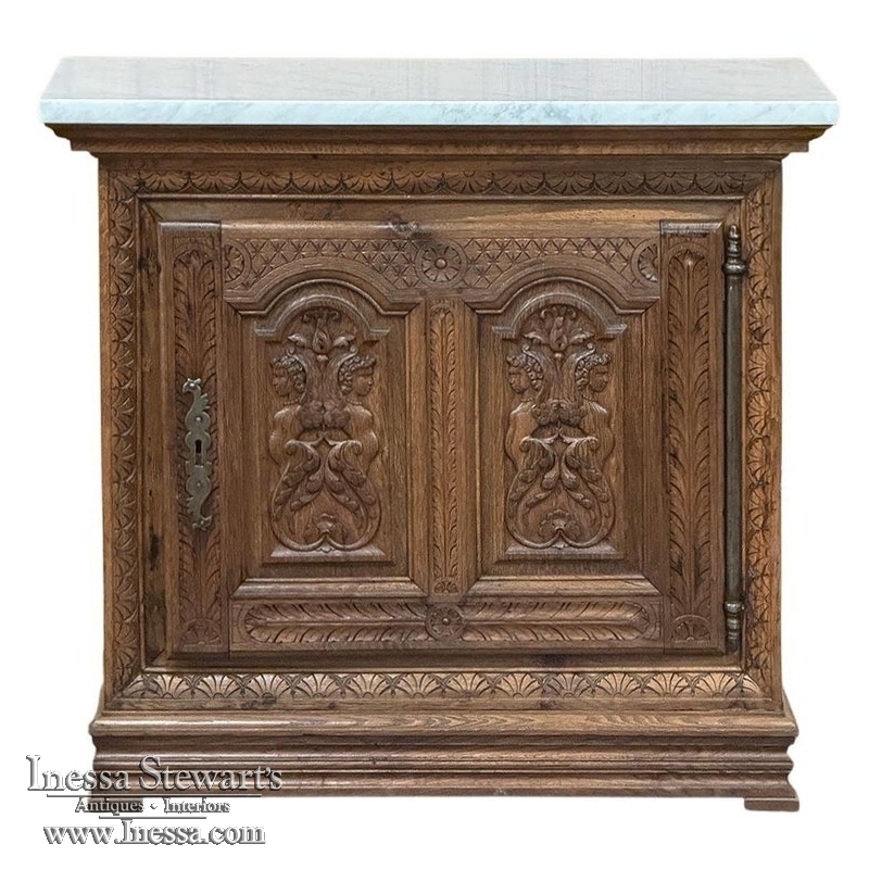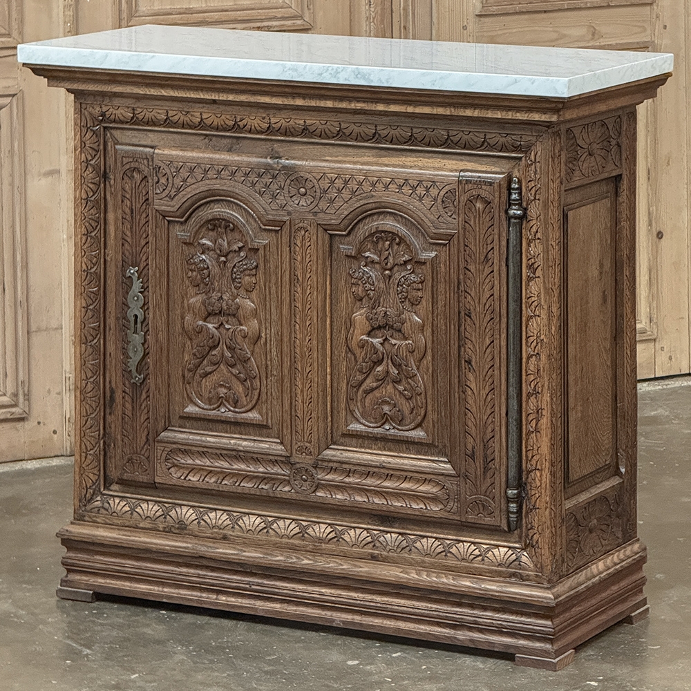 18th Century French Renaissance Cabinet with Carrara Marble will make a great addition to any efficient floor plan! Crafted from solid old-growth chestnut, it features a neoclassical architecture enhanced with lavish hand-carved detail on all facades, including a plethora of motifs such as rosettes on the sides, shell bordering across the front and arched raised panels on the door that are enhanced with fletching and cross hatching, depicting angels and foliates in a celebration of the creation. A full length barrel hinge and fanciful steel key guard provide the finishing touch. Door opens wide to reveal a nice bit of storage which only adds to the allure, while the luxurious Carrara marble top is perfect for carefree use with timeless beauty.