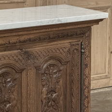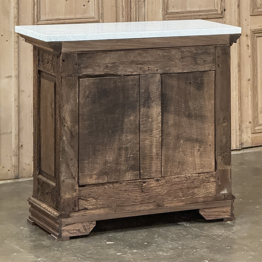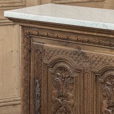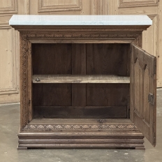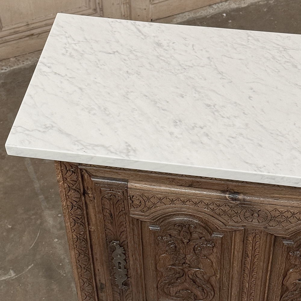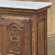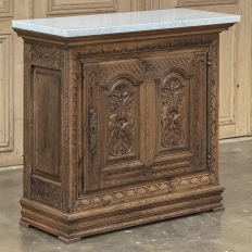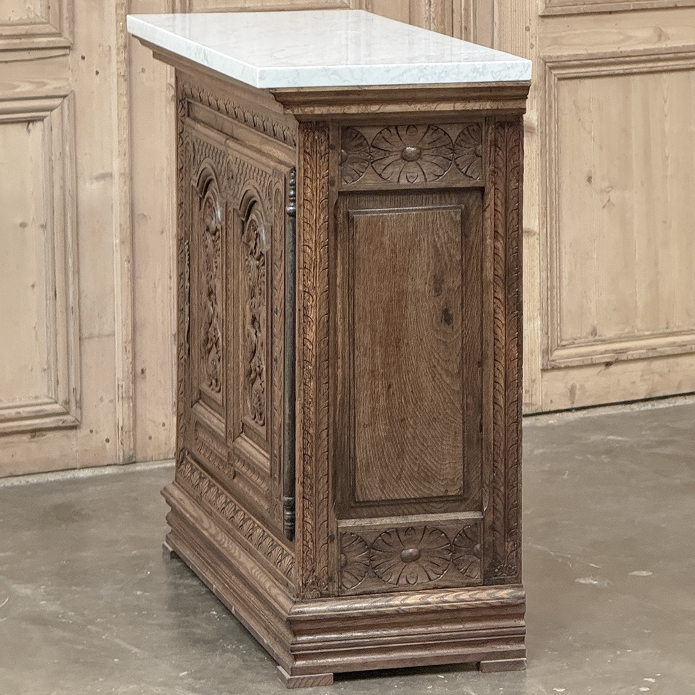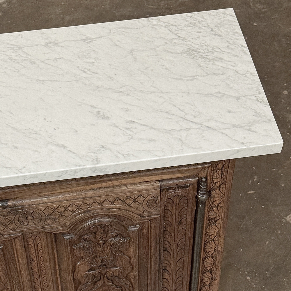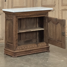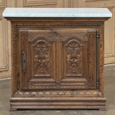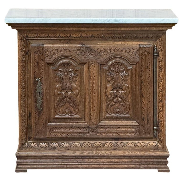 18th Century French Renaissance Cabinet with Carrara Marble will make a great addition to any efficient floor plan! Crafted from solid old-growth chestnut, it features a neoclassical architecture enhanced with lavish hand-carved detail on all facades, including a plethora of motifs such as rosettes on the sides, shell bordering across the front and arched raised panels on the door that are enhanced with fletching and cross hatching, depicting angels and foliates in a celebration of the creation. A full length barrel hinge and fanciful steel key guard provide the finishing touch. Door opens wide to reveal a nice bit of storage which only adds to the allure, while the luxurious Carrara marble top is perfect for carefree use with timeless beauty.