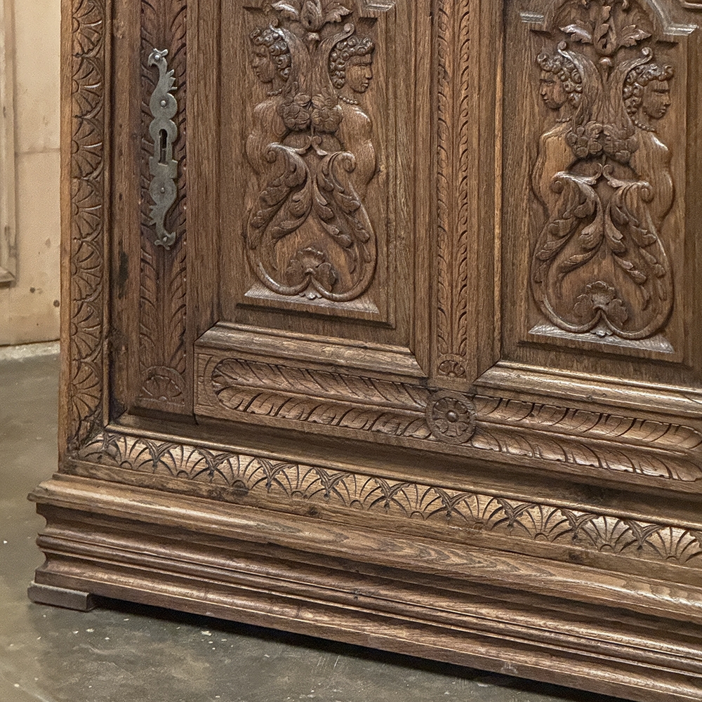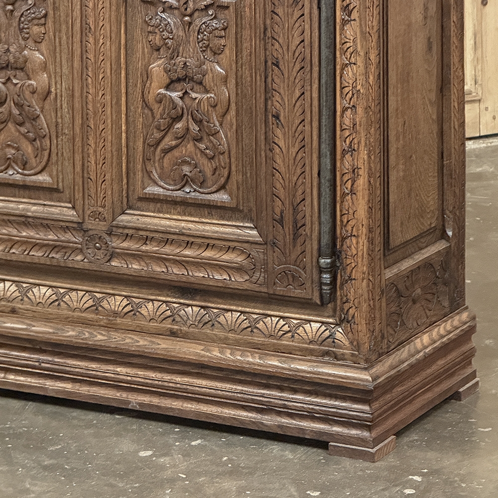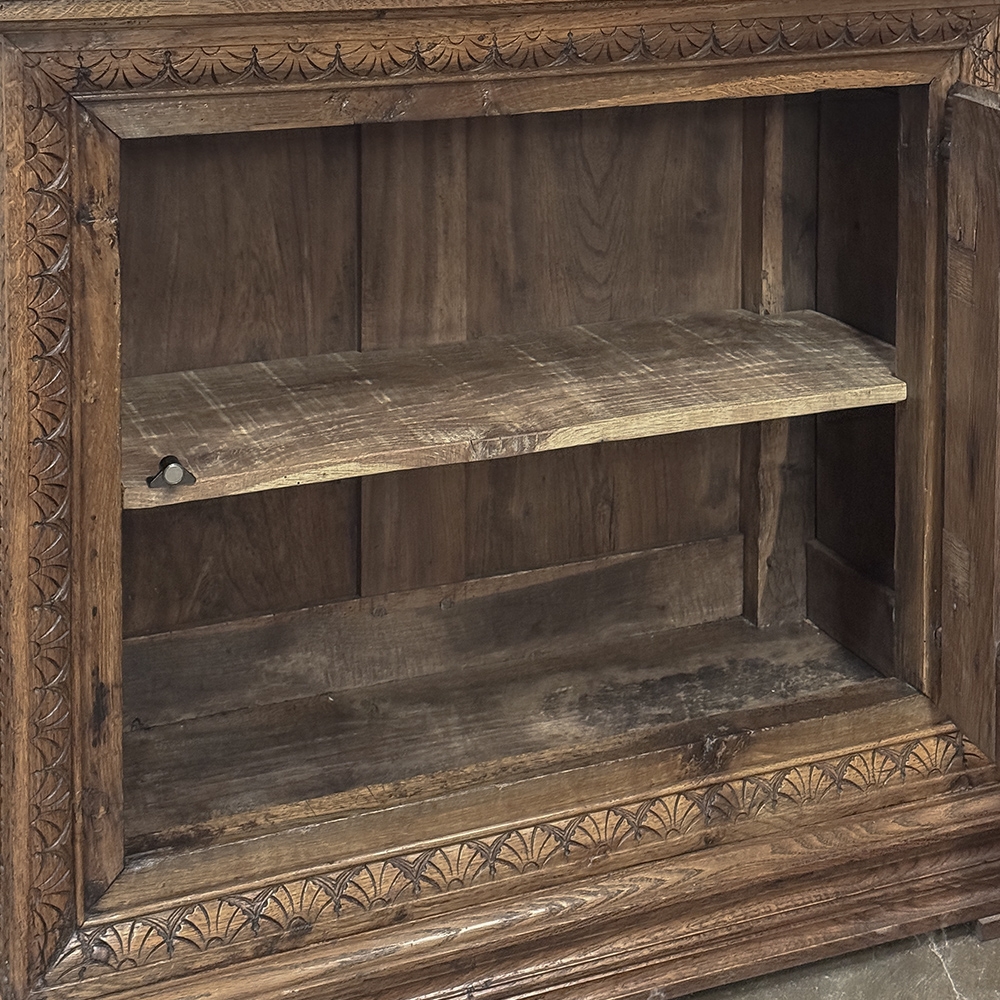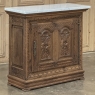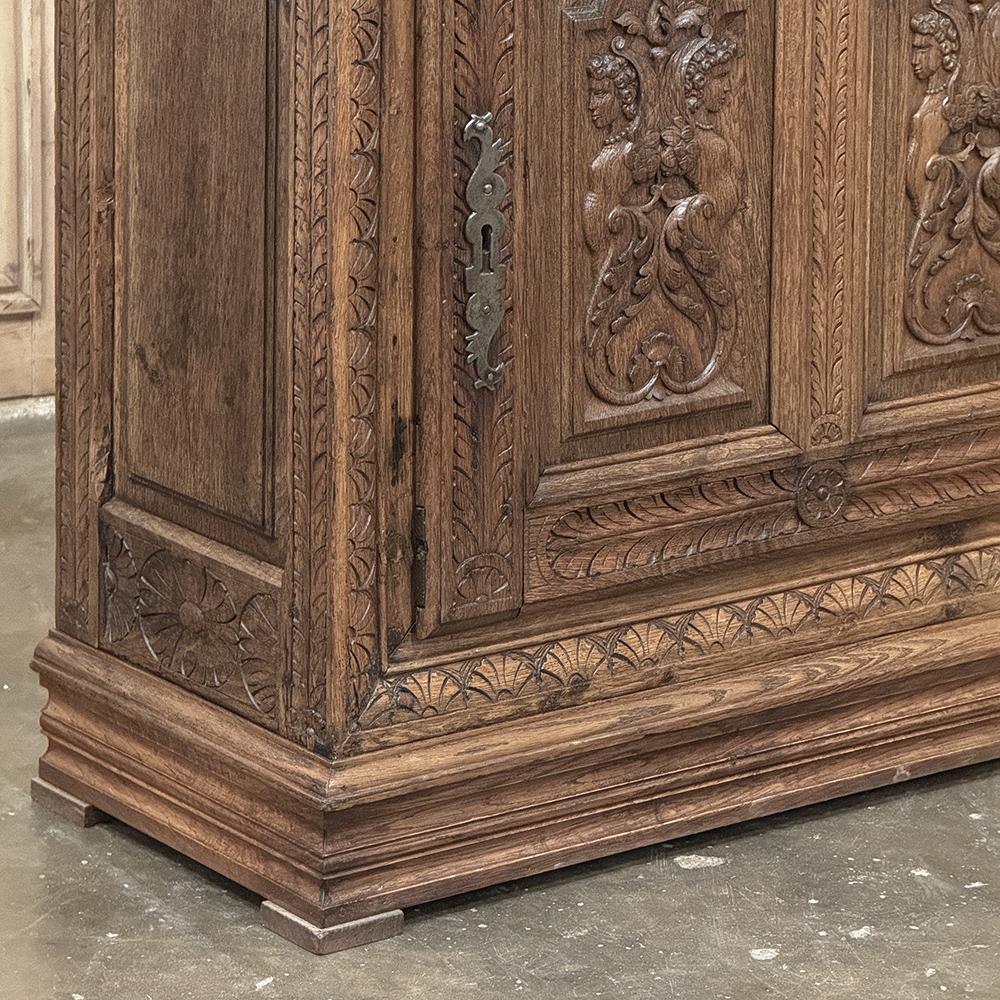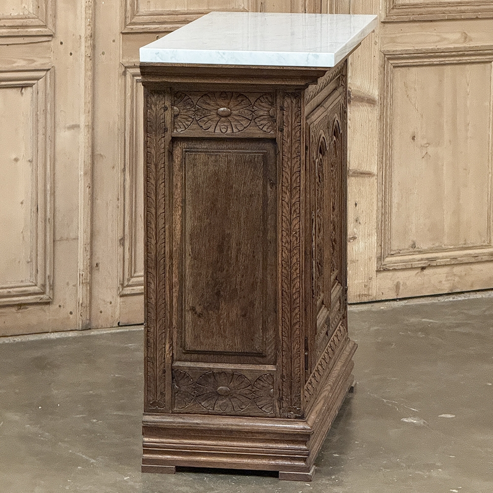 18th Century French Renaissance Cabinet with Carrara Marble will make a great addition to any efficient floor plan! Crafted from solid old-growth chestnut, it features a neoclassical architecture enhanced with lavish hand-carved detail on all facades, including a plethora of motifs such as rosettes on the sides, shell bordering across the front and arched raised panels on the door that are enhanced with fletching and cross hatching, depicting angels and foliates in a celebration of the creation. A full length barrel hinge and fanciful steel key guard provide the finishing touch. Door opens wide to reveal a nice bit of storage which only adds to the allure, while the luxurious Carrara marble top is perfect for carefree use with timeless beauty.