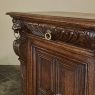 Sale19th Century Flemish Renaissance Buffet was hand-crafted from solid oak, and features the unique molding designs of the region, creating a diamond shaped centerpiece on the cabinet doors into which a full relief carving of a lion's head has been placed. Lions' heads also appear atop the corners, presiding over a bold corbel and carved pilasters. Stylized egg & dart envelope the entire upper tier, with two drawers accessed by cast bronze ring pulls. Greek coin overlay adorns the center stile, with a different version of the same motif horizontally across the base just above the boldly molded baseboard supported by bun feet. Cabinet doors and drawers open to reveal abundant storage, making this as functional as it is a timeless piece of architecture!