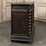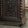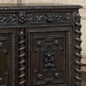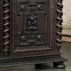 19th Century Flemish Renaissance Buffet ~ Credenza is a remarkable work celebrating the splendor of the Renaissance Revival from top to bottom! The boldly gadrooned top edge frames the solid plank top, and overlooks the drawer tier which is amazingly detailed with fully laden grapevines and lions' heads serving as drawer pulls. The drawers are separated by a boldy carved rosette which appears over the center stile carved as a half-barley twist column with turned finial cap & base. The same column motifs also appear on each corner, linking the top tier to the elaborate two-tiered base supported by bun feet. The cabinet doors in between, however, are the most visually stimulating with boldly framed geometric forms accented with turned button rosettes and centered with massive carved rectangular rosettes in an acanthus plume motif. Drawers and doors open to reveal capacious storage, only adding to the allure.