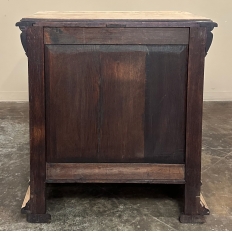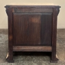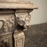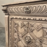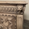 19th Century Flemish Renaissance Confiturier ~ Cabinet in stripped oak is an excellent choice for a cozy niche, narrow wall space, or corner of the room that needs a little surface, a little storage, and a lot of Old World charm! Hand-carved from solid oak, it features a fully carved top tier from wall to wall with elongated egg motif enhanced with acanthus flourishes, that includes a full width drawer fitted with a finely cast bronze bale pull. Below is an intricately designed geometric molding design that is centered with a lion's head in full relief, matching the lions heads that appear atop the cornerposts which are tapered, carved with Greek coin overlay, and finished with lion's paw feet. The base consists of multiple tiers of bold molding including a fishscale panel that is eye-catching. Door and drawer both open to reveal surprising storage, making this as useful as it is interesting!