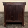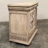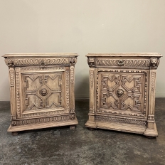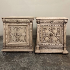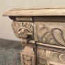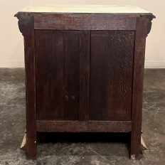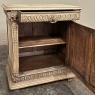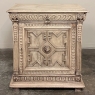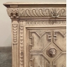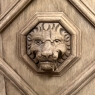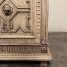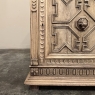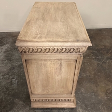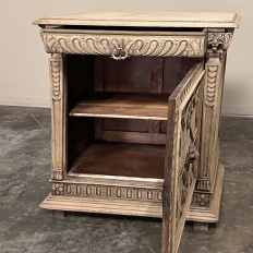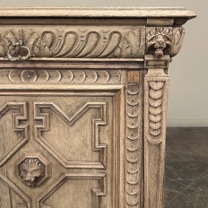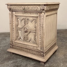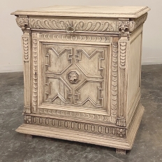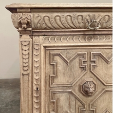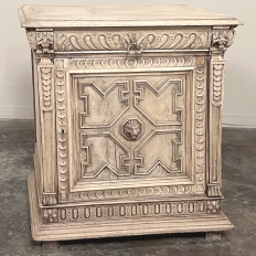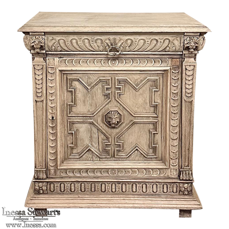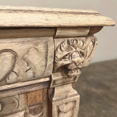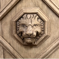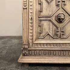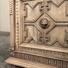 19th Century Flemish Renaissance Confiturier ~ Cabinet in Stripped Oak hails from the Antwerp region, and exhibits the definitive combination of geometric forms with Renaissance-inspired carved detail set with the constraints of neoclassical architecture. The surprisingly spacious beveled top rests on the upper drawer tier which is defined by a carved drawer facade centered with a cast bronze bale pull and flanked by a pair of smiling lions situated as corbels on each corner. Tapered and carved pilasters extend down beneath each lion to form the framework for the intriguing cabinet door design, which features the trademark geometric molding design popular in the region, surrounded by Greek coin bordering and centered with a full relief carving of a lion's head. The base is a complex combination of elongated egg with rosettes and a bold base molding wrapping around the entire casework. Door and drawer both open to reveal spacious storage. Ideal as a bathroom sink vanity!