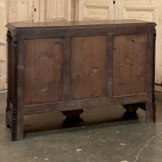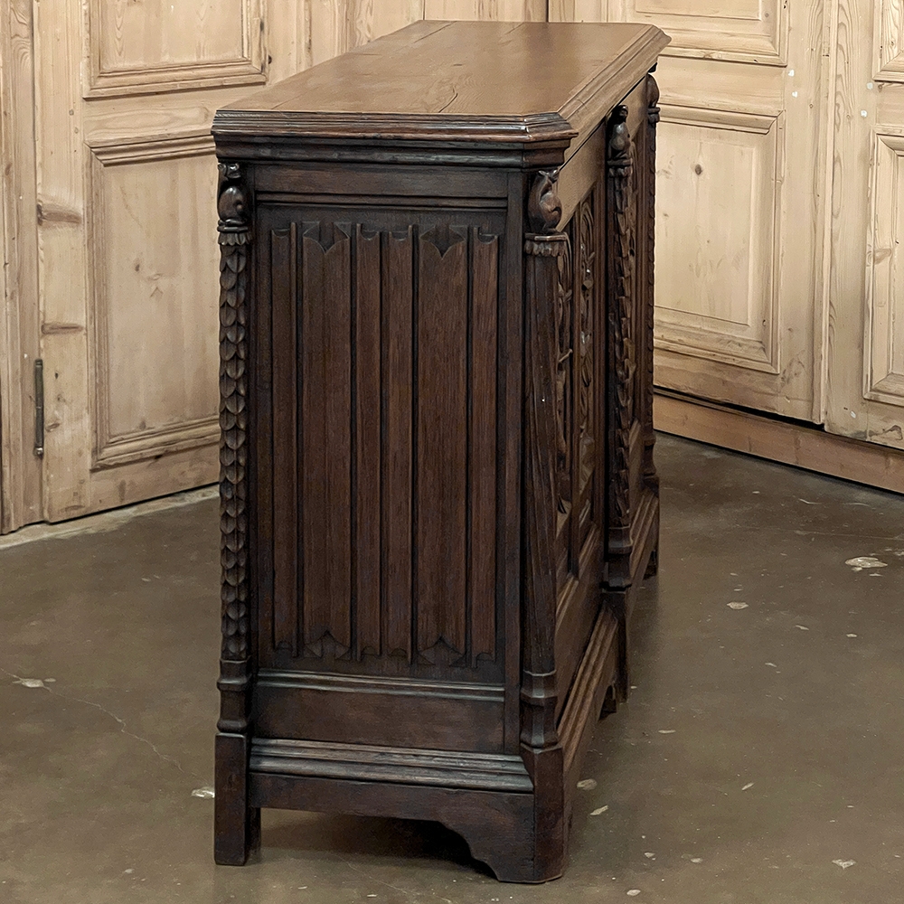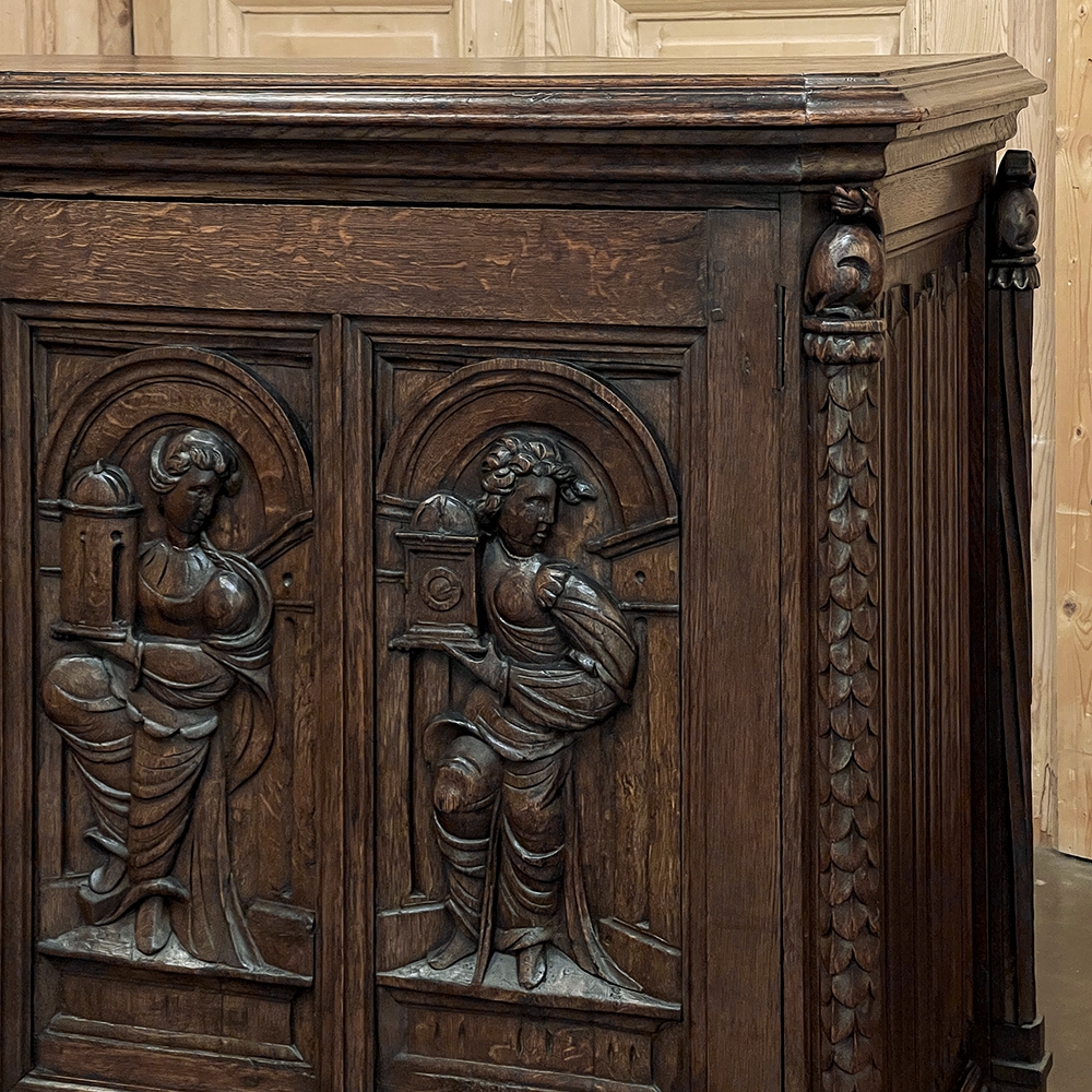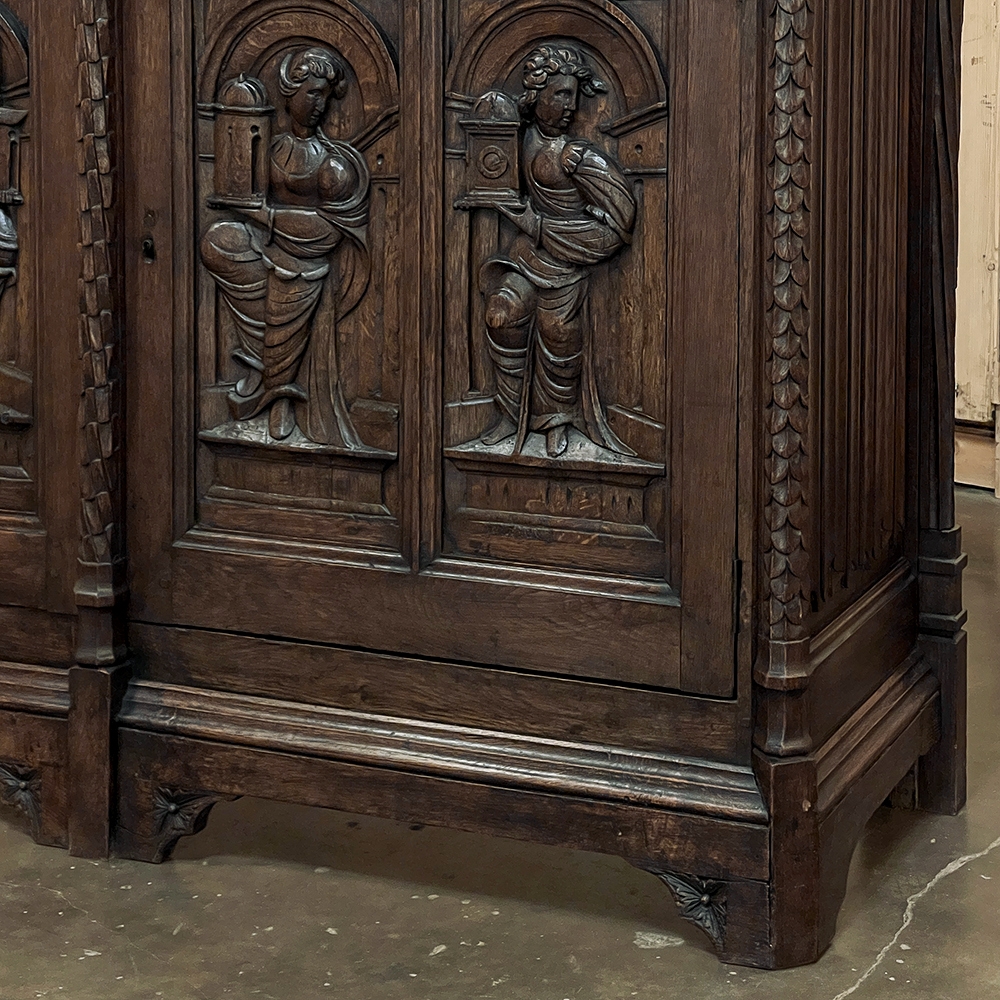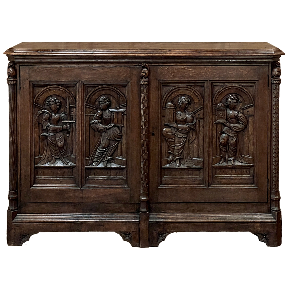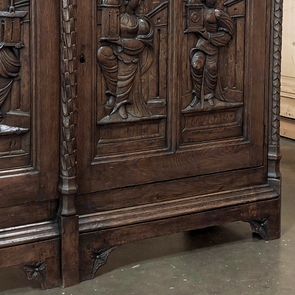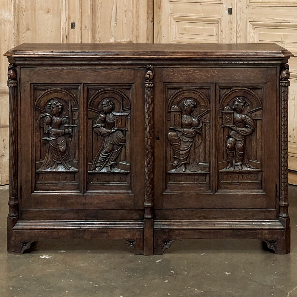 19th Century French Gothic Oak Buffet is a marvel of hand-worked craftsmanship and the sculptor's art, all in one piece! Rendered from old-growth oak, it features linenfold panels on each side, with mitered corners leading the eye to the central focal point of four sculpted relief works depicting what appears to be a knight and three architects or builders. The figures are each set in individual arched colonnades to produce perspective. The carvings are separated by a half column, and framed by columns on the cornerposts, and another pair on the back corners, each of which is different from its adjacent half-column. Rosettes appear on the geometrically designed apron below. Note the squared pegs in the mortise & tenon joints. Doors open wide for copious storage possibilities!