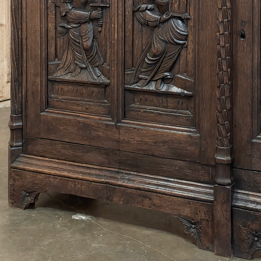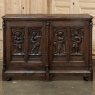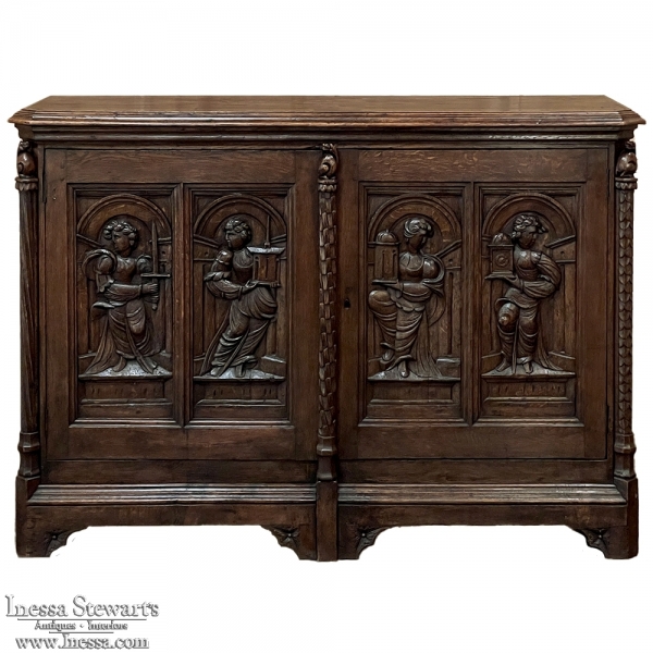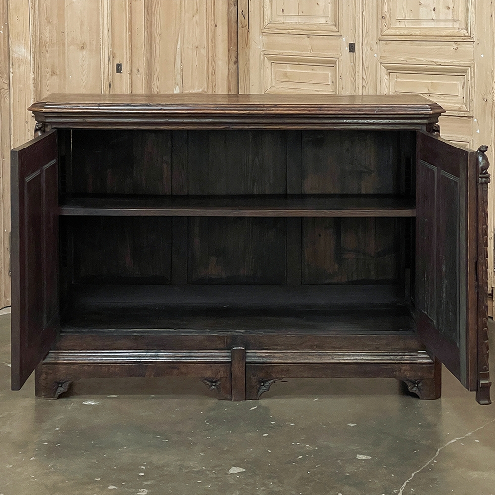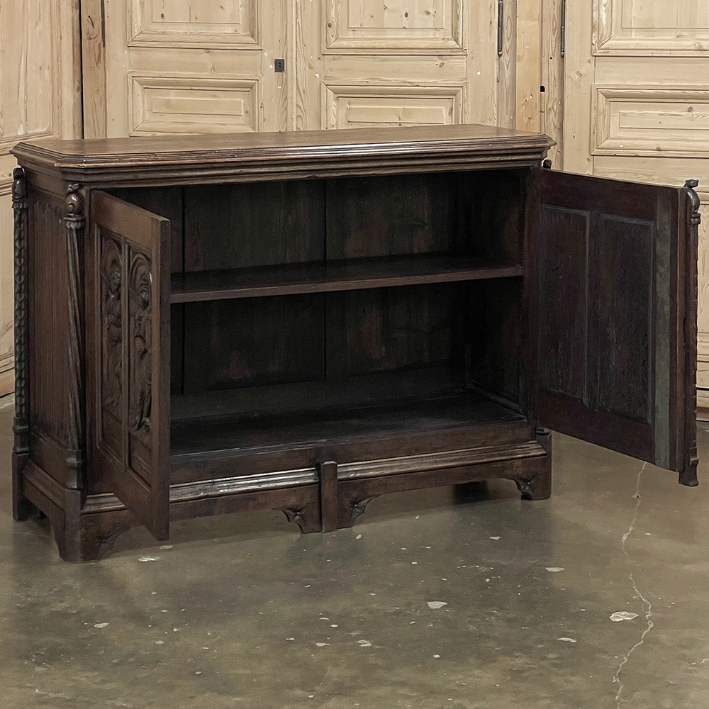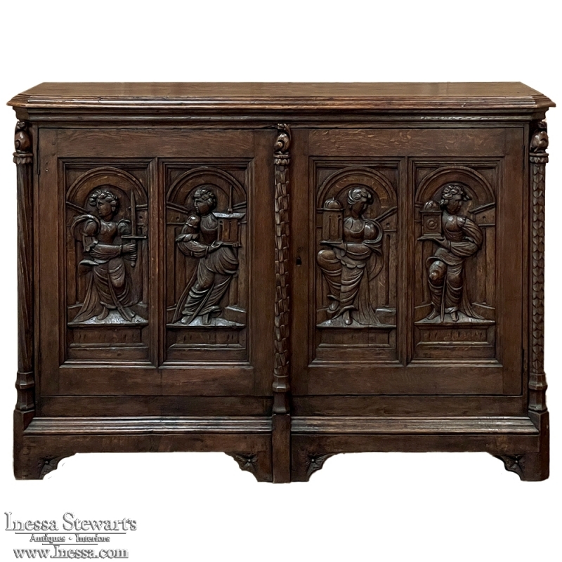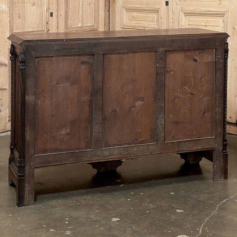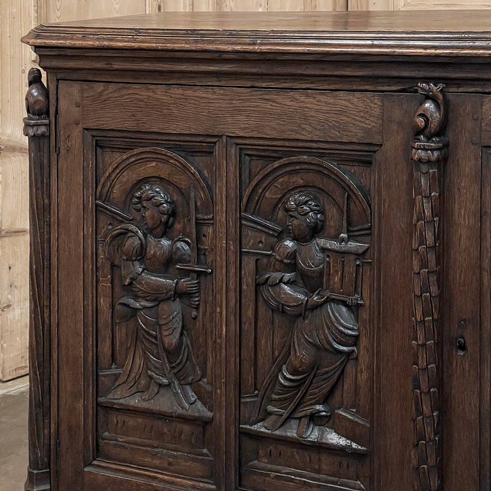 19th Century French Gothic Oak Buffet is a marvel of hand-worked craftsmanship and the sculptor's art, all in one piece! Rendered from old-growth oak, it features linenfold panels on each side, with mitered corners leading the eye to the central focal point of four sculpted relief works depicting what appears to be a knight and three architects or builders. The figures are each set in individual arched colonnades to produce perspective. The carvings are separated by a half column, and framed by columns on the cornerposts, and another pair on the back corners, each of which is different from its adjacent half-column. Rosettes appear on the geometrically designed apron below. Note the squared pegs in the mortise & tenon joints. Doors open wide for copious storage possibilities!