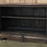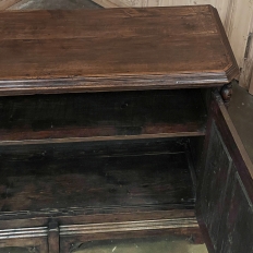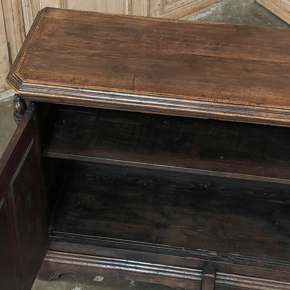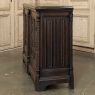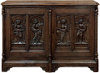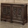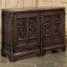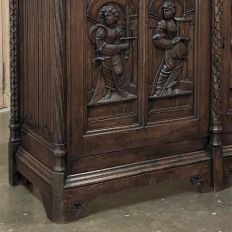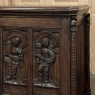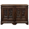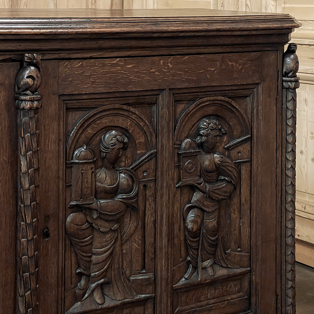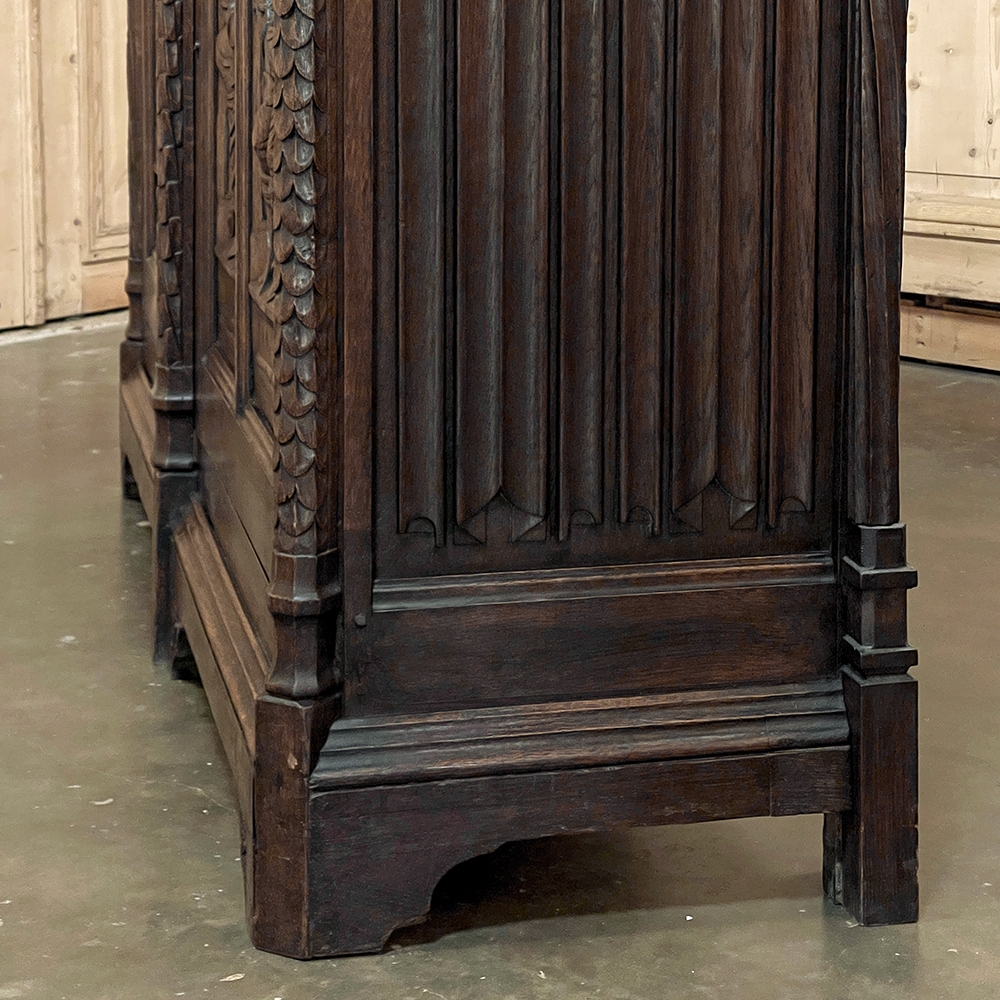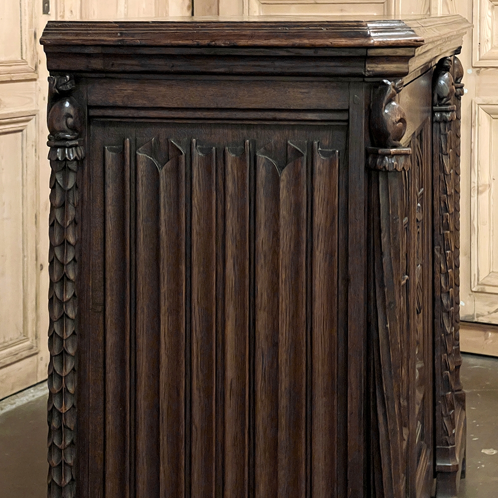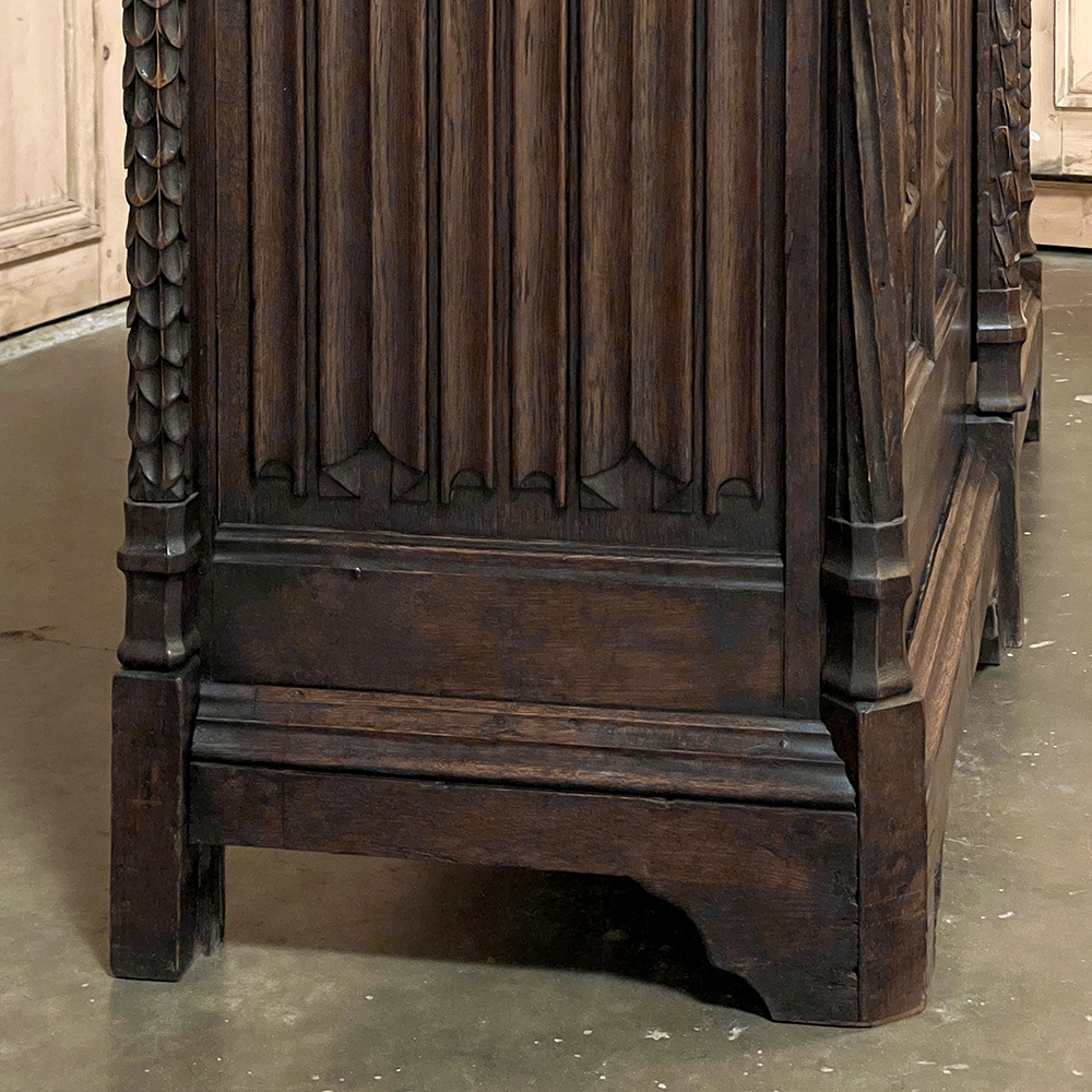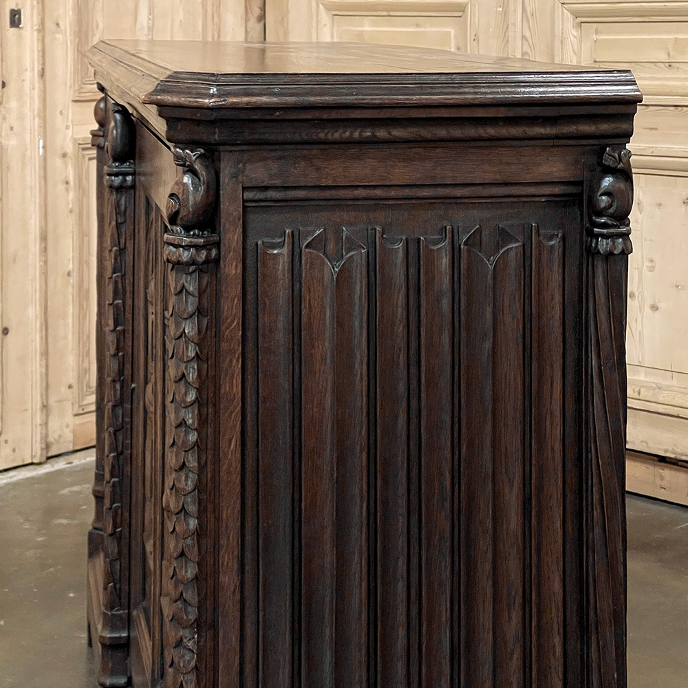 19th Century French Gothic Oak Buffet is a marvel of hand-worked craftsmanship and the sculptor's art, all in one piece! Rendered from old-growth oak, it features linenfold panels on each side, with mitered corners leading the eye to the central focal point of four sculpted relief works depicting what appears to be a knight and three architects or builders. The figures are each set in individual arched colonnades to produce perspective. The carvings are separated by a half column, and framed by columns on the cornerposts, and another pair on the back corners, each of which is different from its adjacent half-column. Rosettes appear on the geometrically designed apron below. Note the squared pegs in the mortise & tenon joints. Doors open wide for copious storage possibilities!