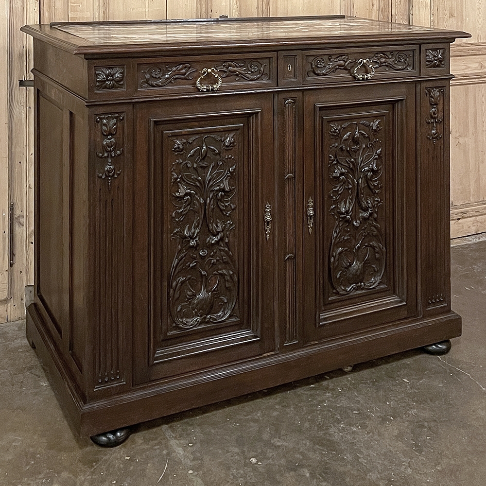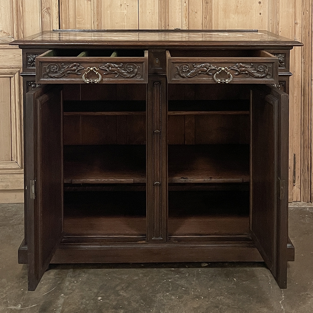 Substantial yet refined, this piece offers the balance of beauty and utility that has kept French Renaissance Revival furniture so desirable. The drawers and cabinet doors open to reveal generous storage, making it a practical choice as well as a decorative one.