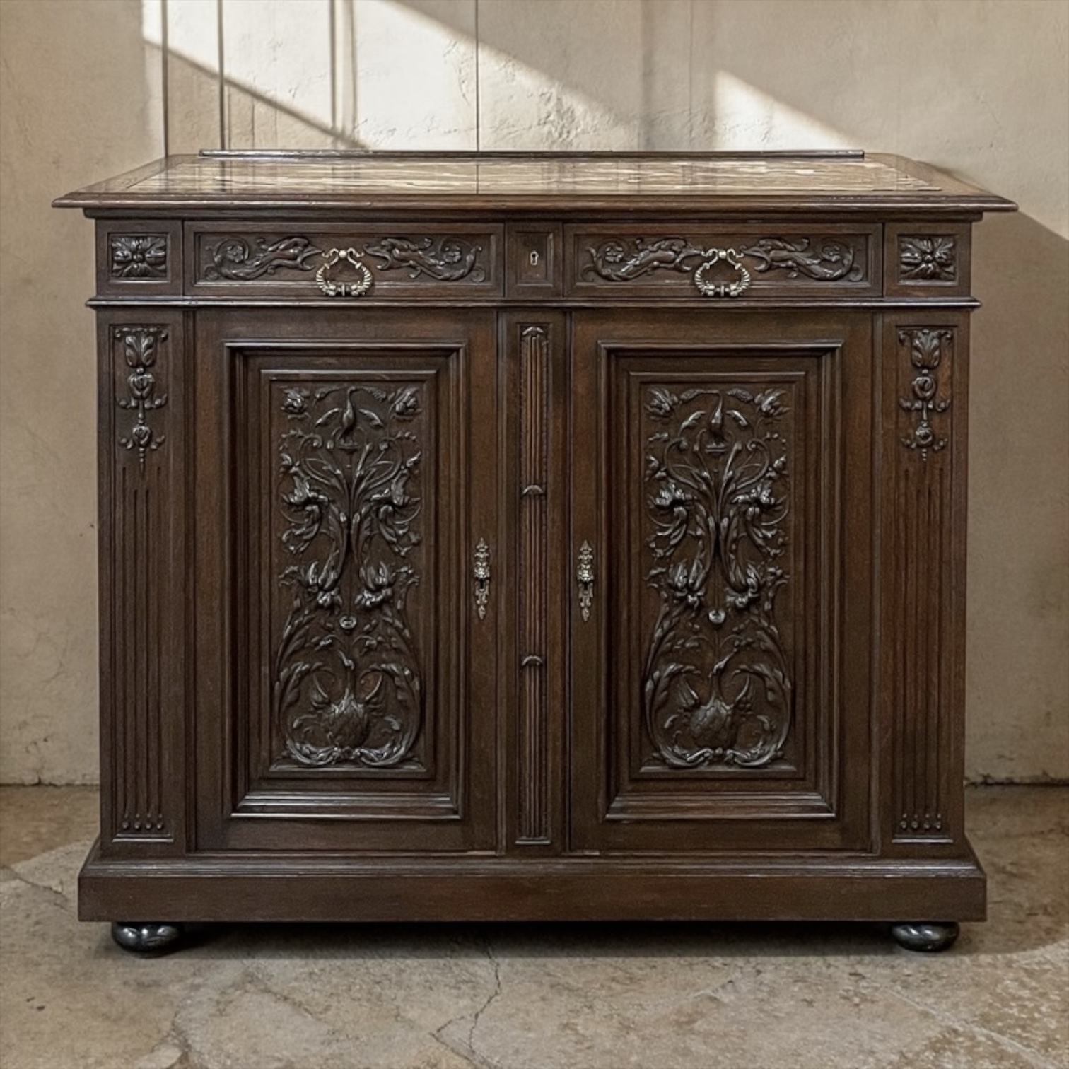 This buffet captures that spirit beautifully. Its stately form is crowned with an inset rouge marble top, creating an elegant and durable surface for serving or display. The façade is richly detailed with carved pilasters, rosettes, paneled doors, and drawer fronts adorned with scrolling ornament and bronze hardware. The deeply carved door panels are especially striking, featuring bold Renaissance-inspired motifs with scrolling foliage and naturalistic forms executed in strong relief.
