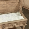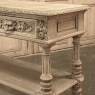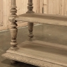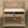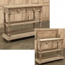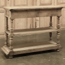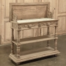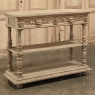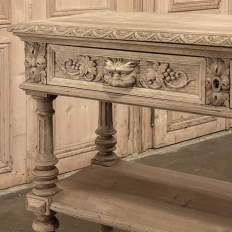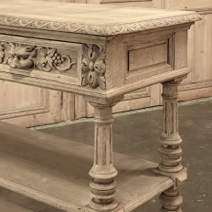 19th Century French Renaissance Flip-Top Dessert Buffet in Stripped Oak is a remarkable variant of the serving buffet attributed to the French. Long ago marble atop a piece of furniture was considered less than stylish, so this clever design hid a marble top serving surface ~ perfect for serving cheeses and desserts as the stone keeps such items cooler ~ underneath a solid plank oak top with giadrooned edge that matches the remainder of the furniture, and is hinged in the back to open up trunk-like and to be held in place by clever swing-out side supports. Under the marble appears a brace of flatware and linen drawers, each lavished with full relief carvings of lions' heads which also double as drawer pulls, each flanked by fully laden grapevines and boldly carved rosettes. Turned, tapered and fluted columns support the drawer tier and define the middle shelf, fitted with pyramidal accents on each corner, and underneath each appears four more columns turned and carved into urn forms which are based on the lower shelf that is surrounded by two tiers of bold molding detail, the latter of which sports a carved repeating acanthus leaf pattern. An excellent choice for a compact yet stylish dry bar, as well!