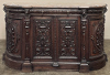 19th Century French Renaissance Marble Top Buffet will make a great presence in any room!  The rounded side design is very traffic-friendly, so even though the maximum depth is almost 2 feet, it seems like a smaller piece.  Topped with beveled marble that follows the case contours, it makes for carefree entertaining, display and even serving food and drink.  Under the marble is the drawer tier, with two rounded drawers on each side and two full-size between them, each carved with a foliate facade and fitted with cast brass pendant pulls.  The rounded drawers are separated from the center drawers by a full-relief carved lion's head which also appears over a brace of carved pilasters which in turn provide a framework for the two center cabinet doors.  Each has been lavished with relief carvings of a neoclassical nature yet with obvious Renaissance style cues.  The cabinets on the sides are rounded, of course, and feature interesting oval frameworks surrounding the carvings which appear as fanciful heraldic shields, also carved with a Renaissance flair while still possessing neoclassical character.  All four drawers and doors open to reveal capacious storage.  Bold, multi-tiered base molding completes the look.